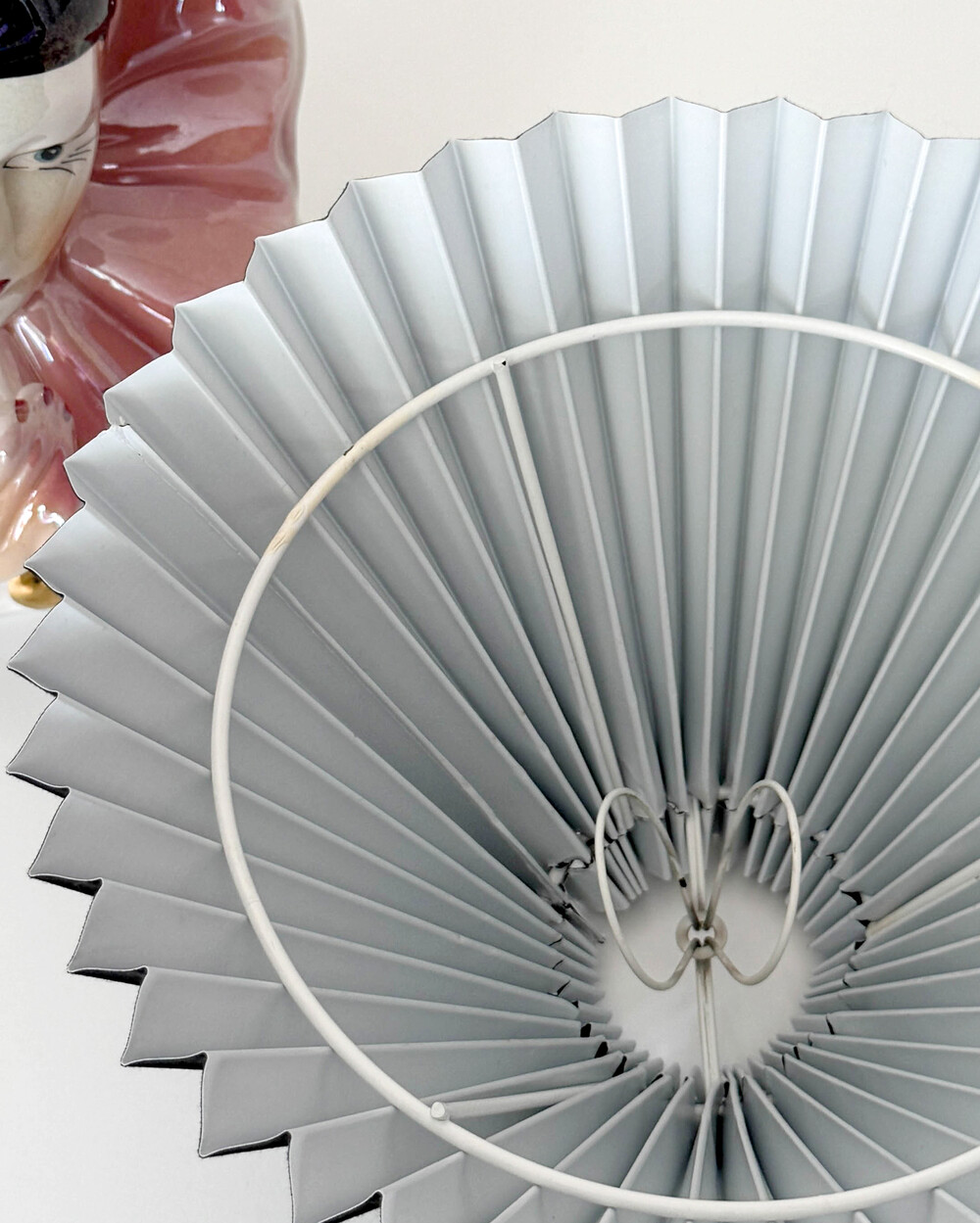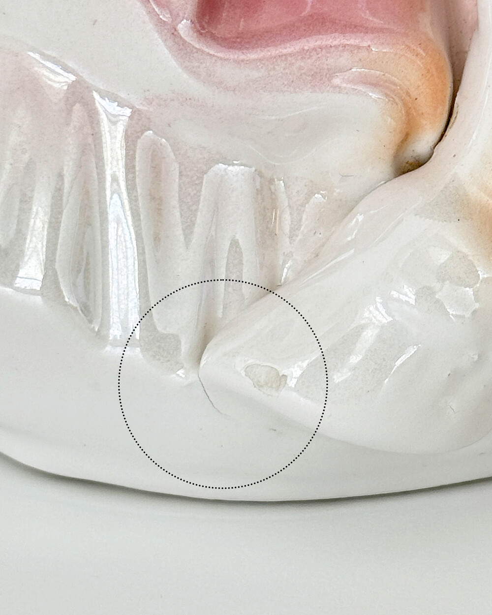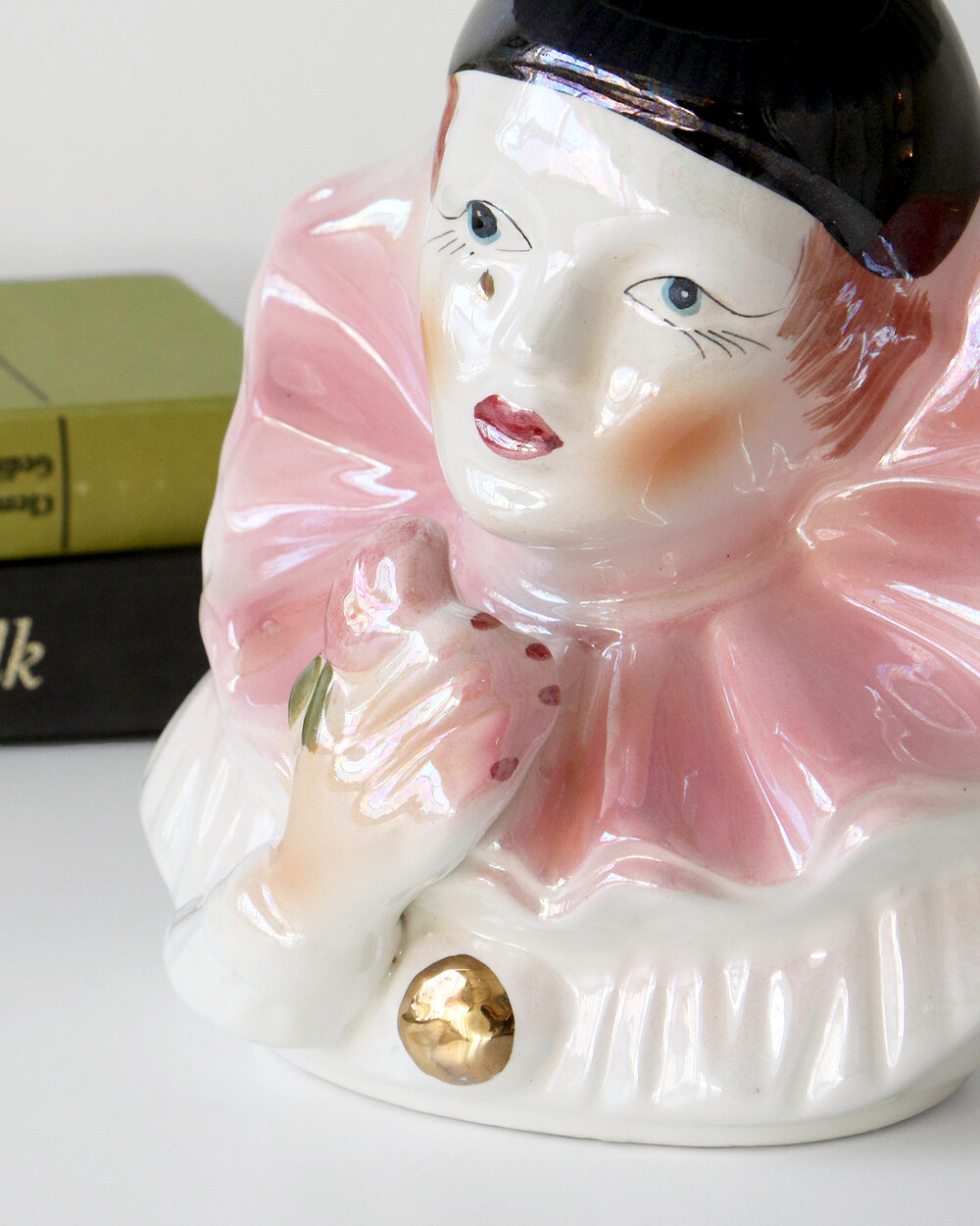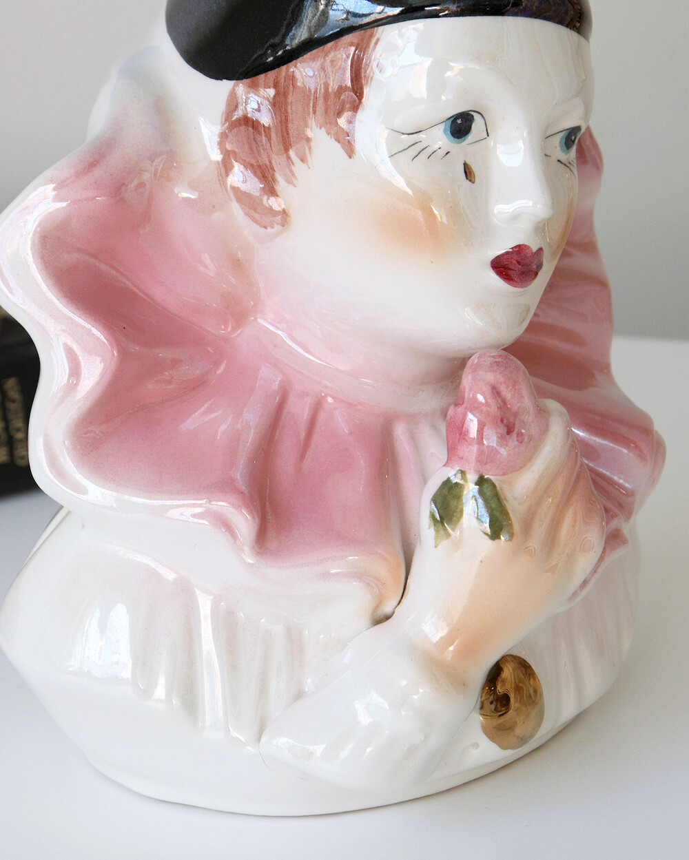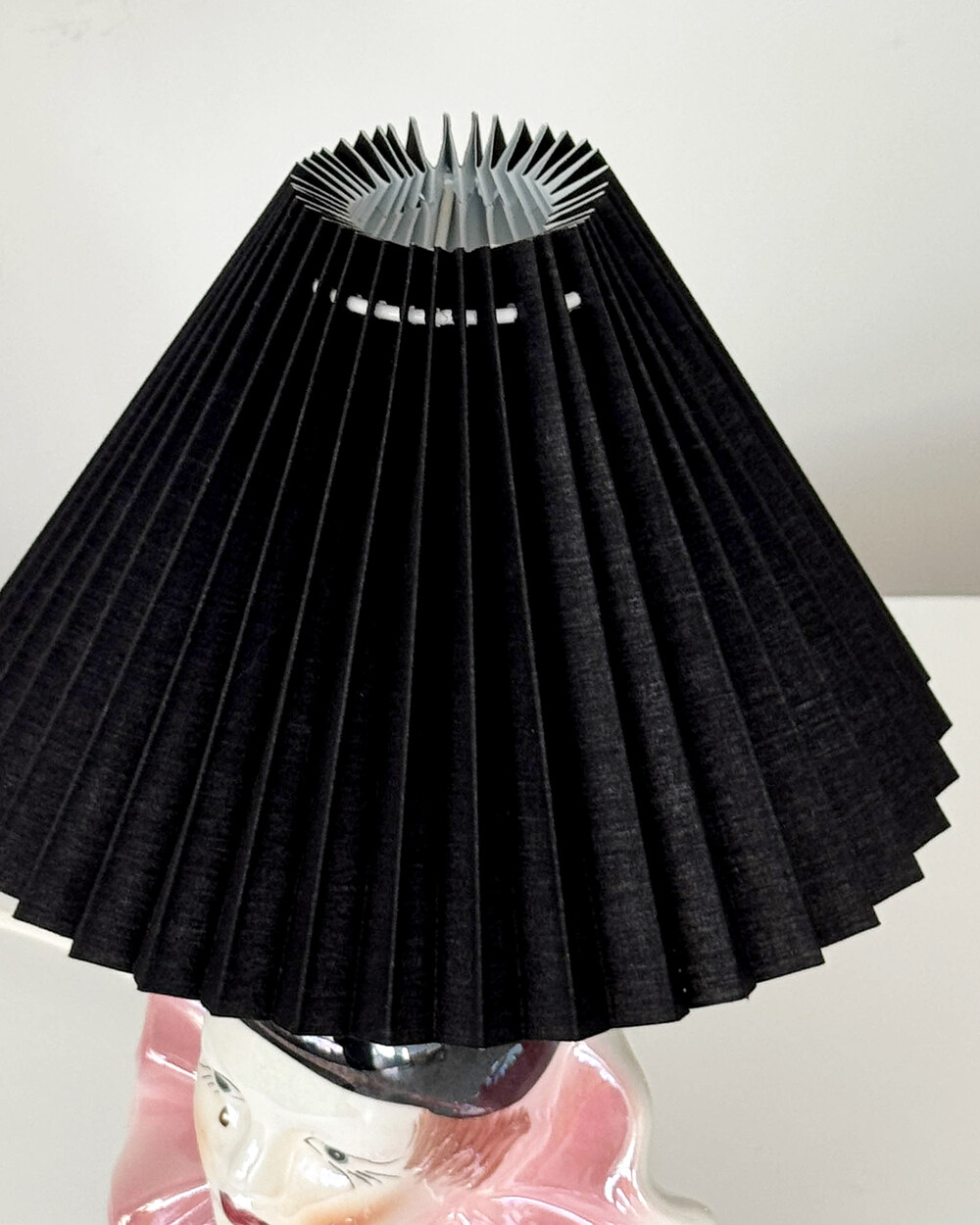 핑크 톤의 러플 칼라와 섬세하게 표현된 얼굴과 손 디테일, 골드 컬러 포인트가 어우러진 삐에로 테이블 조명입니다. 광택감이 뛰어난 세라믹 베이스와 블랙 플리츠 패브릭 셰이드가 대비를 이루며, 점등 시에는 빛이 부드럽게 퍼져 삐에로의 표정이 자연스럽게 드러납니다. 독일에서 제작된 1980년대 빈티지 조명으로, 공간에 위트를 더해줄 키치한 매력의 아트 오브제입니다.