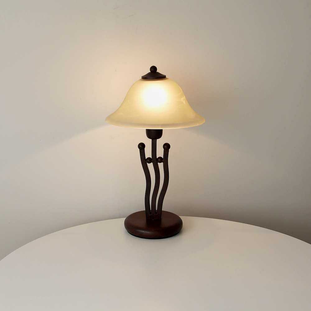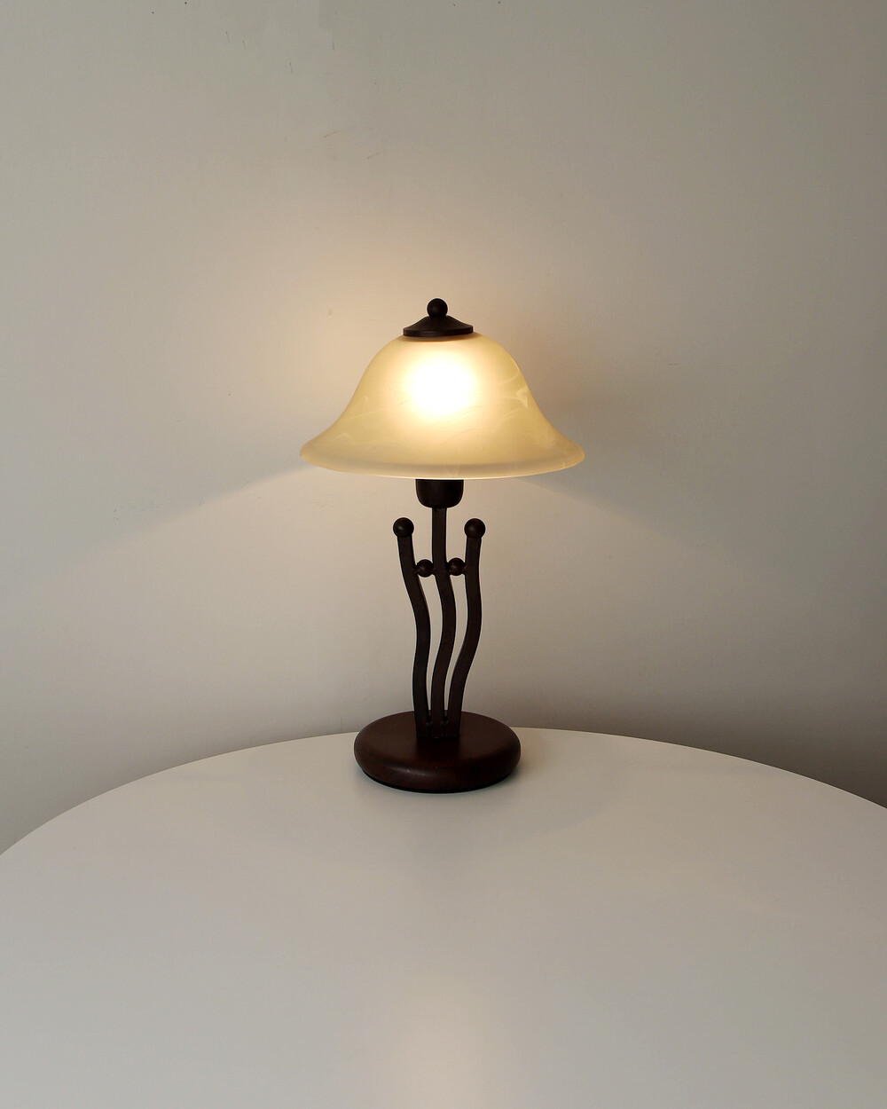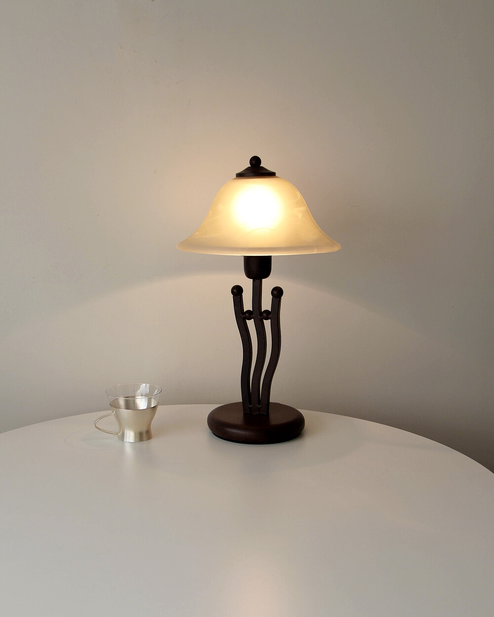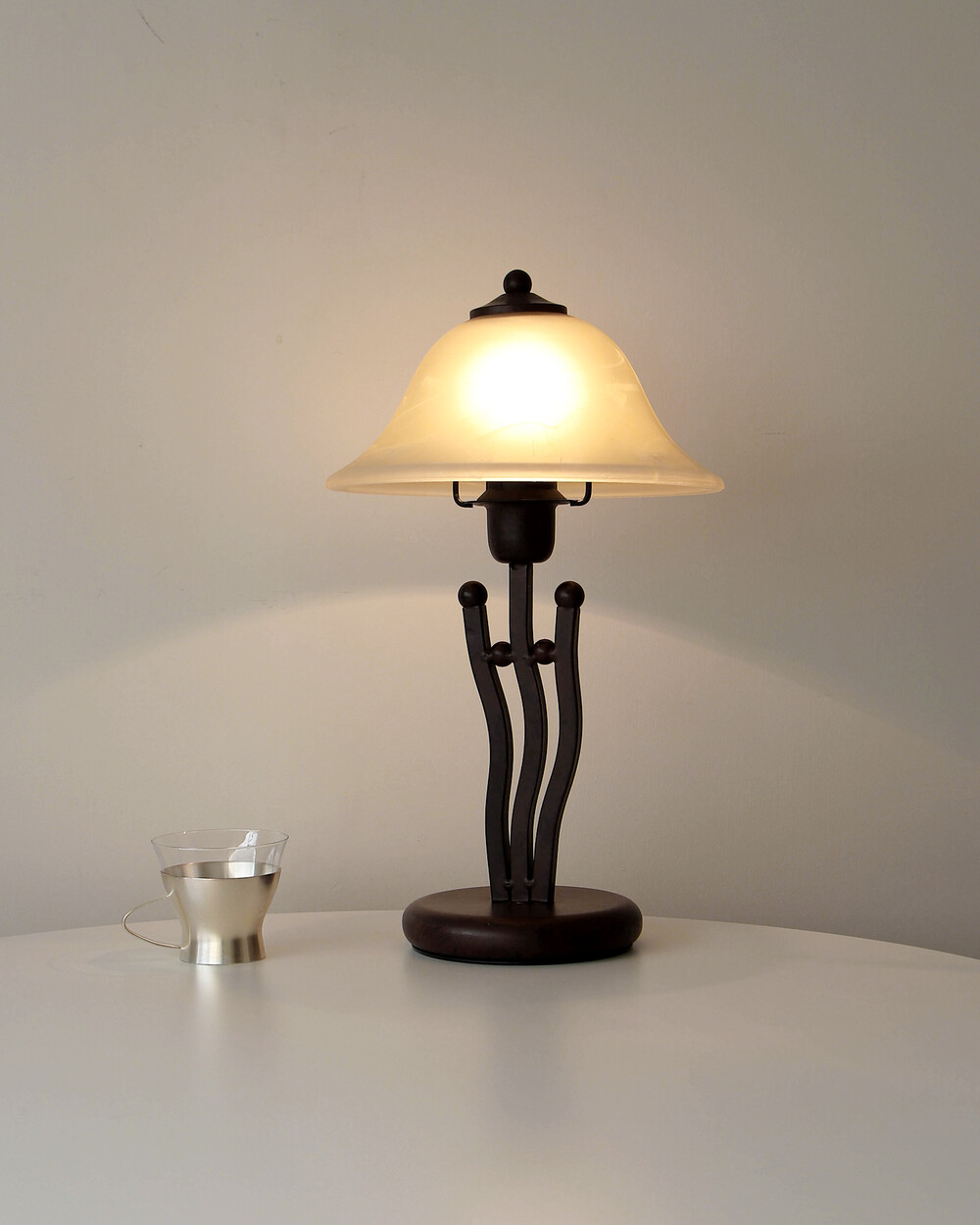 유기적인 곡선 실루엣의 메탈 베이스와 따뜻한 옐로우 베이지 톤의 프로스트 글라스 셰이드로 이루어진 테이블 램프입니다.