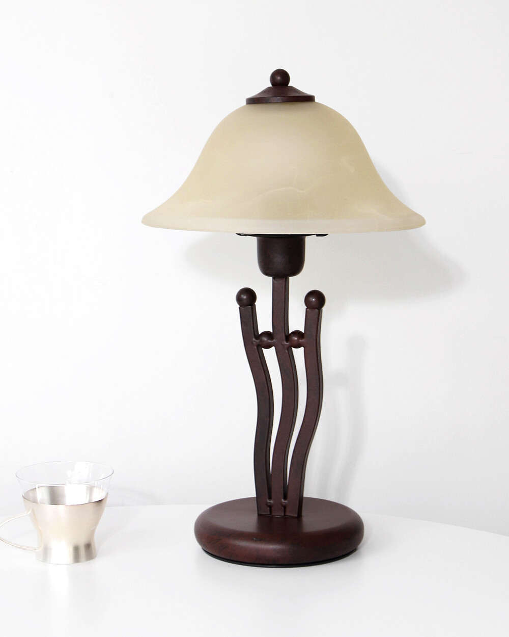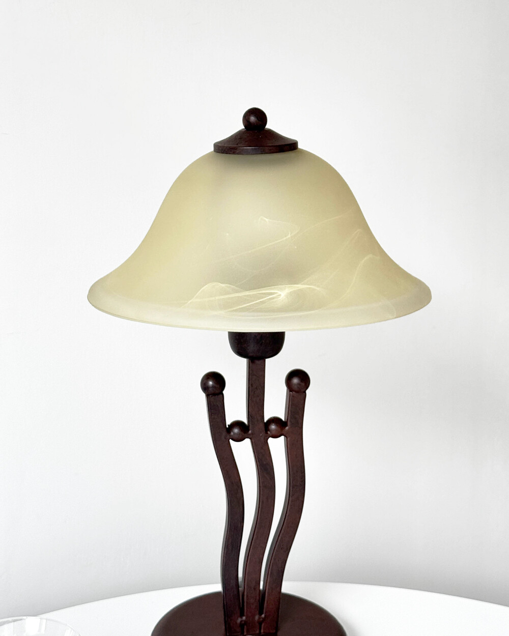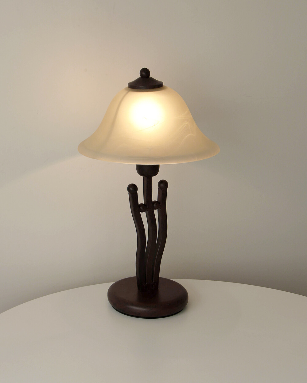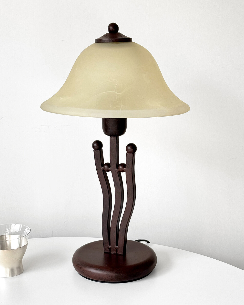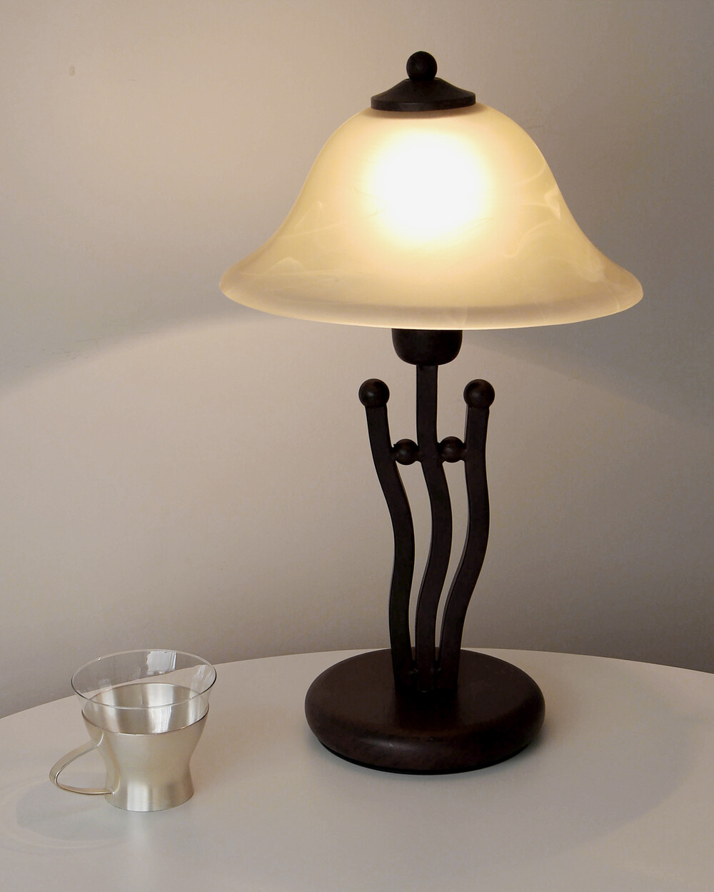 유기적인 곡선 실루엣의 메탈 베이스와 따뜻한 옐로우 베이지 톤의 프로스트 글라스 셰이드로 이루어진 테이블 램프입니다.