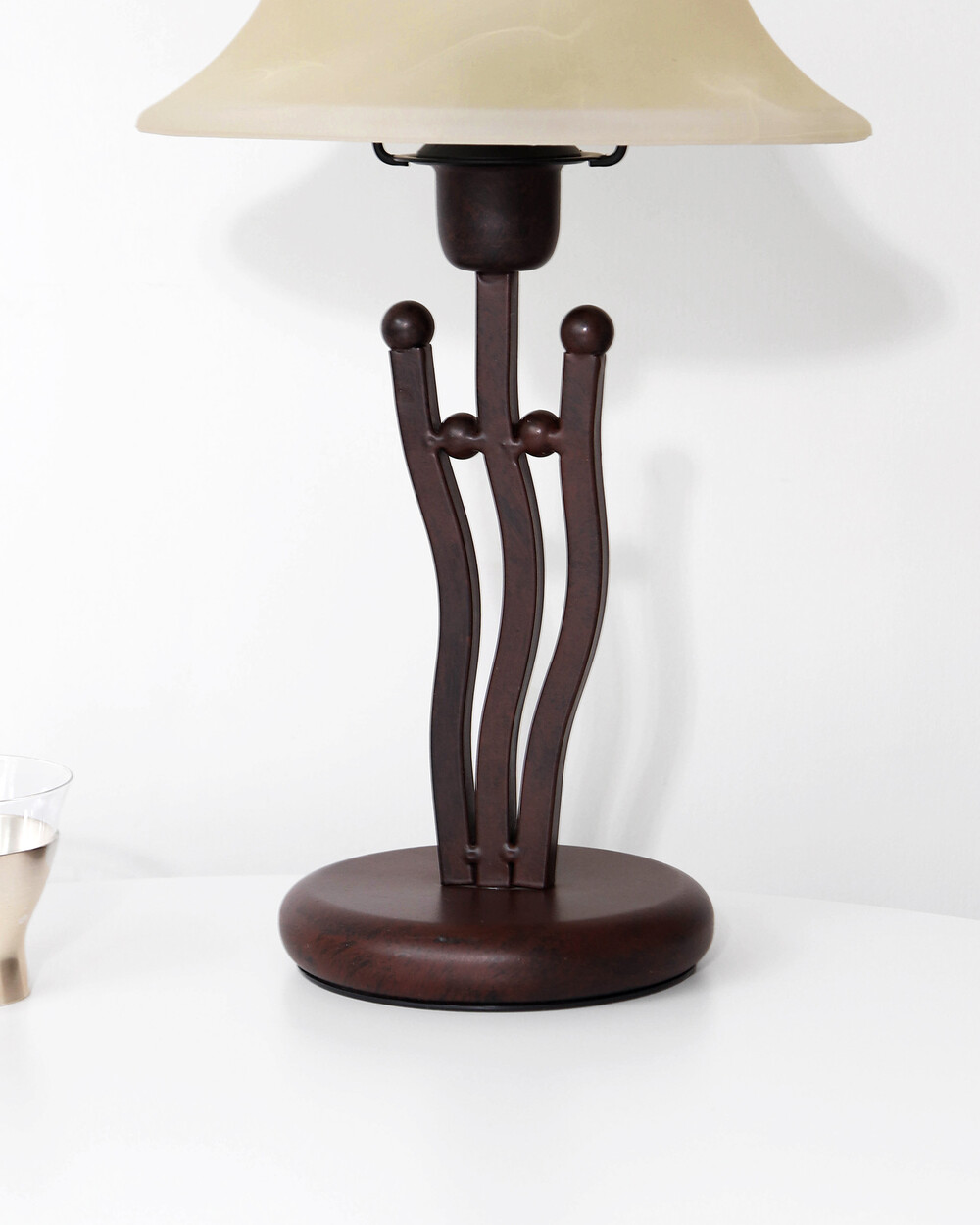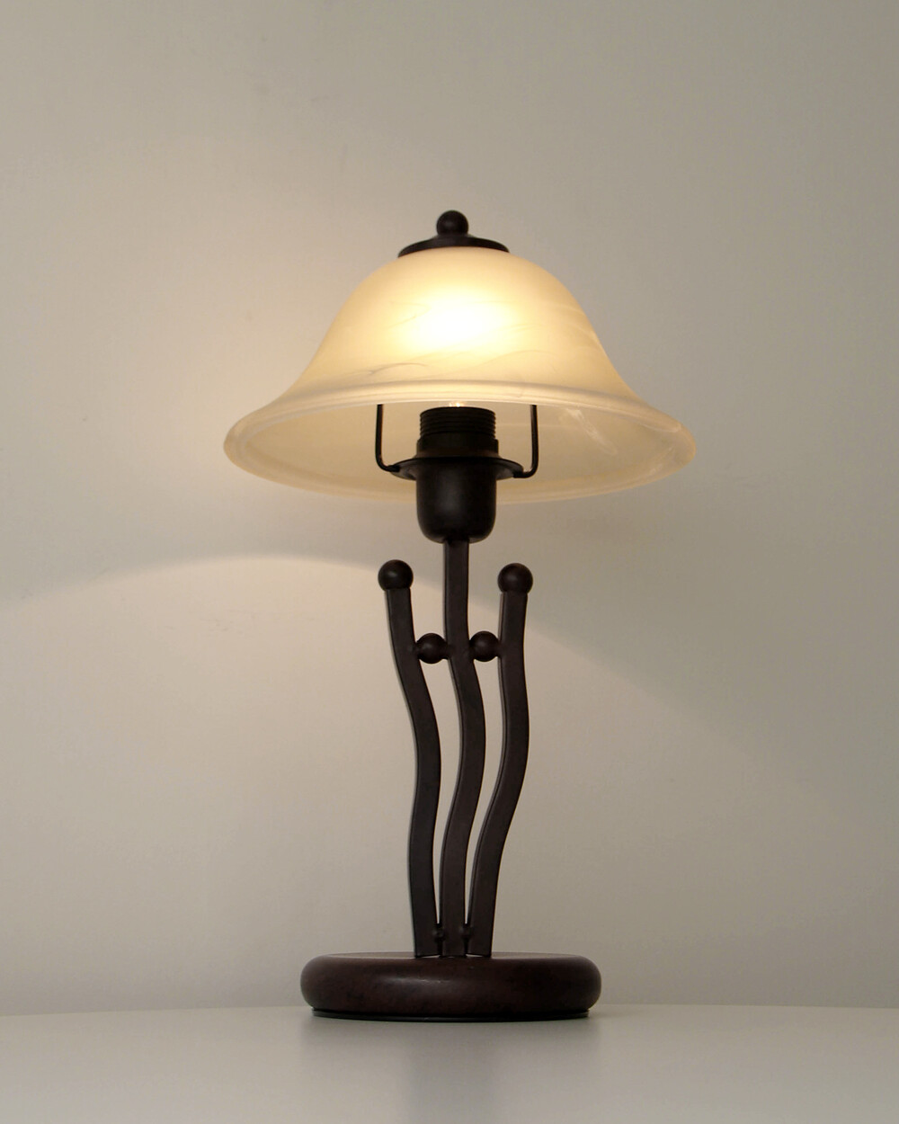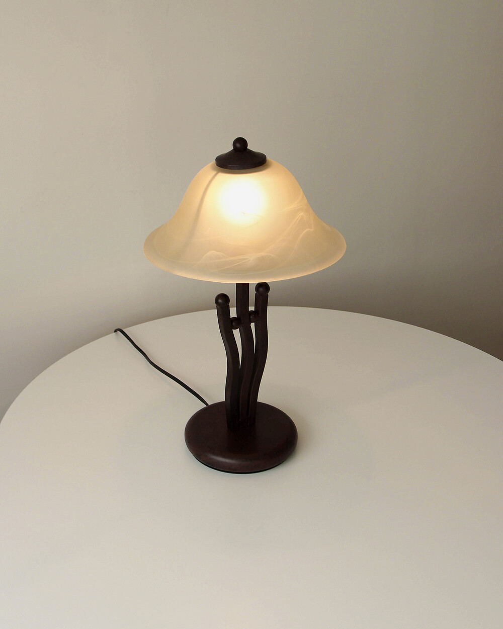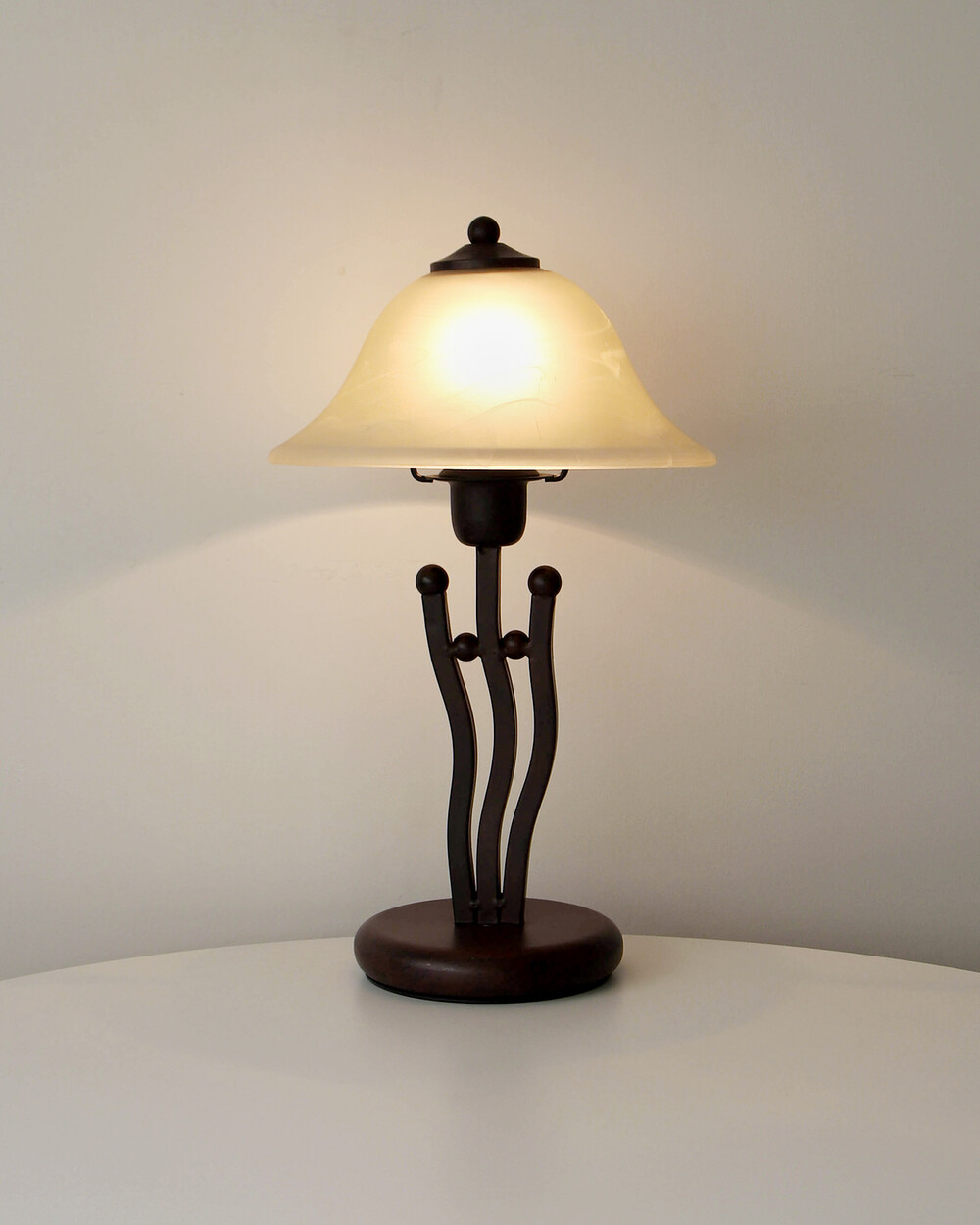 유기적인 곡선 실루엣의 메탈 베이스와 따뜻한 옐로우 베이지 톤의 프로스트 글라스 셰이드로 이루어진 테이블 램프입니다.