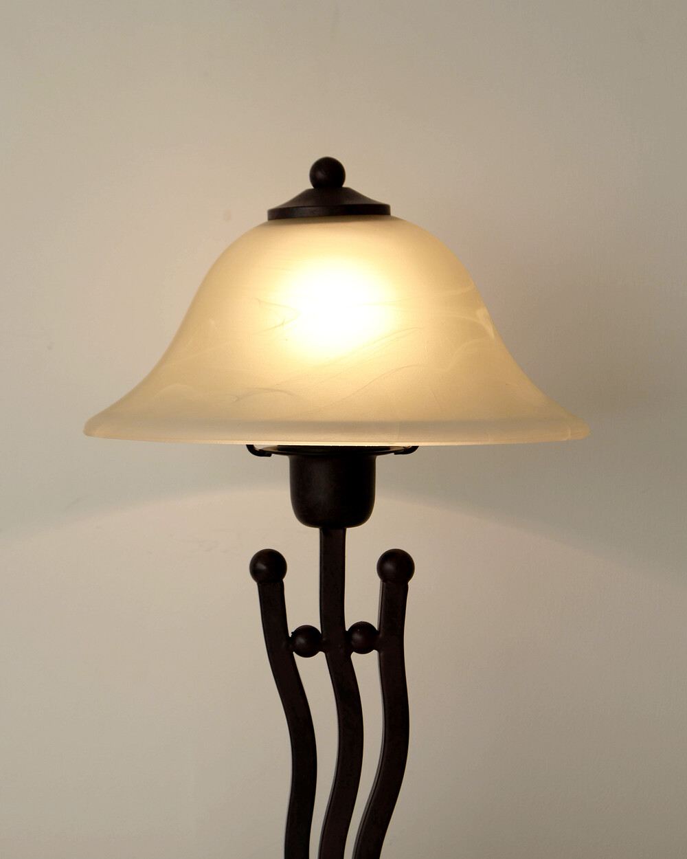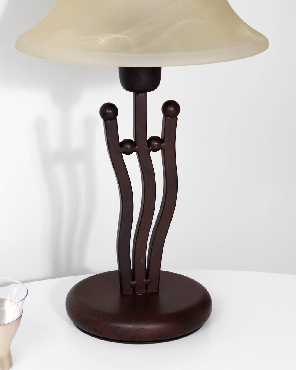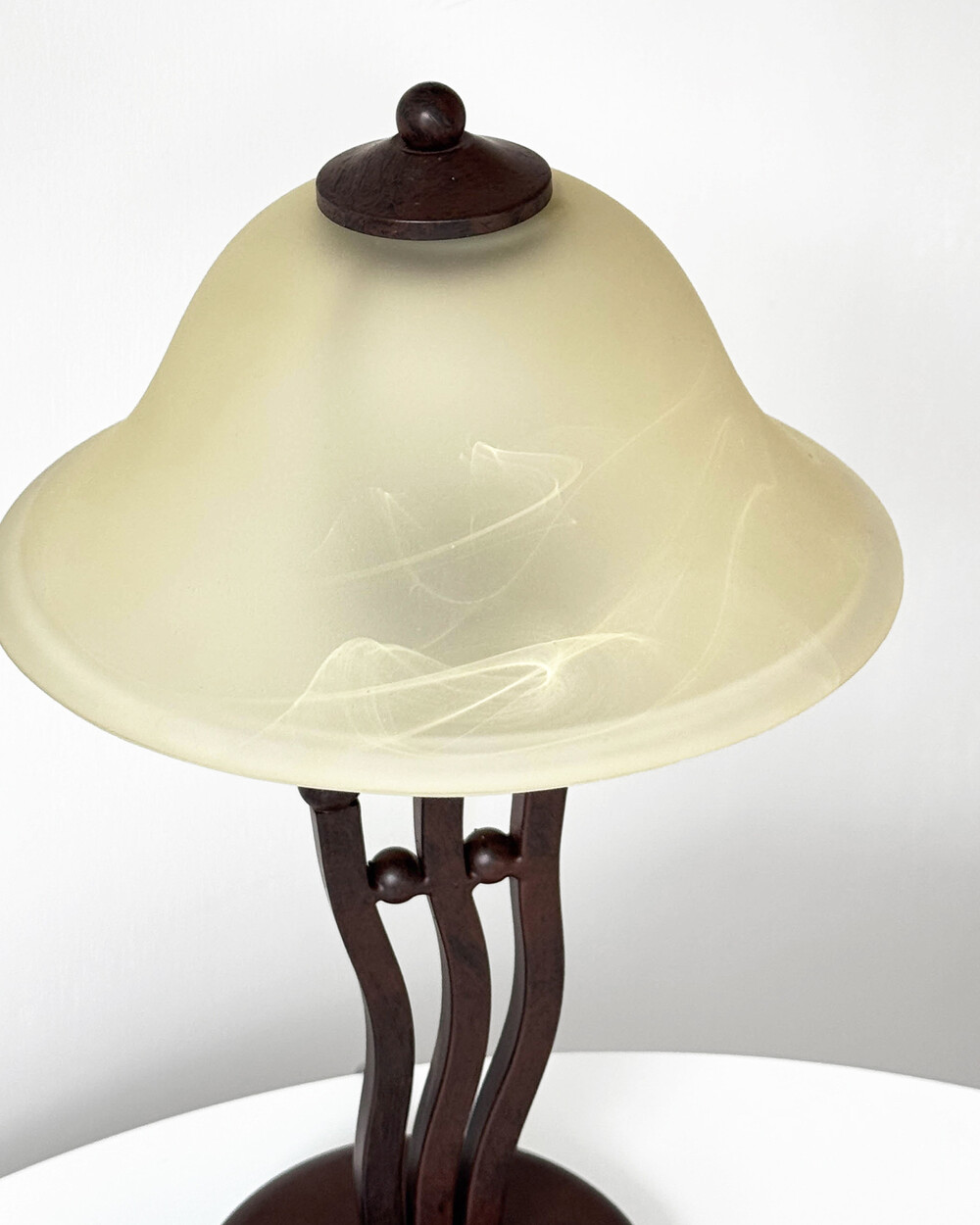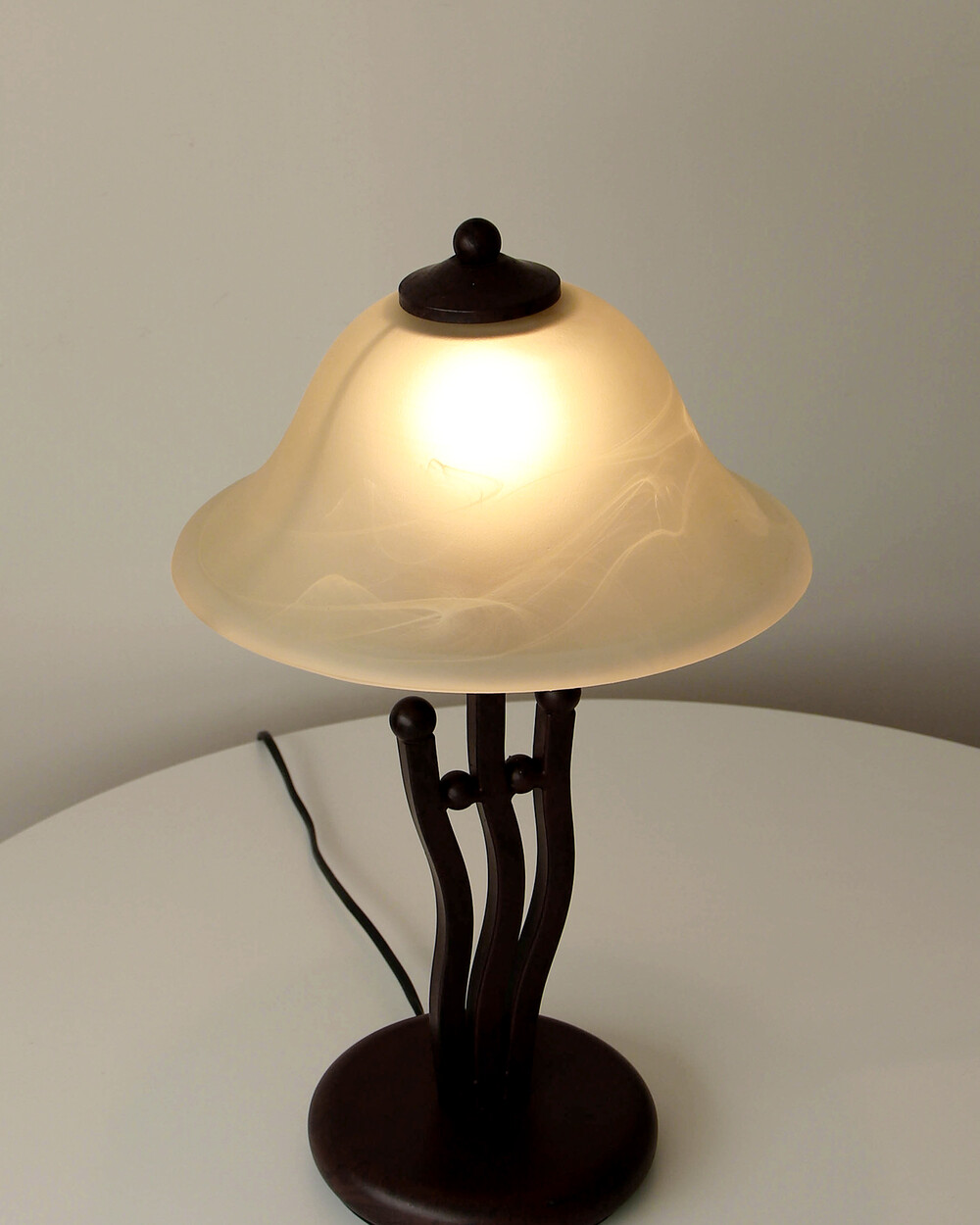 유기적인 곡선 실루엣의 메탈 베이스와 따뜻한 옐로우 베이지 톤의 프로스트 글라스 셰이드로 이루어진 테이블 램프입니다.