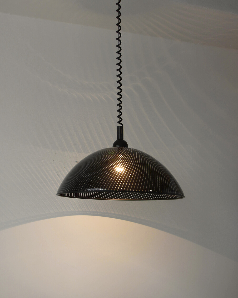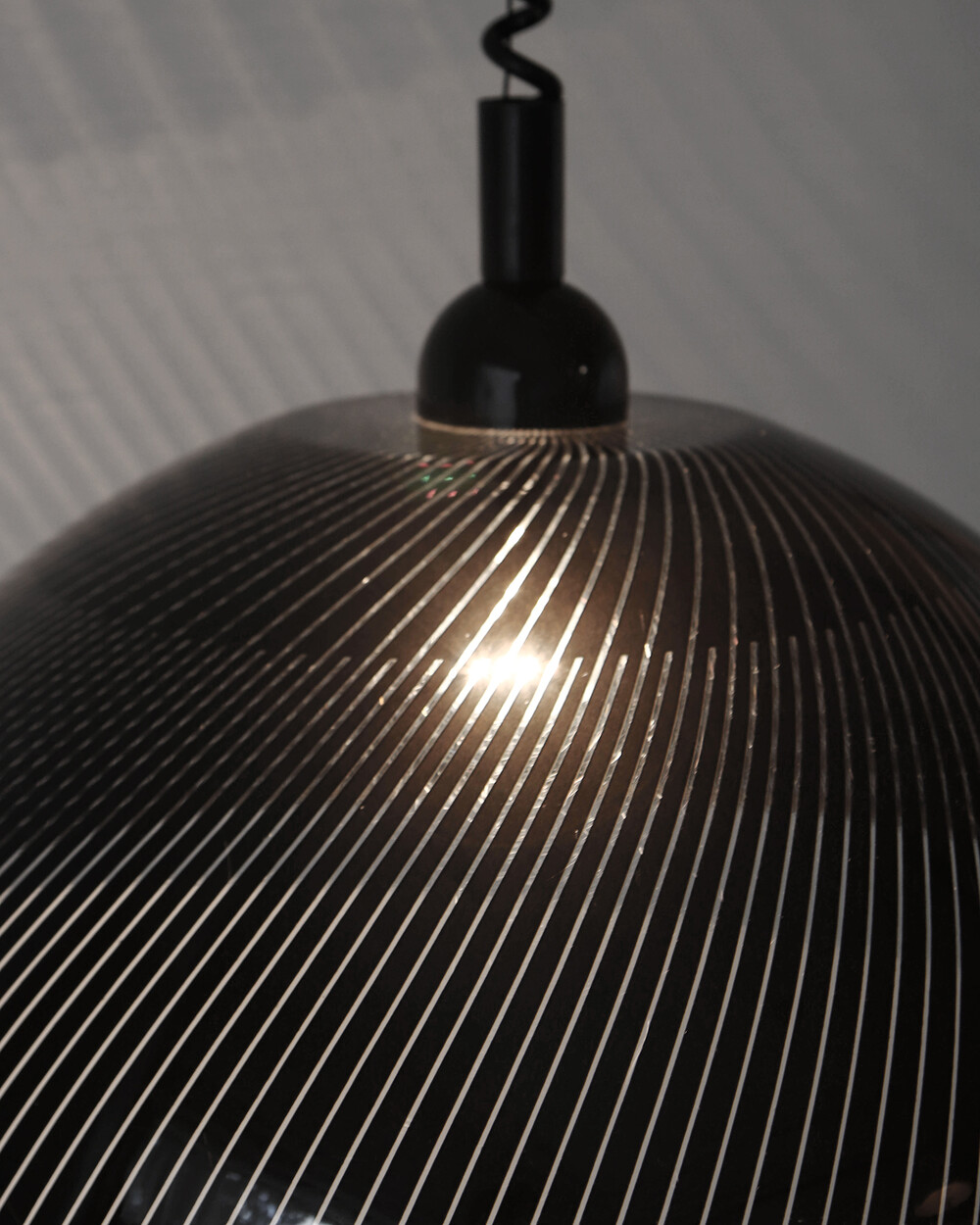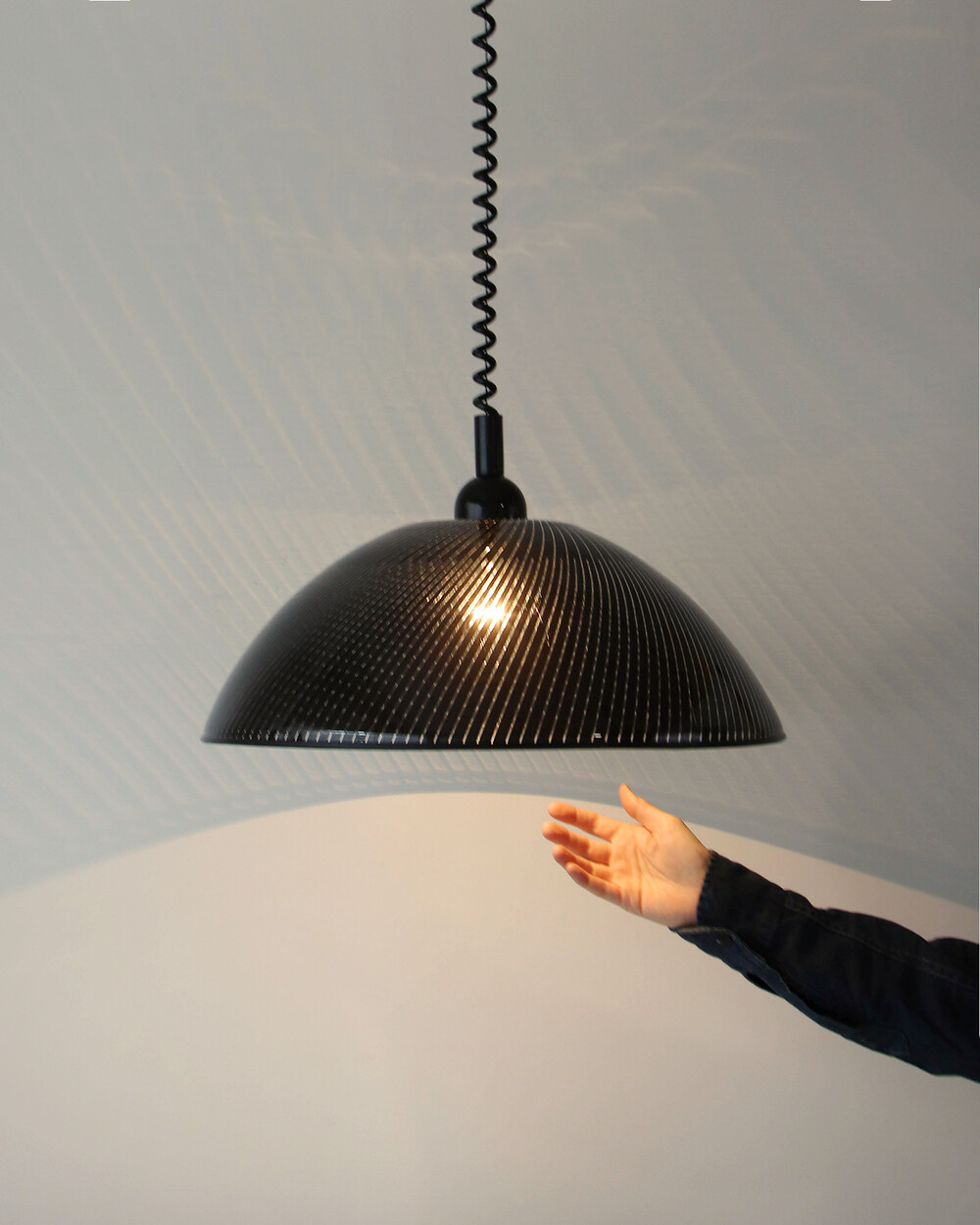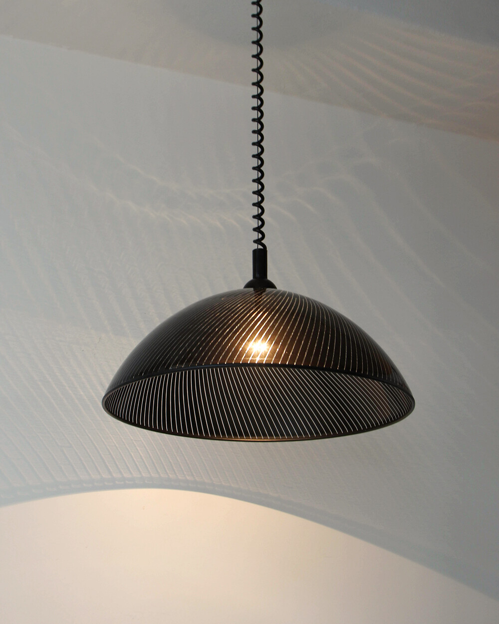 투명한 플렉시글라스에 정교한 옵티컬 스트라이프 패턴이 인쇄되어 있으며, 점등 시 패턴을 따라 빛이 입체적으로 투영됩니다. 조형적인 돔 실루엣과 서스펜션 라인이 어우러져 공간에 세련된 인상을 남깁니다.