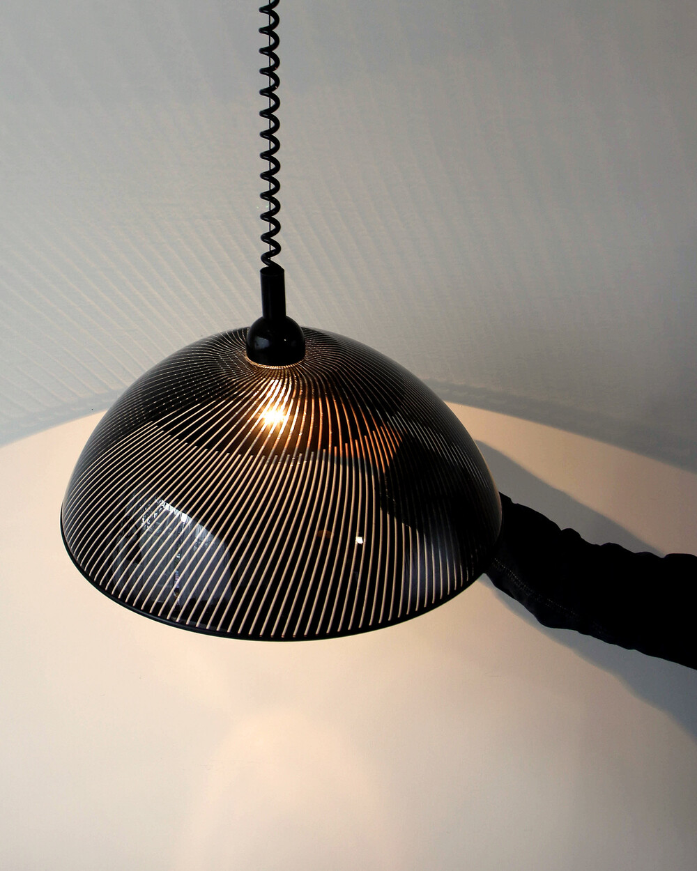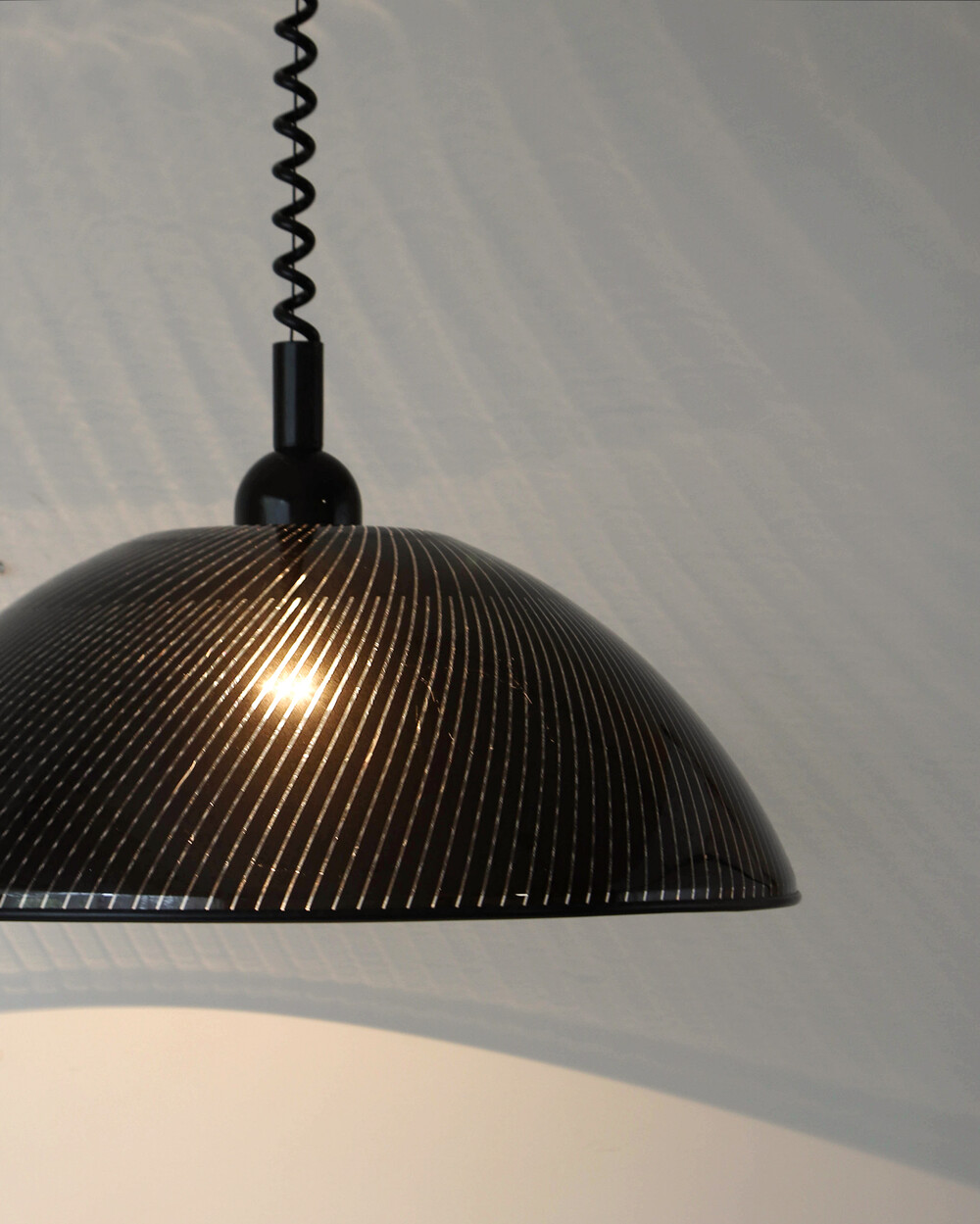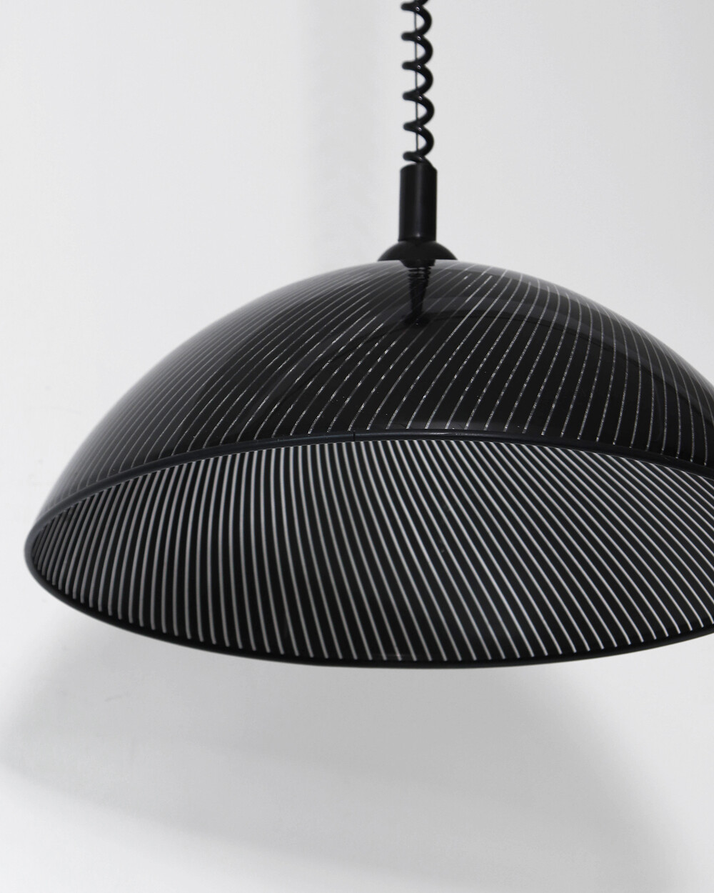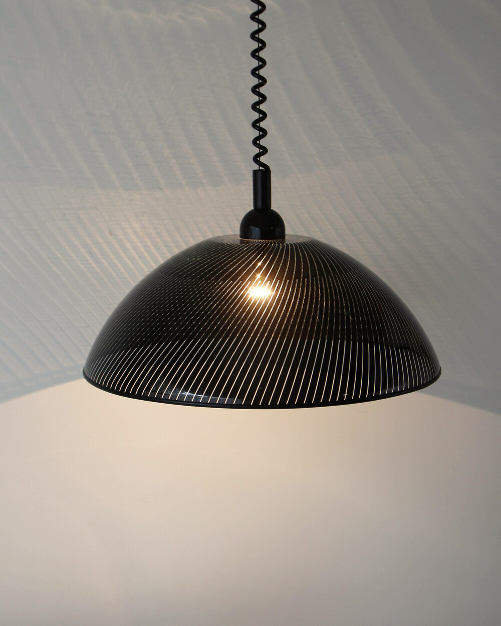 투명한 플렉시글라스에 정교한 옵티컬 스트라이프 패턴이 인쇄되어 있으며, 점등 시 패턴을 따라 빛이 입체적으로 투영됩니다. 조형적인 돔 실루엣과 서스펜션 라인이 어우러져 공간에 세련된 인상을 남깁니다.