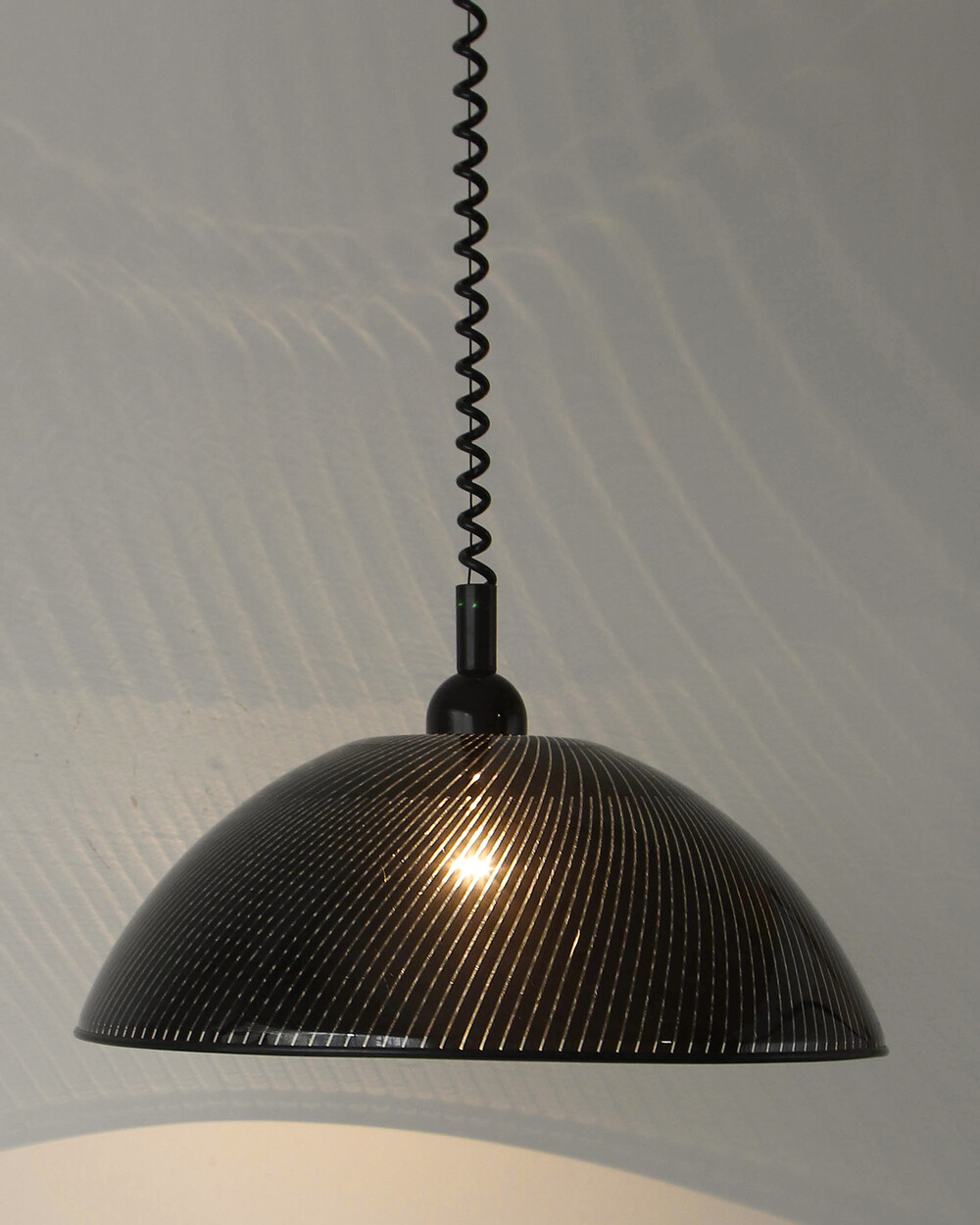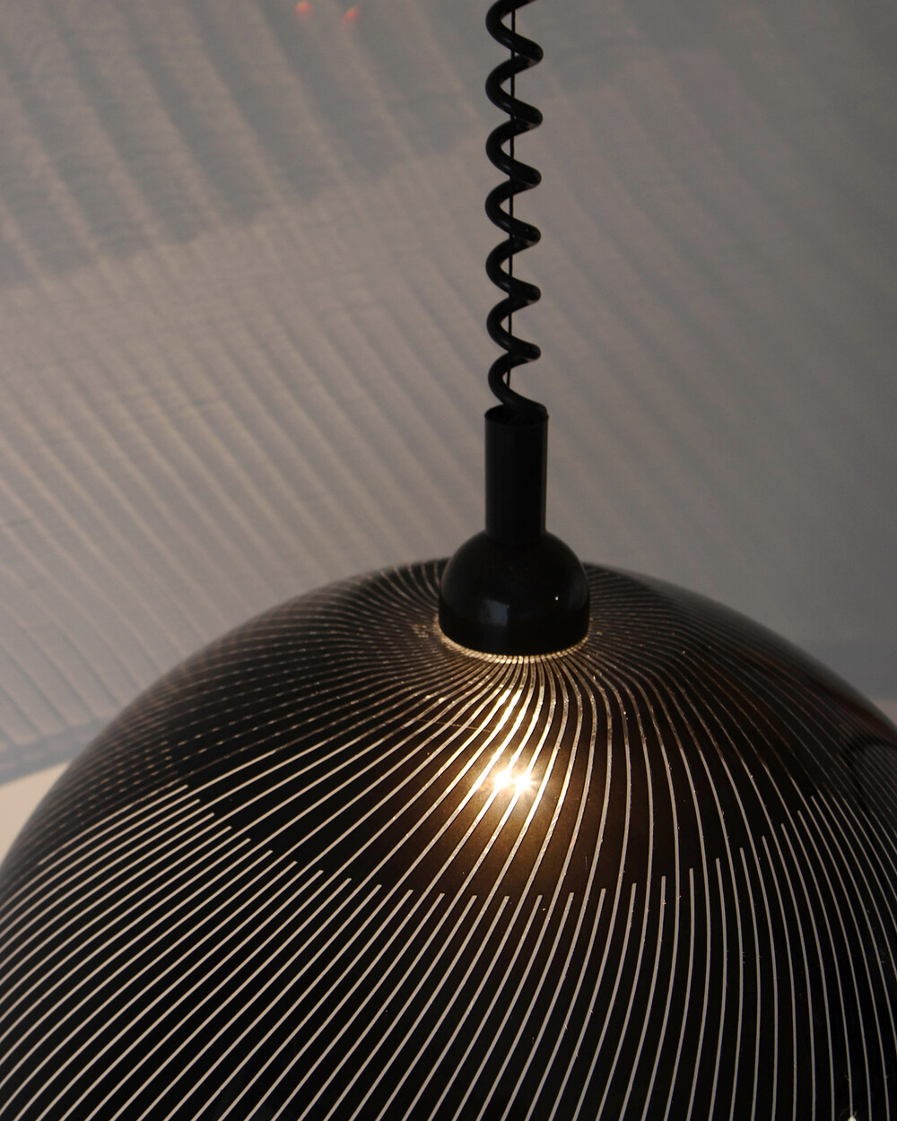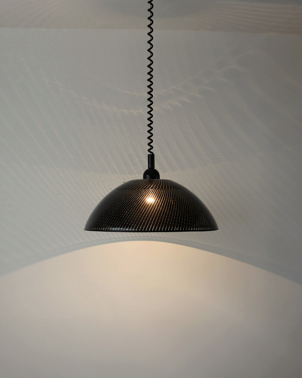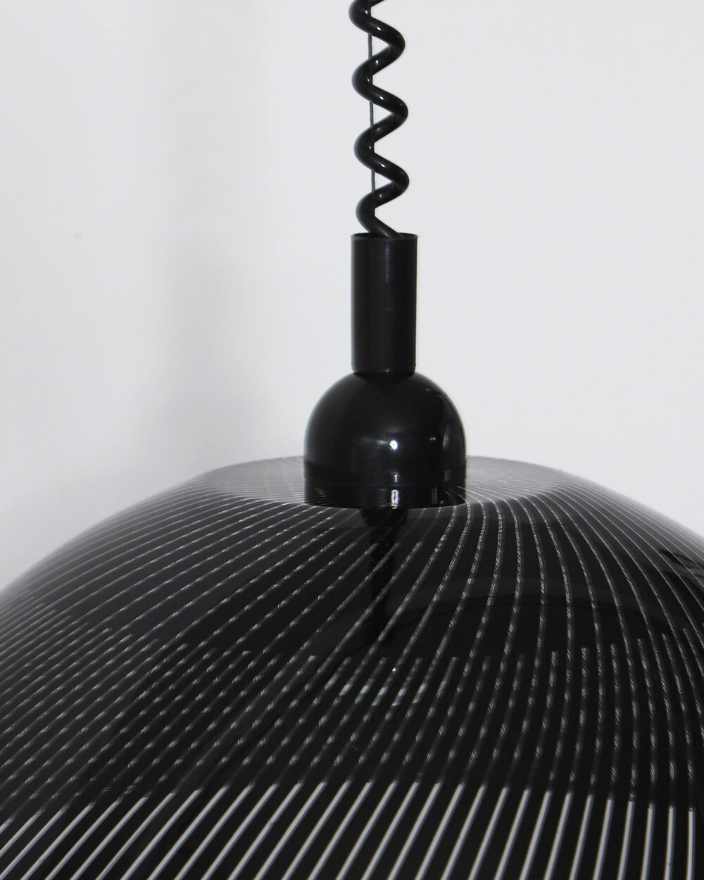 투명한 플렉시글라스에 정교한 옵티컬 스트라이프 패턴이 인쇄되어 있으며, 점등 시 패턴을 따라 빛이 입체적으로 투영됩니다. 조형적인 돔 실루엣과 서스펜션 라인이 어우러져 공간에 세련된 인상을 남깁니다.