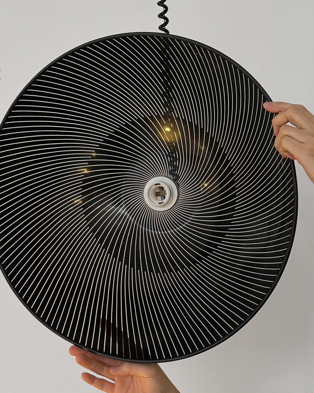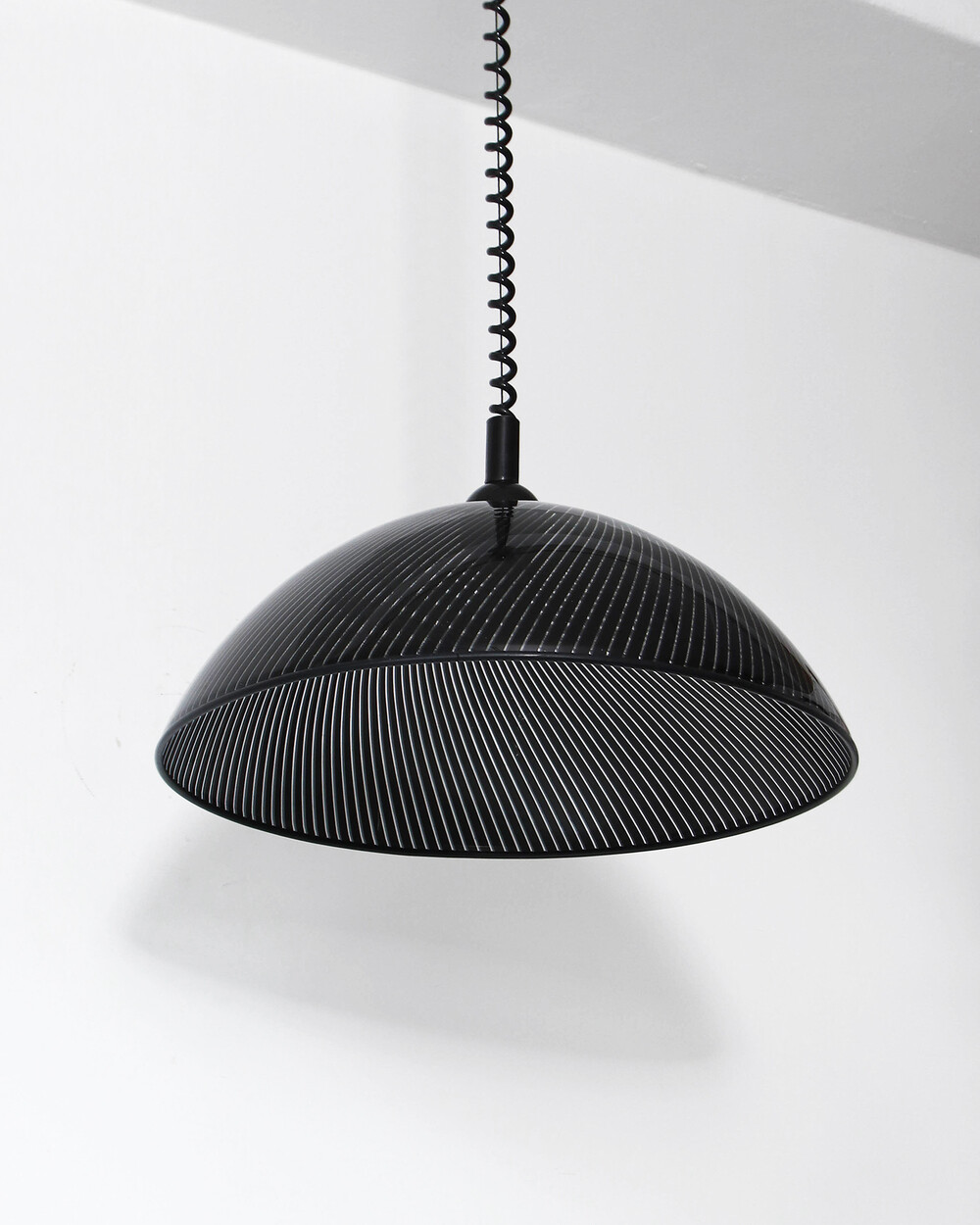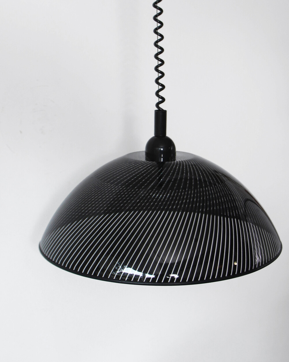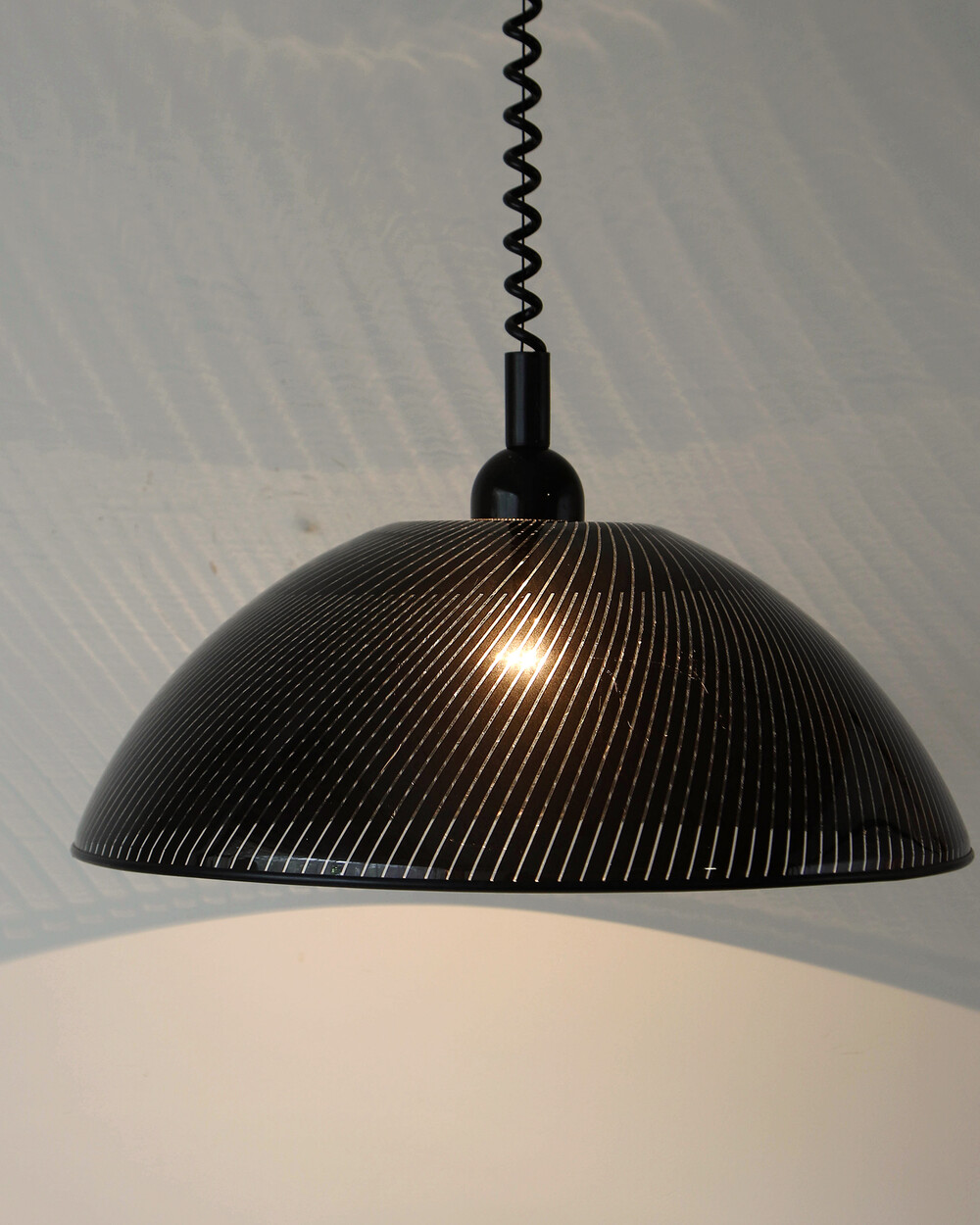 투명한 플렉시글라스에 정교한 옵티컬 스트라이프 패턴이 인쇄되어 있으며, 점등 시 패턴을 따라 빛이 입체적으로 투영됩니다. 조형적인 돔 실루엣과 서스펜션 라인이 어우러져 공간에 세련된 인상을 남깁니다.