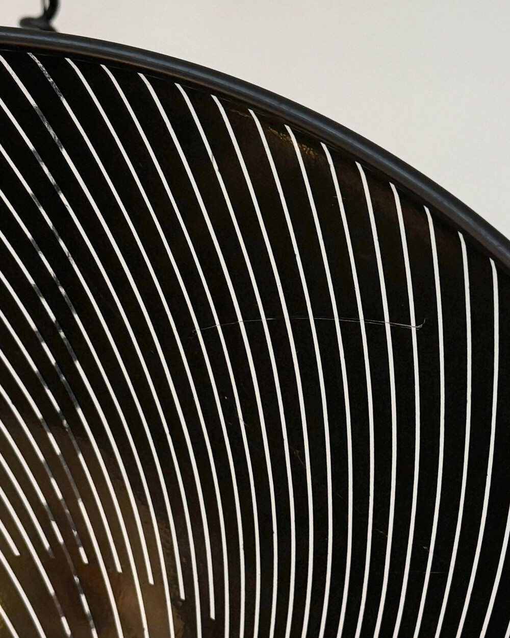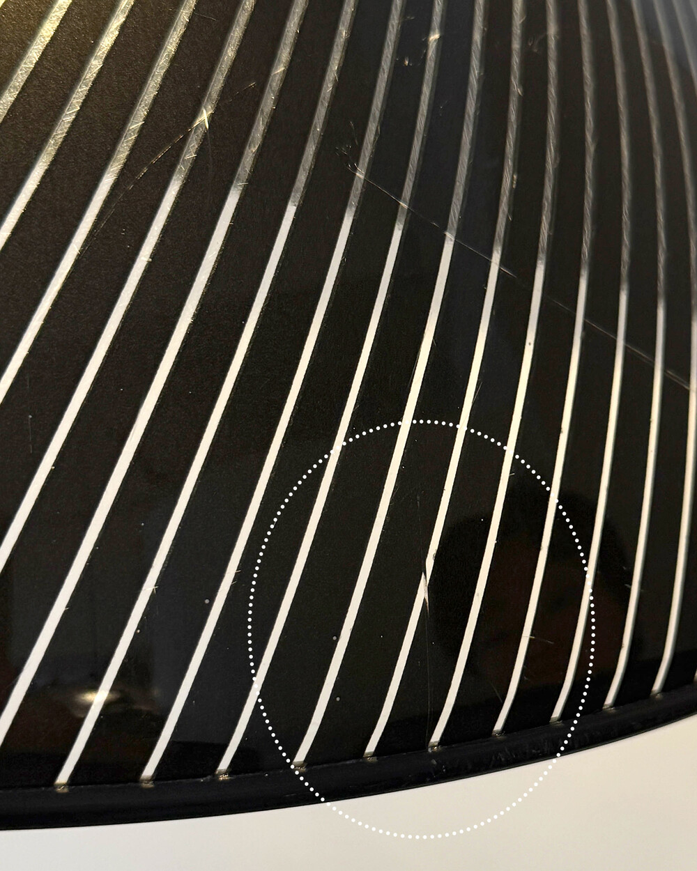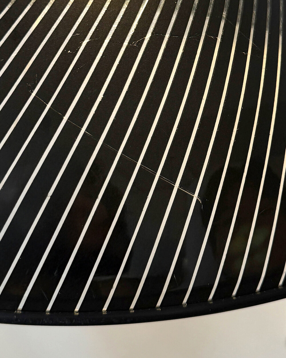 셰이드 윗 부분과 천장 캐노피는 블랙 컬러의 플라스틱 소재로 제작되었으며, 스크래치가 남아 있습니다.