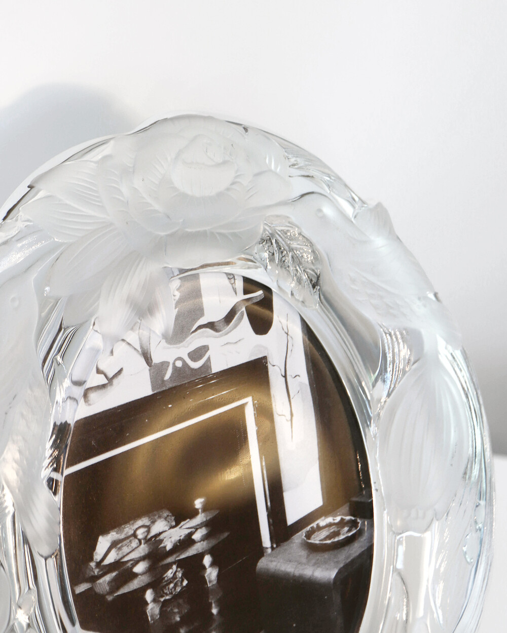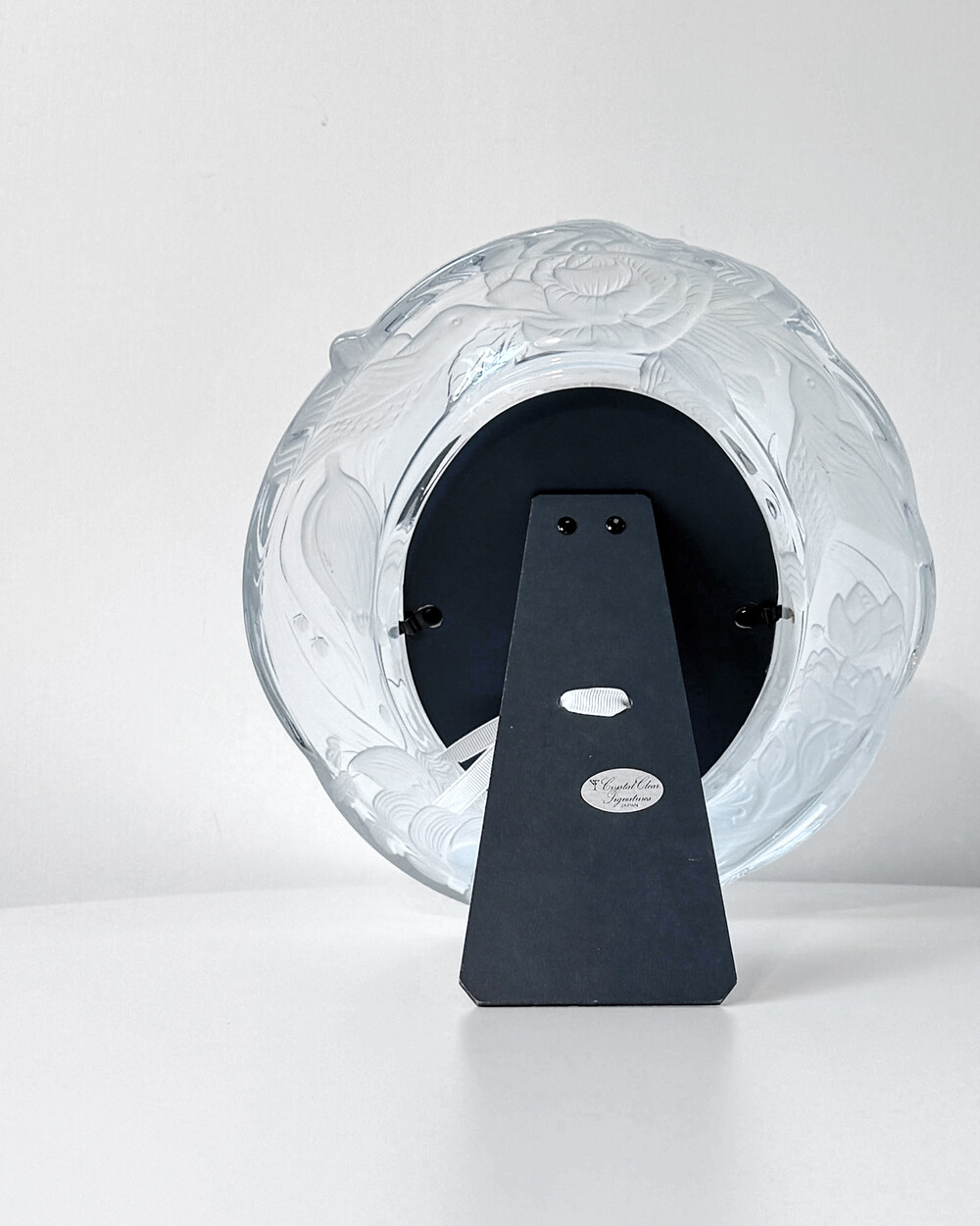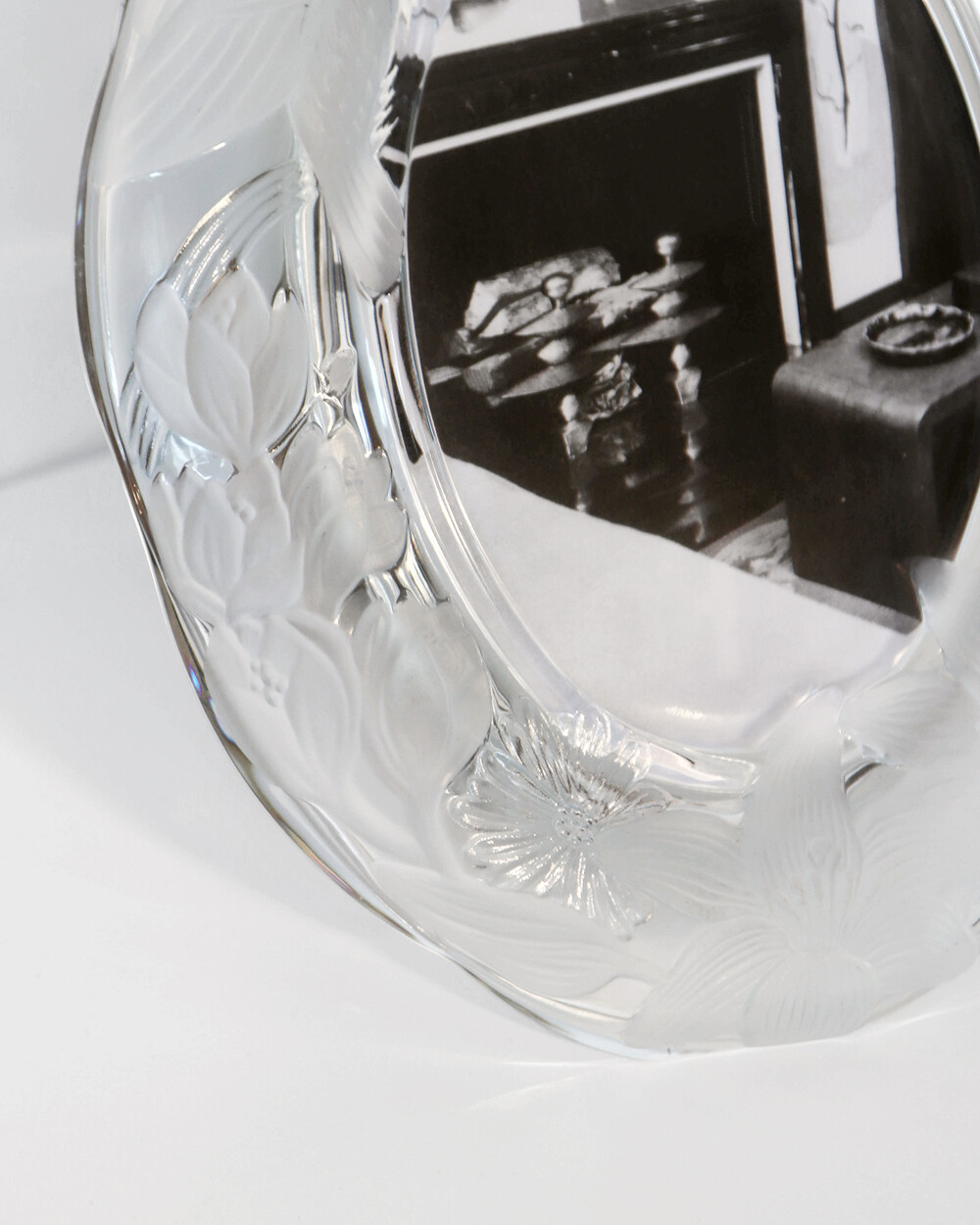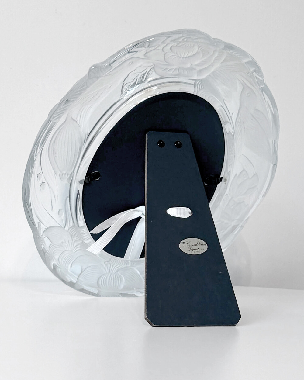 꽃들과 두 마리 새가 섬세하게 표현된 오벌 실루엣의 크리스탈 포토 프레임입니다.