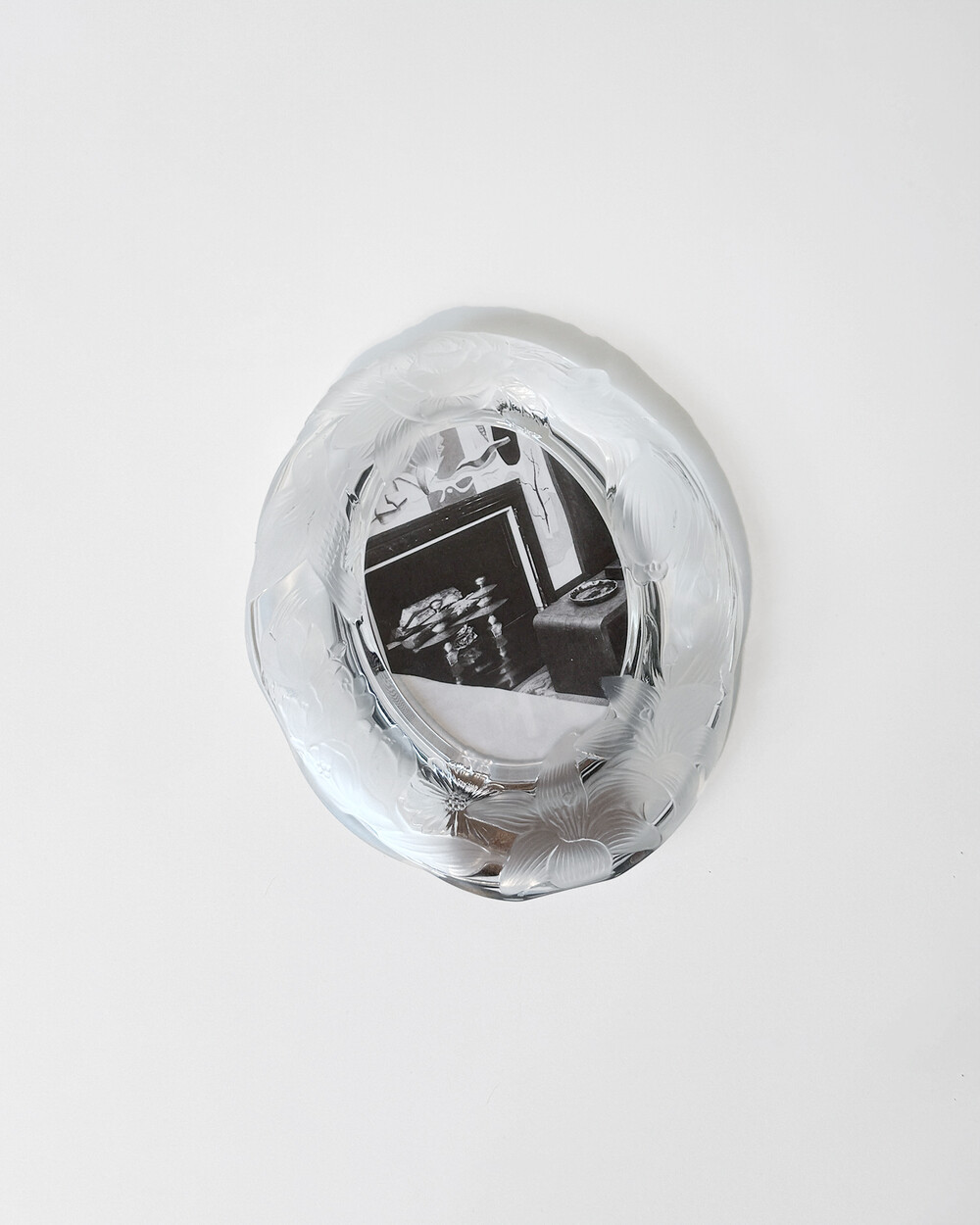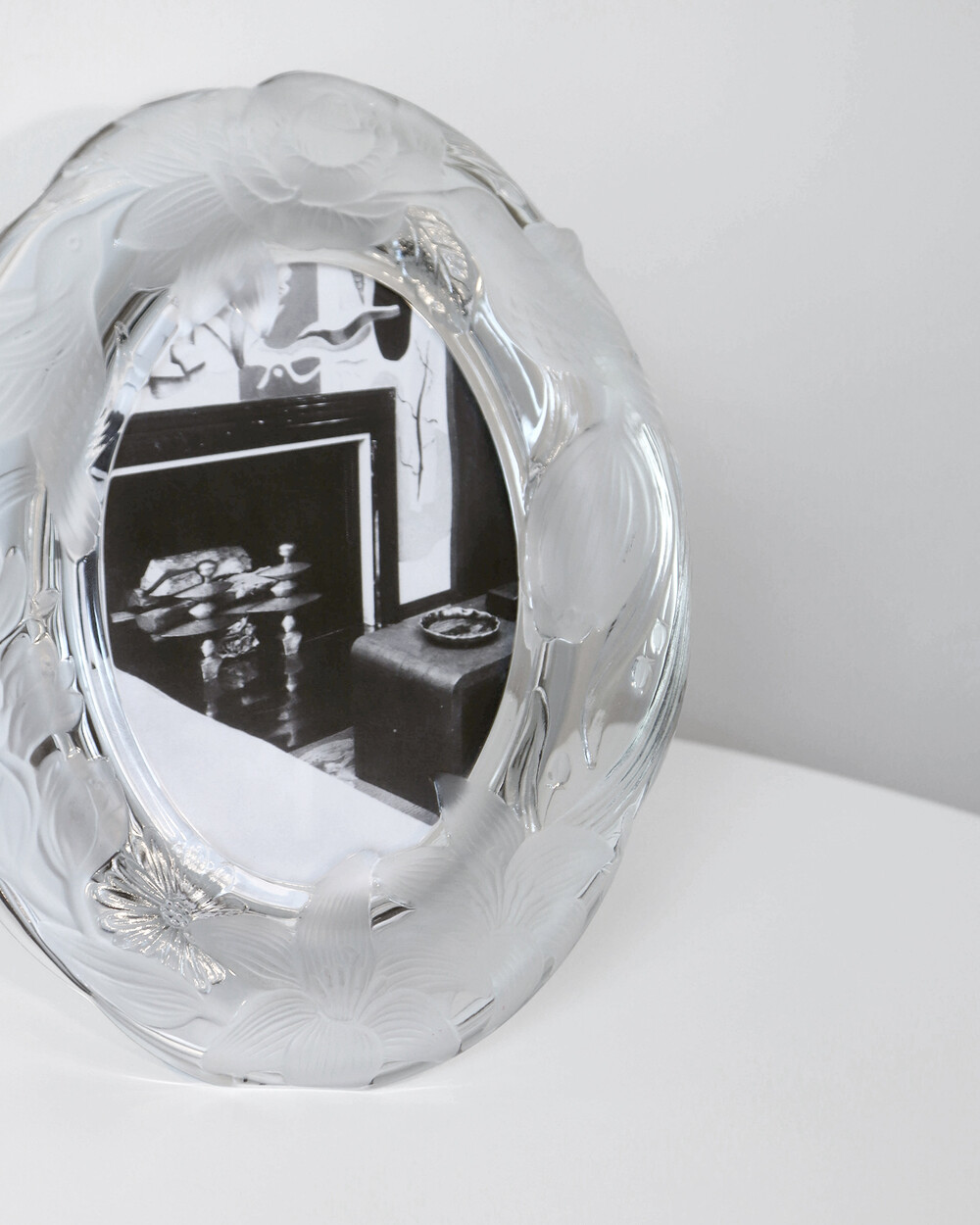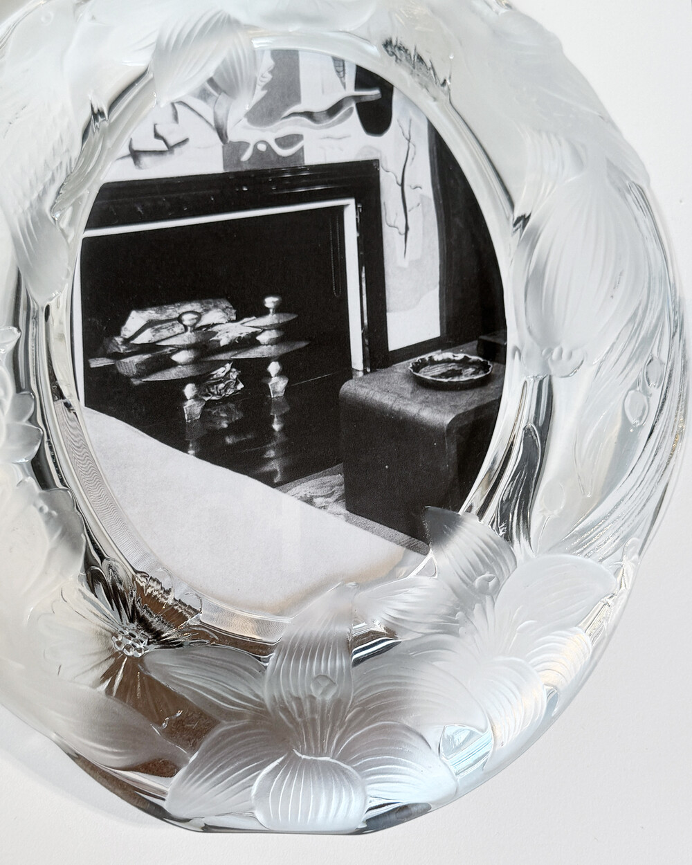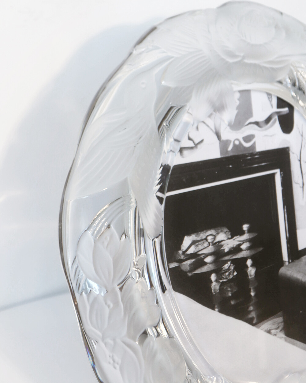 꽃들과 두 마리 새가 섬세하게 표현된 오벌 실루엣의 크리스탈 포토 프레임입니다.