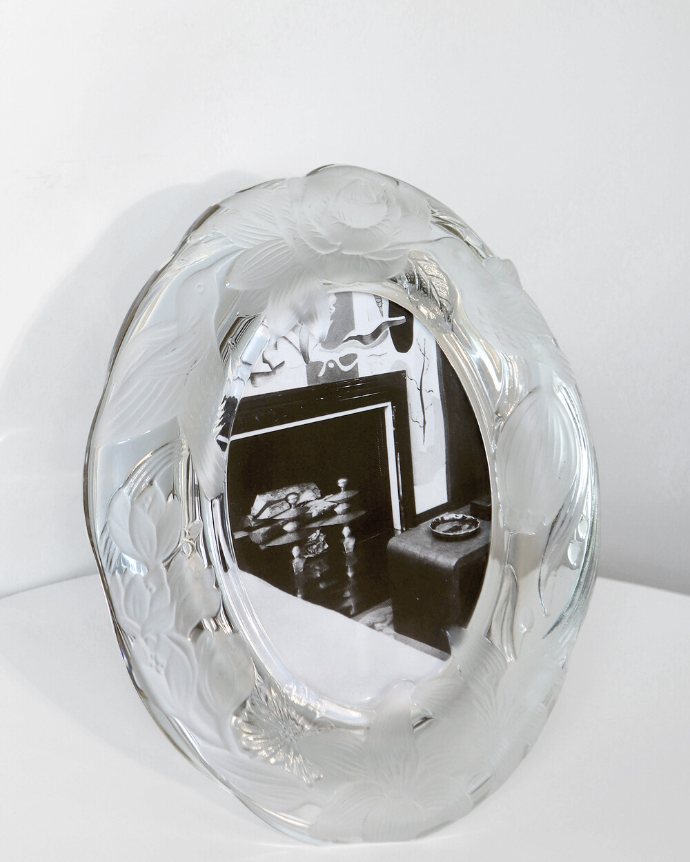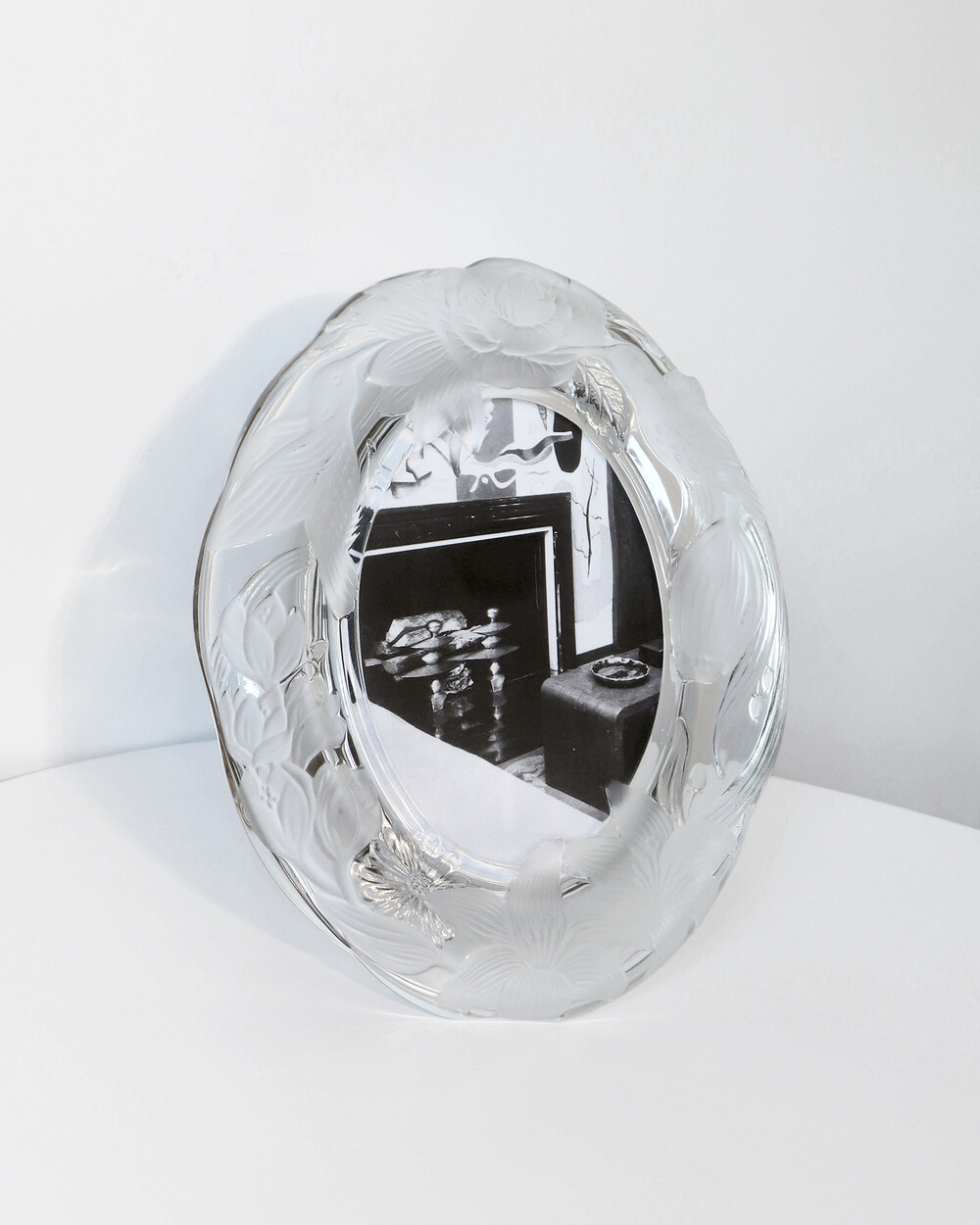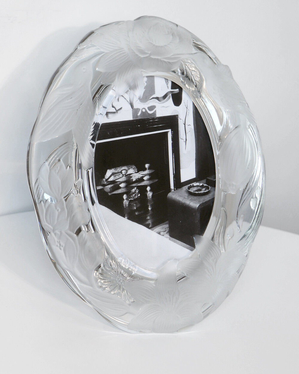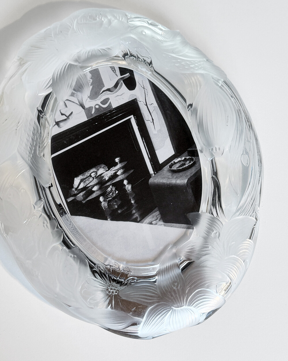 꽃들과 두 마리 새가 섬세하게 표현된 오벌 실루엣의 크리스탈 포토 프레임입니다.