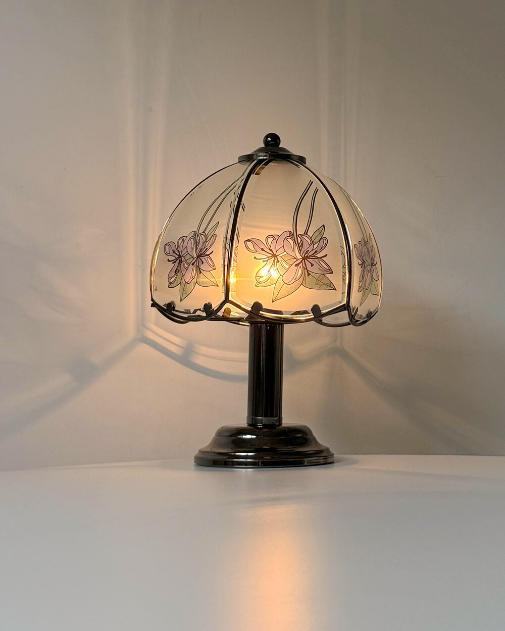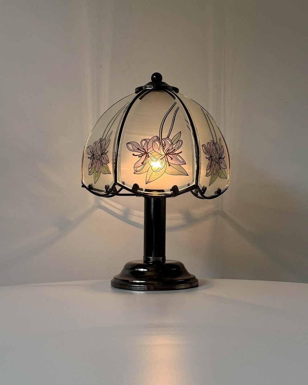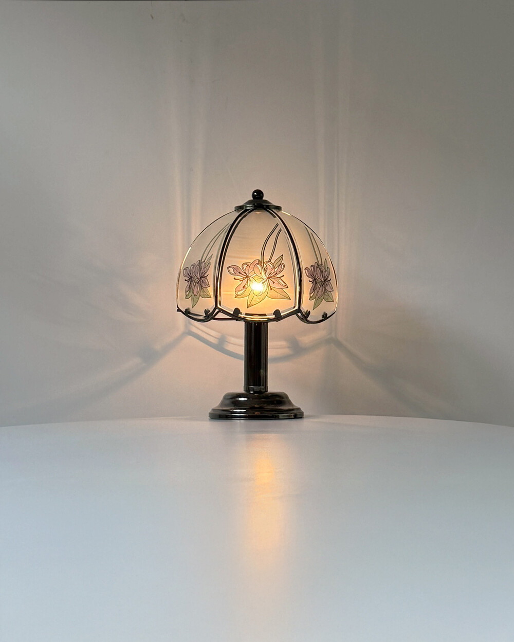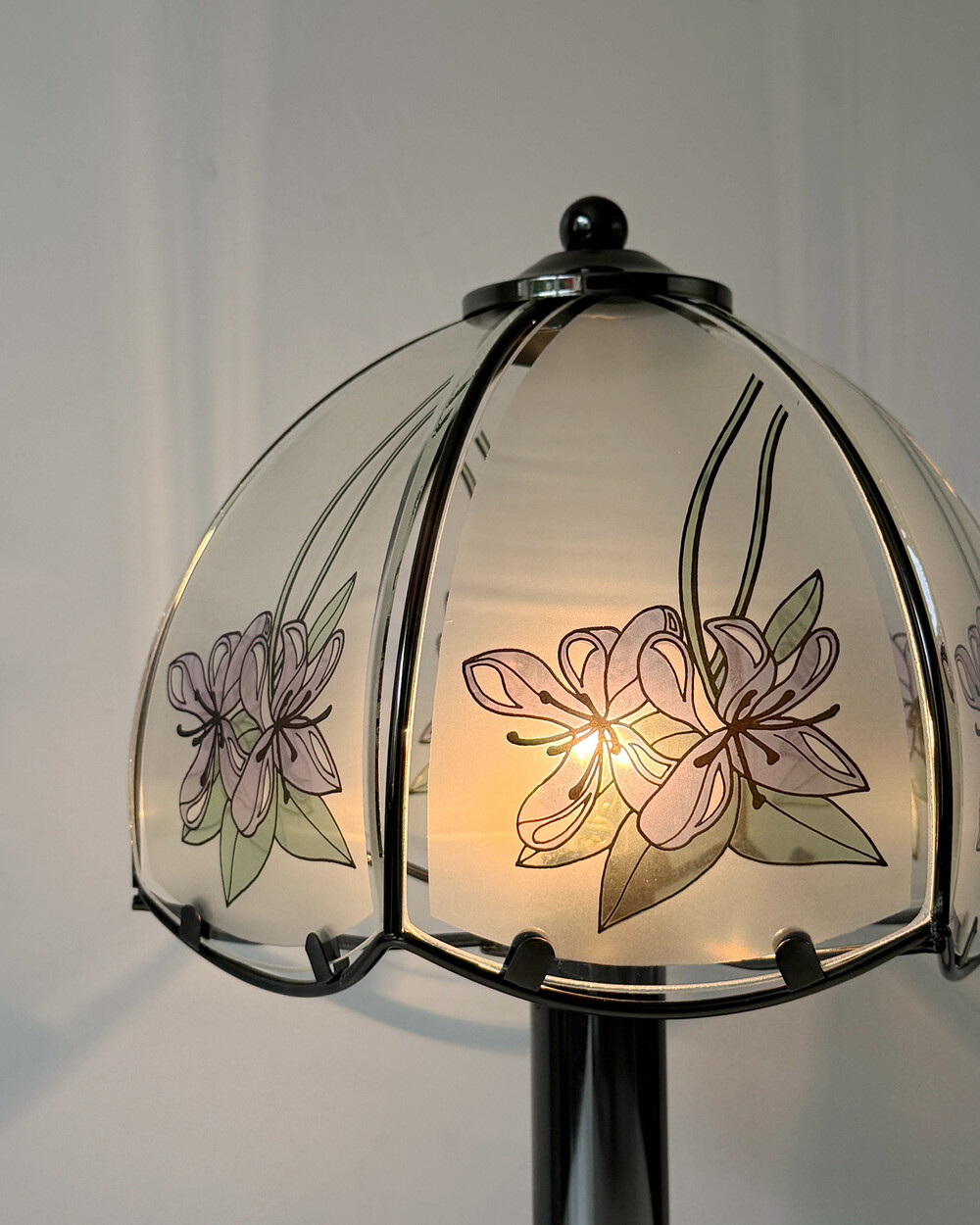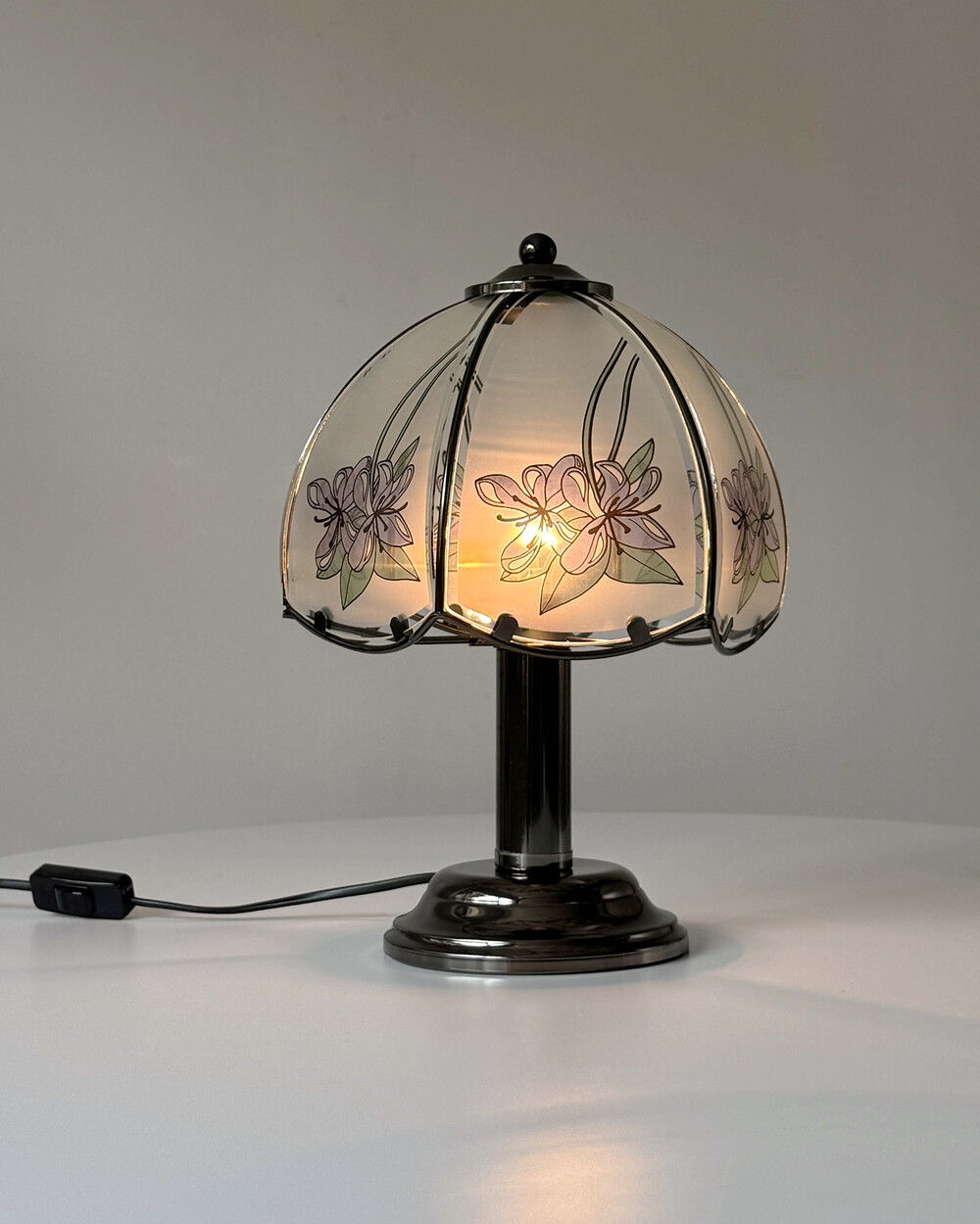 은은한 색감의 플라워 프린트가 장식된 플랫 글라스 테이블 램프로, 1980년대 벨기에 조명 브랜드 Massive에서 제작되었습니다. 메탈 프레임과 베이스 위로 아치형 곡선을 이루는 글라스 패널이 둘러져 있으며, 점등 시 유리를 통과한 빛이 섬세한 그림자를 드리워 공간에 따듯한 분위기를 더합니다.
