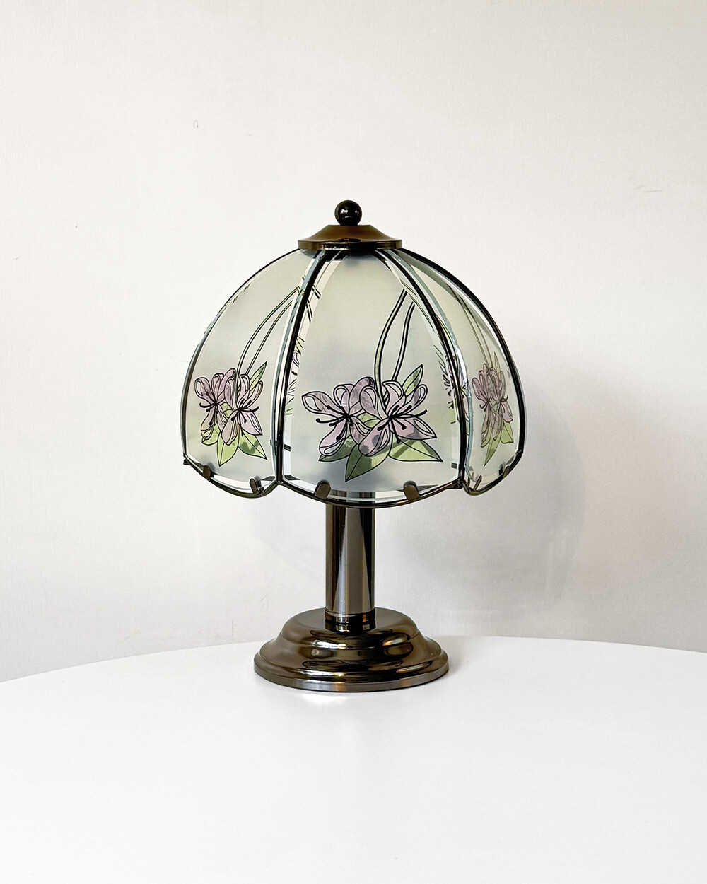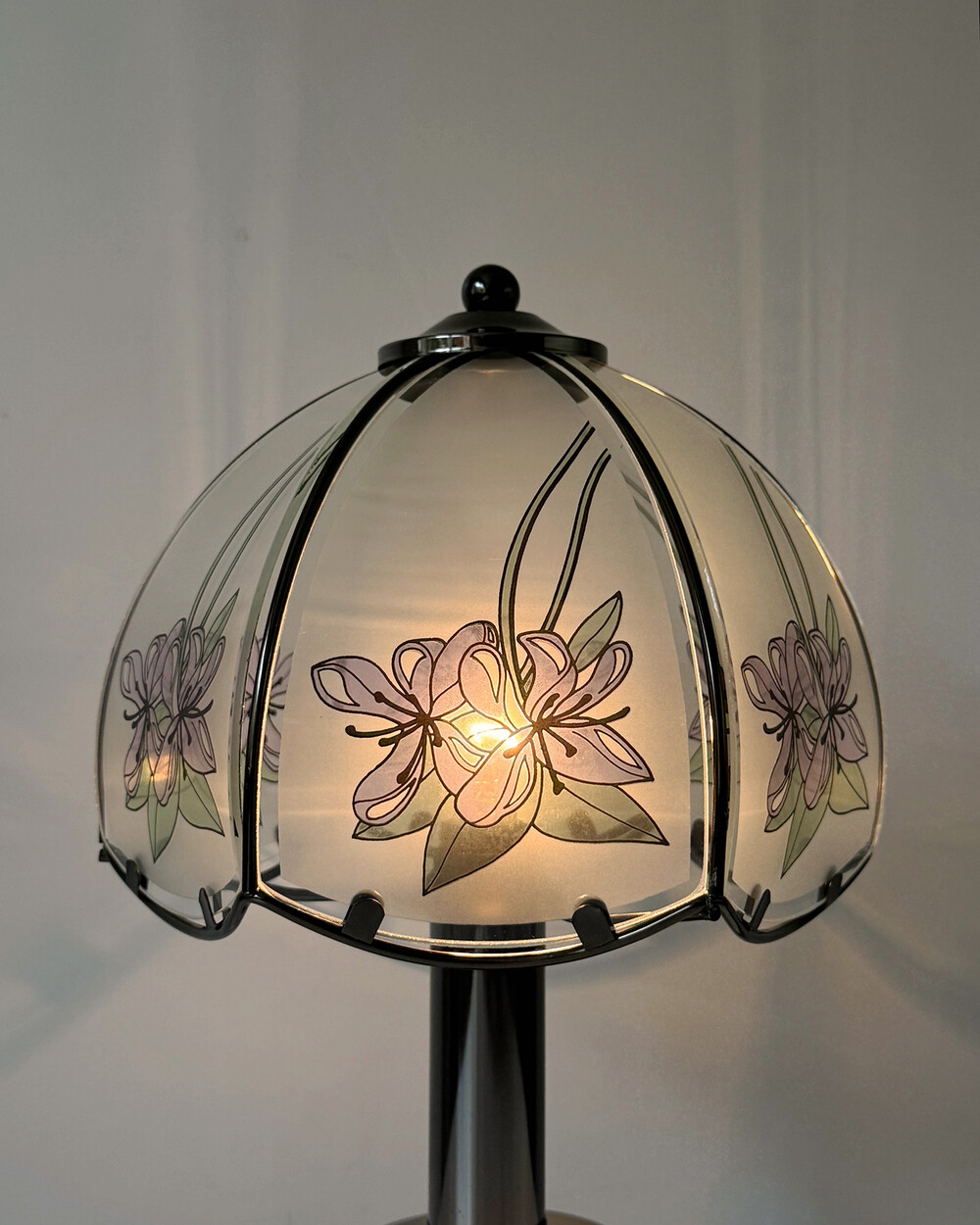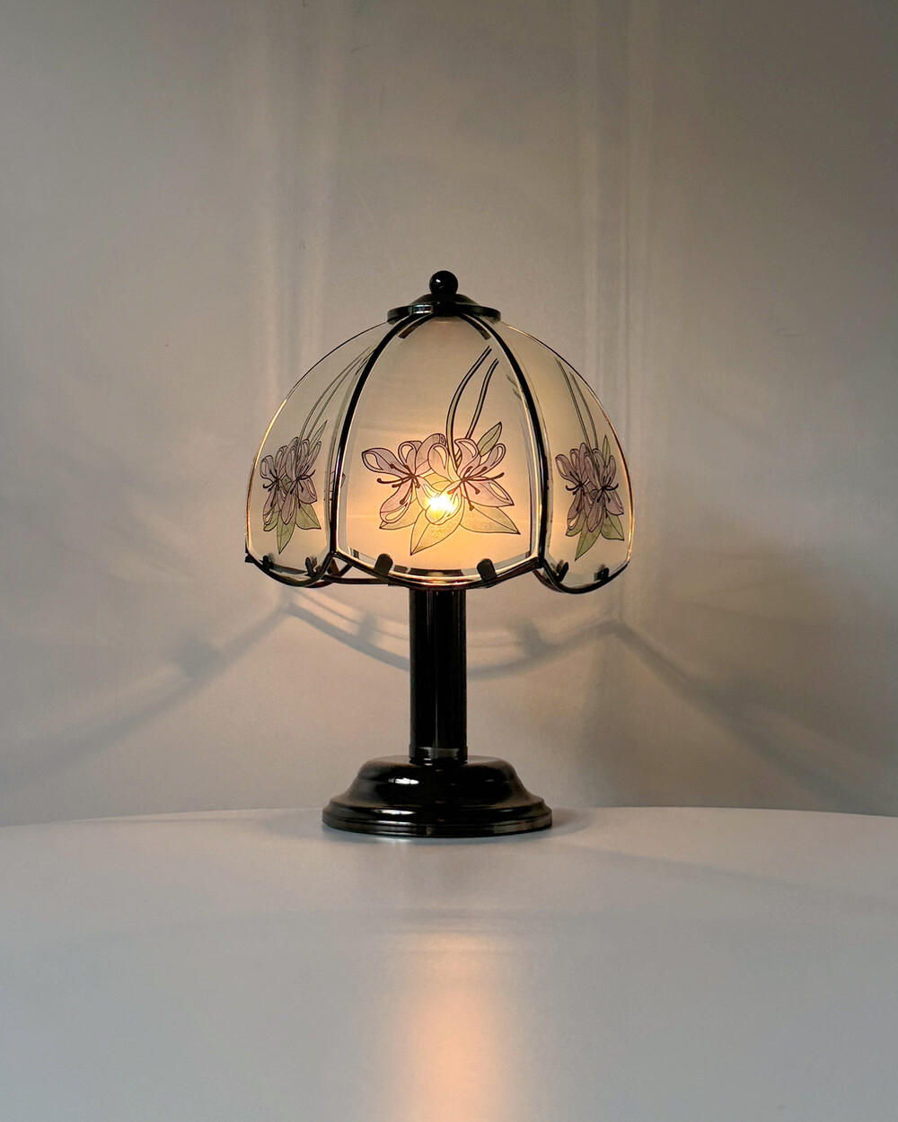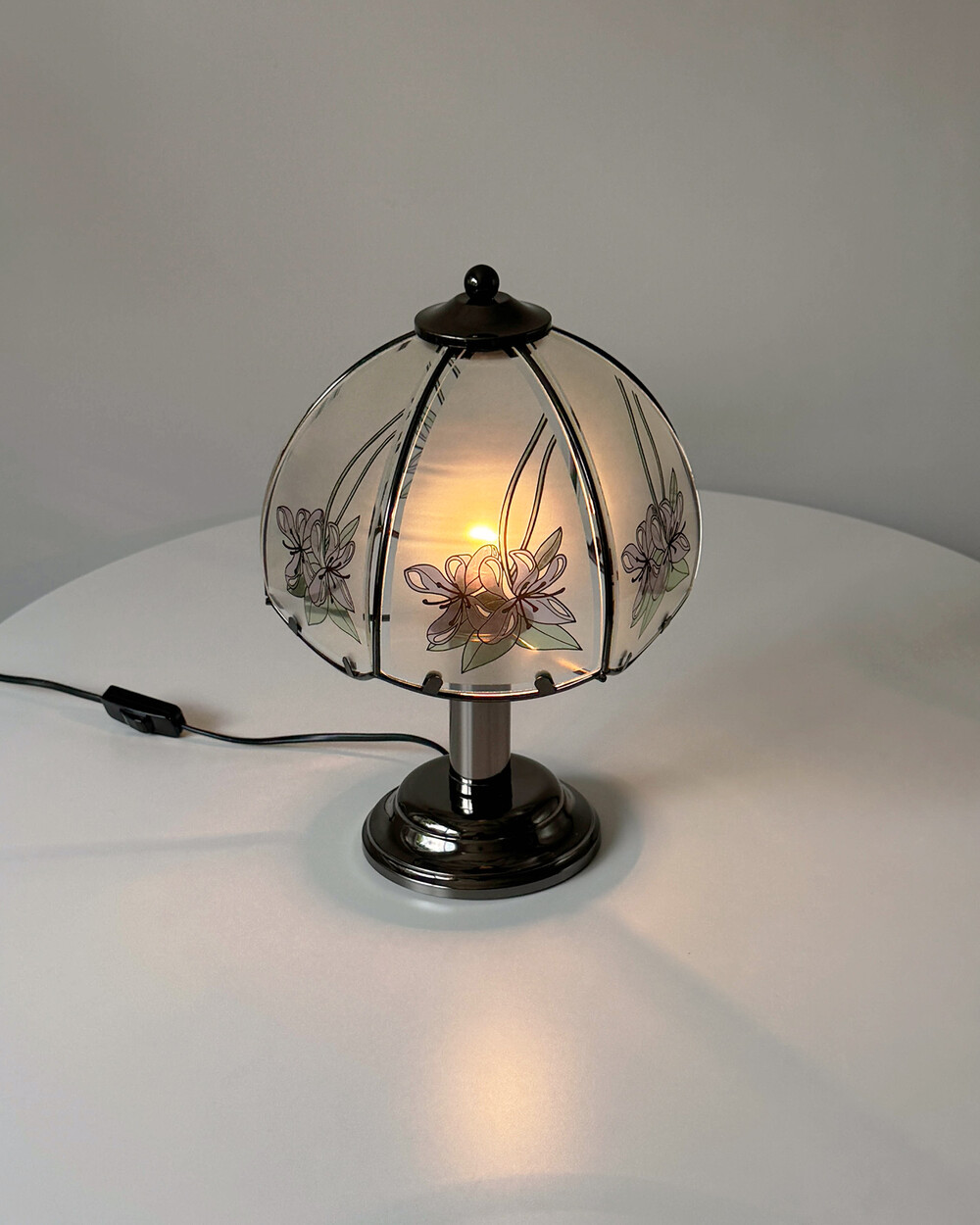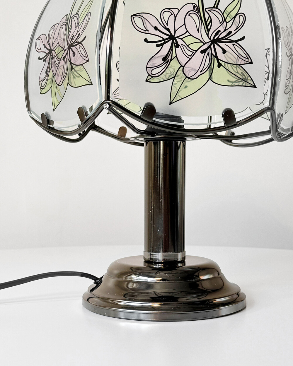 은은한 색감의 플라워 프린트가 장식된 플랫 글라스 테이블 램프로, 1980년대 벨기에 조명 브랜드 Massive에서 제작되었습니다. 메탈 프레임과 베이스 위로 아치형 곡선을 이루는 글라스 패널이 둘러져 있으며, 점등 시 유리를 통과한 빛이 섬세한 그림자를 드리워 공간에 따듯한 분위기를 더합니다.
