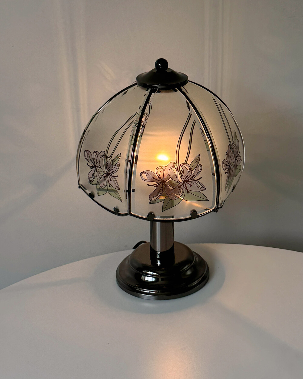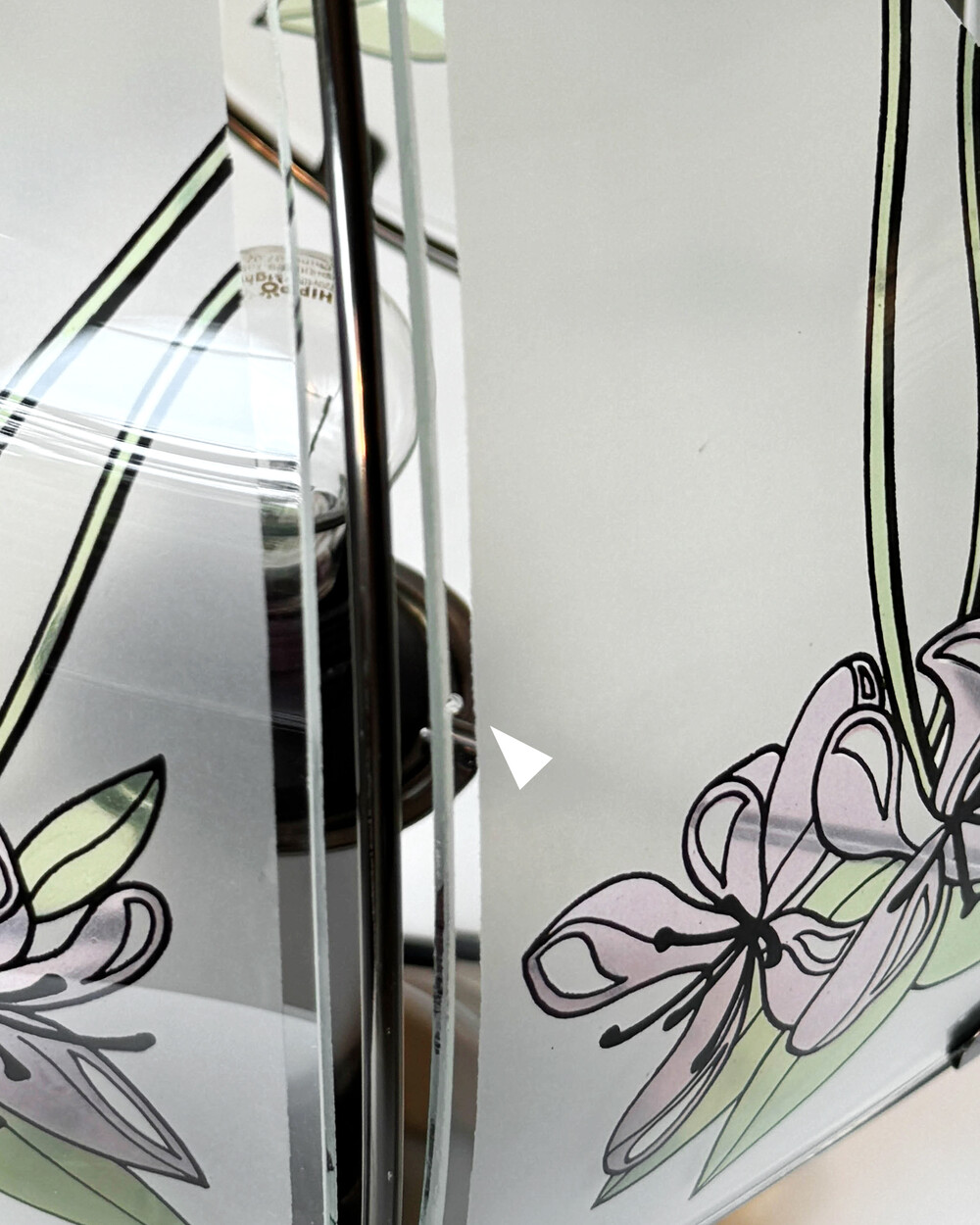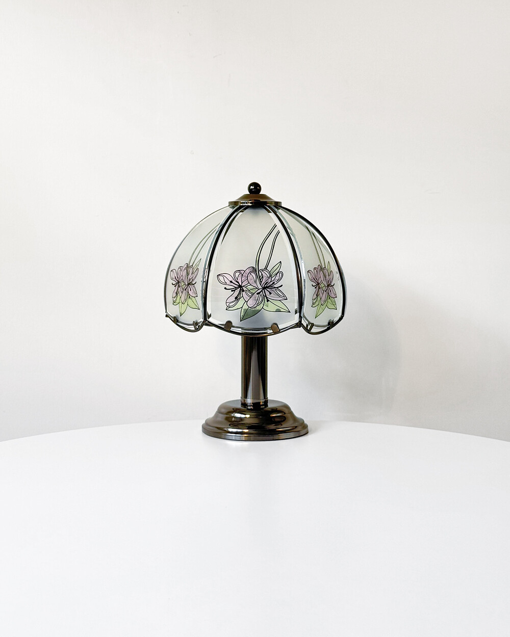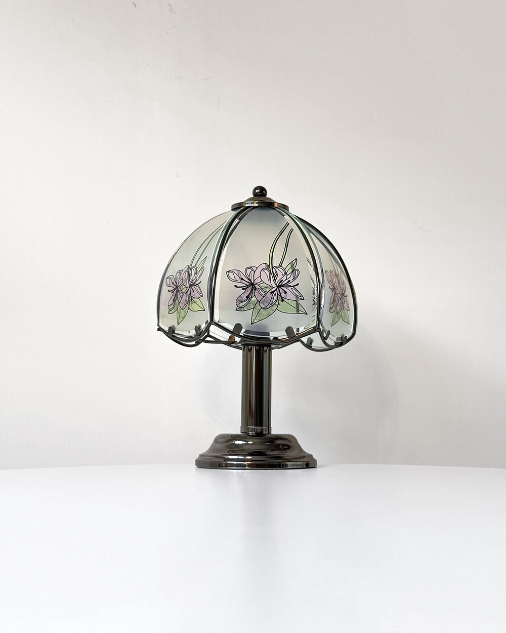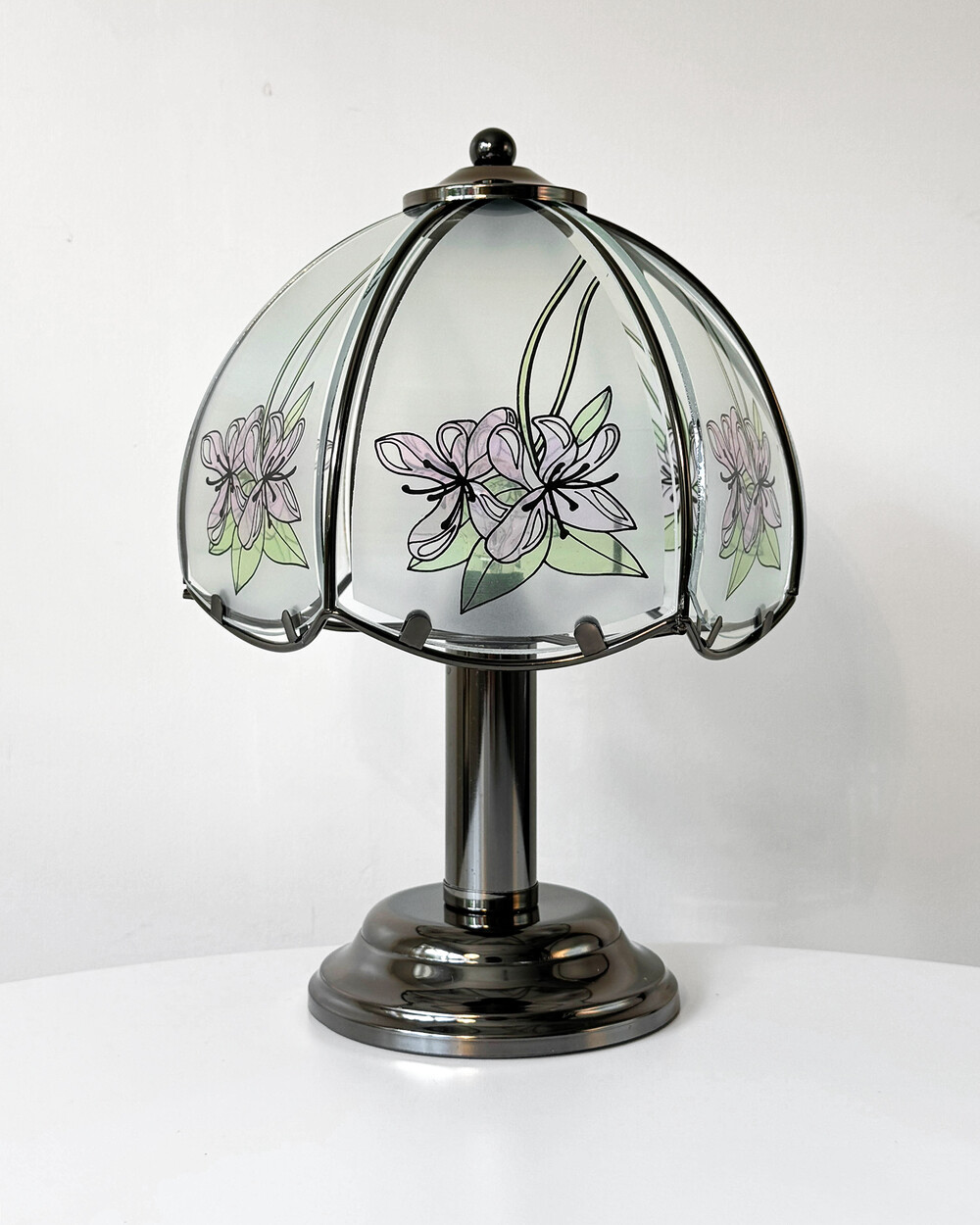 은은한 색감의 플라워 프린트가 장식된 플랫 글라스 테이블 램프로, 1980년대 벨기에 조명 브랜드 Massive에서 제작되었습니다. 메탈 프레임과 베이스 위로 아치형 곡선을 이루는 글라스 패널이 둘러져 있으며, 점등 시 유리를 통과한 빛이 섬세한 그림자를 드리워 공간에 따듯한 분위기를 더합니다.
