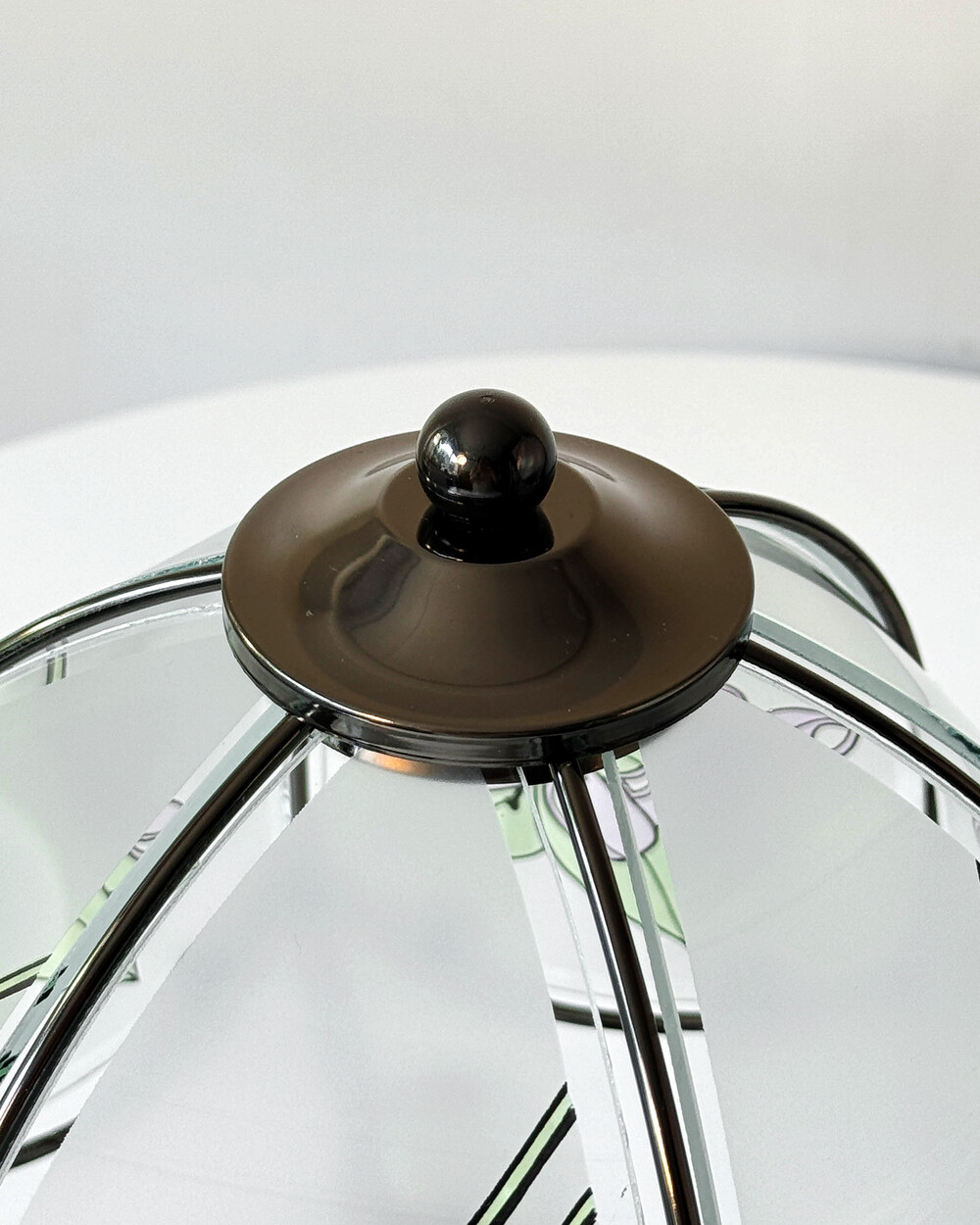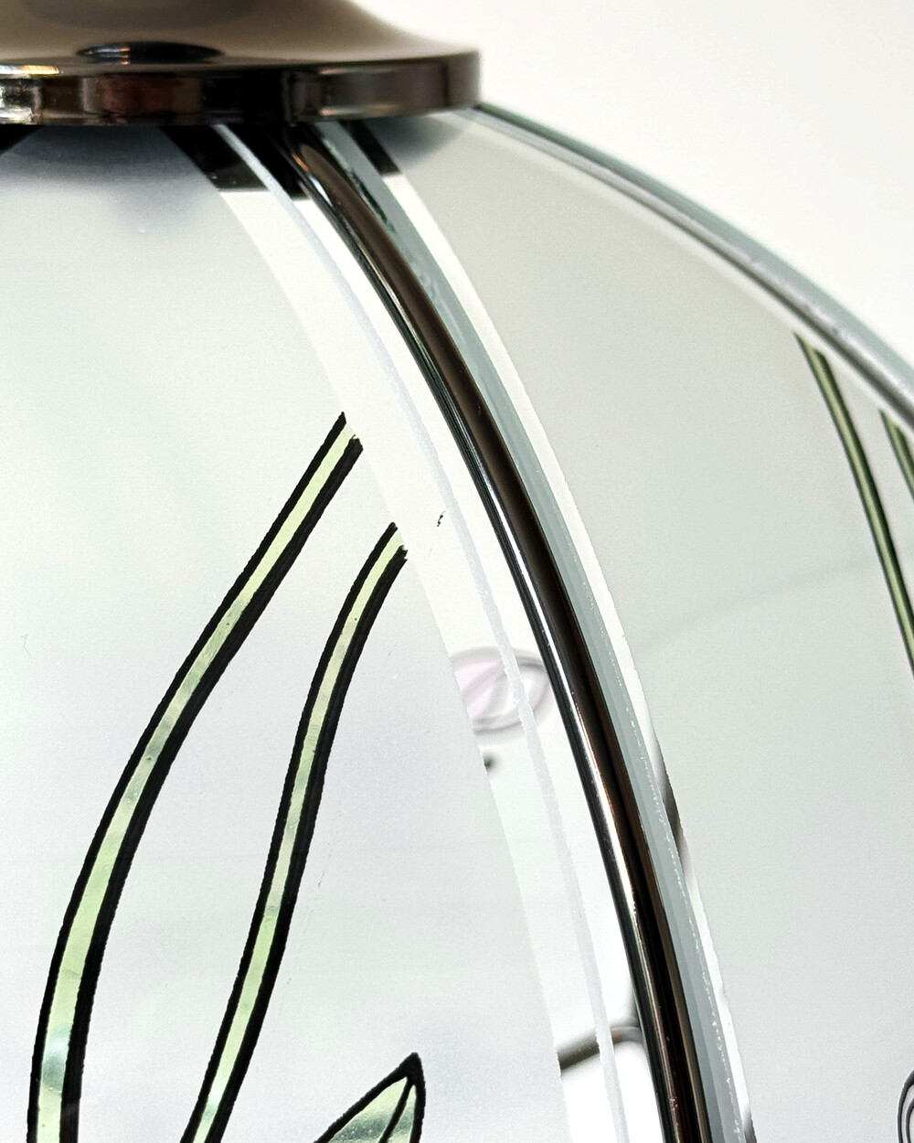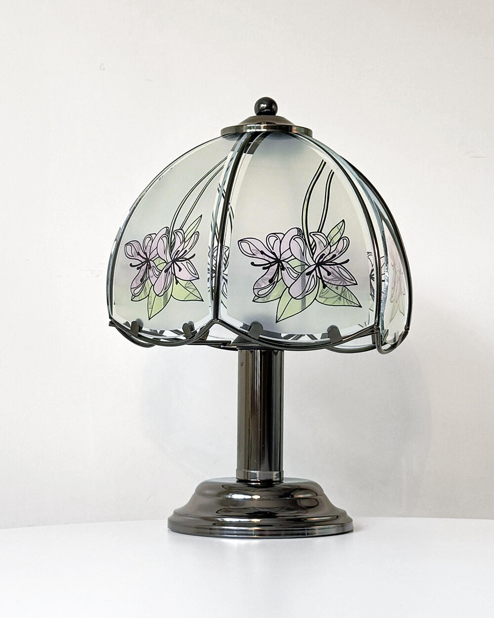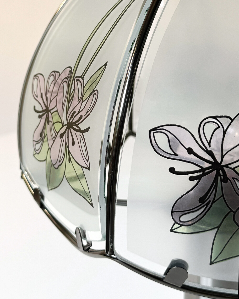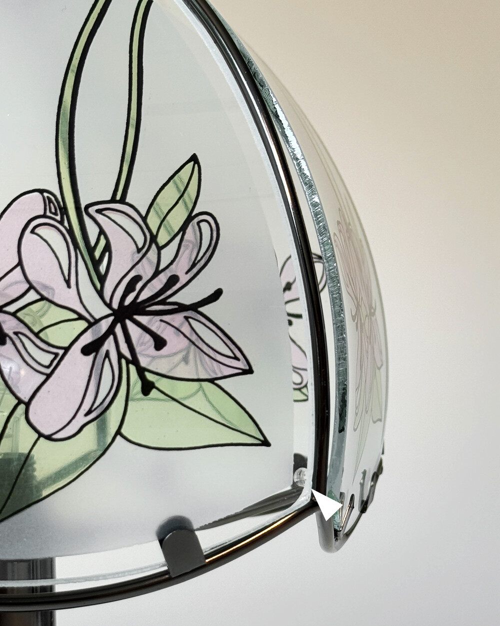 은은한 색감의 플라워 프린트가 장식된 플랫 글라스 테이블 램프로, 1980년대 벨기에 조명 브랜드 Massive에서 제작되었습니다. 메탈 프레임과 베이스 위로 아치형 곡선을 이루는 글라스 패널이 둘러져 있으며, 점등 시 유리를 통과한 빛이 섬세한 그림자를 드리워 공간에 따듯한 분위기를 더합니다.