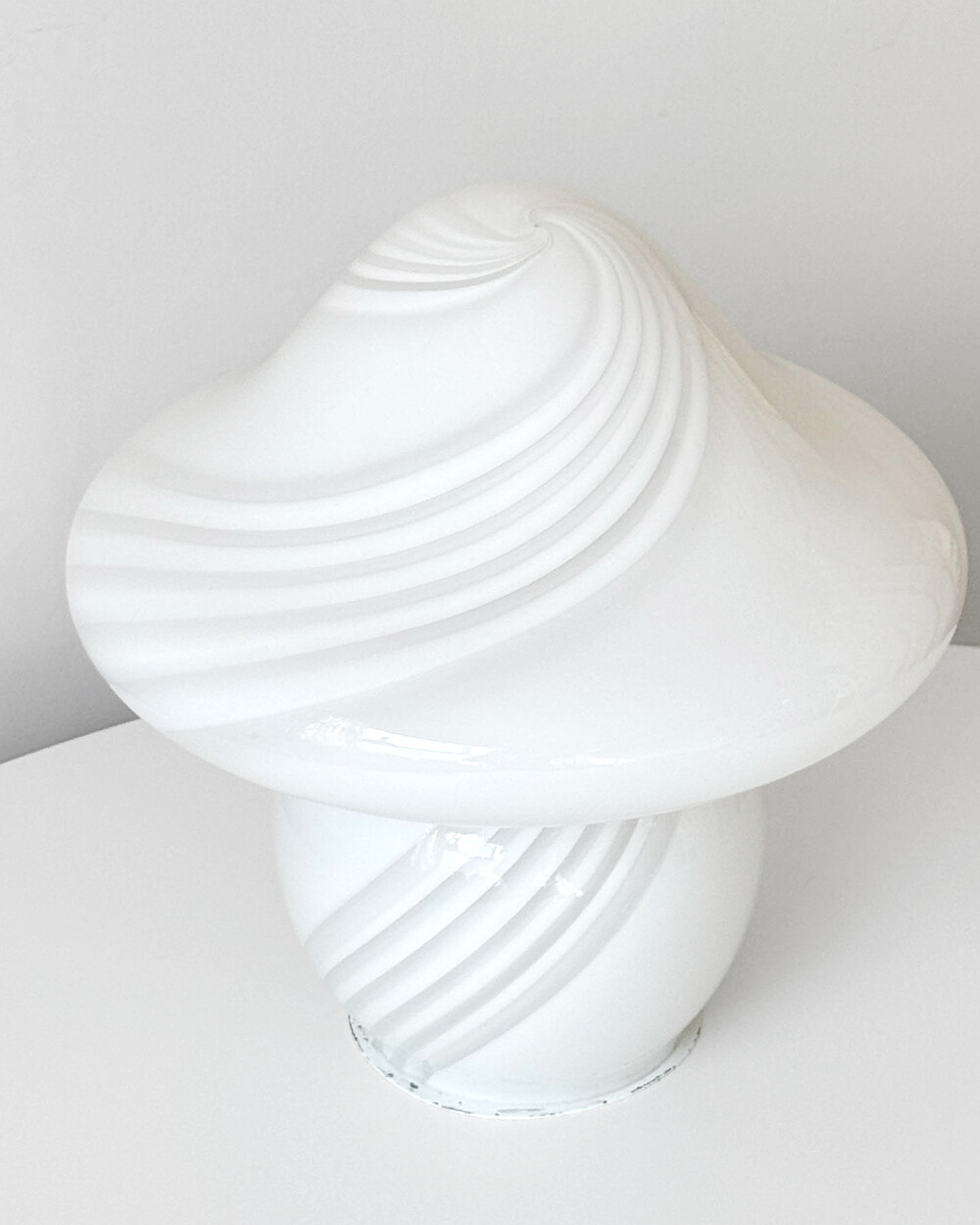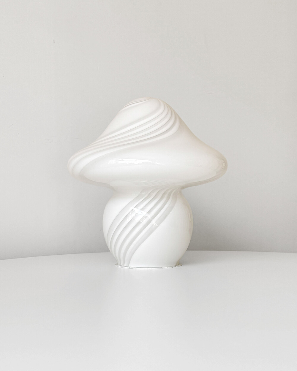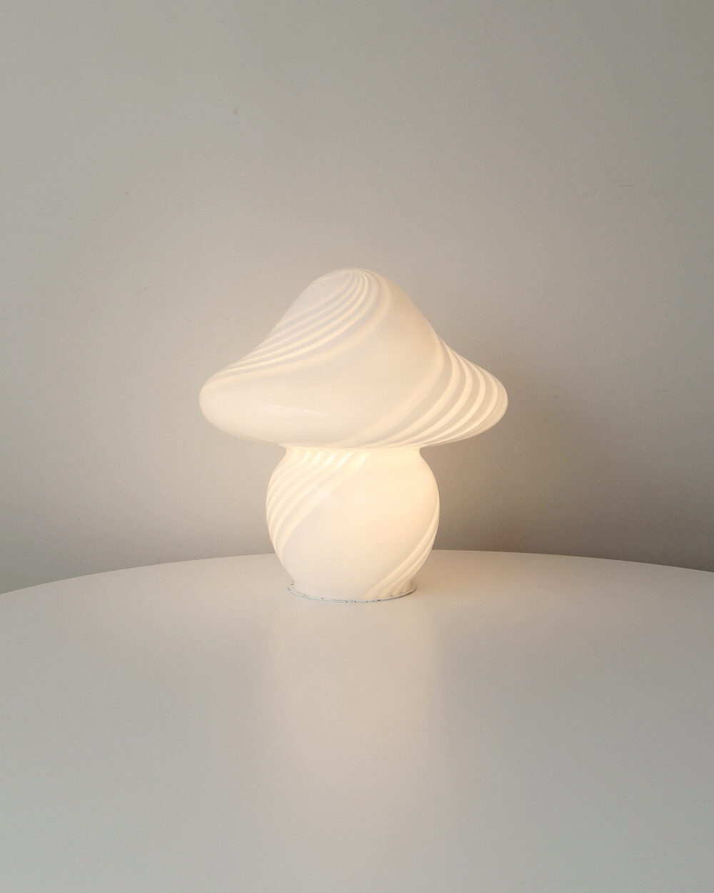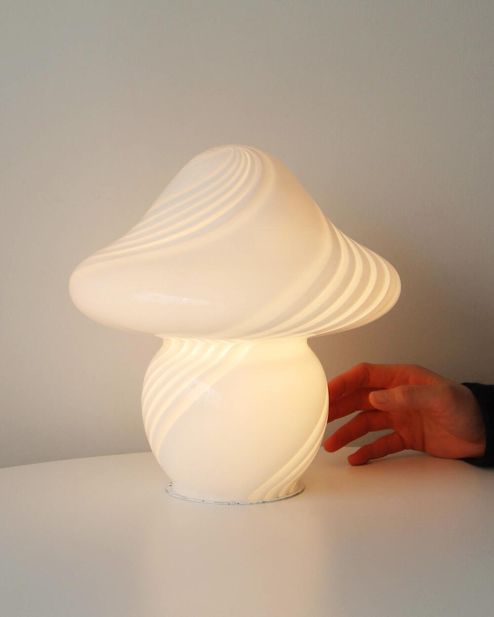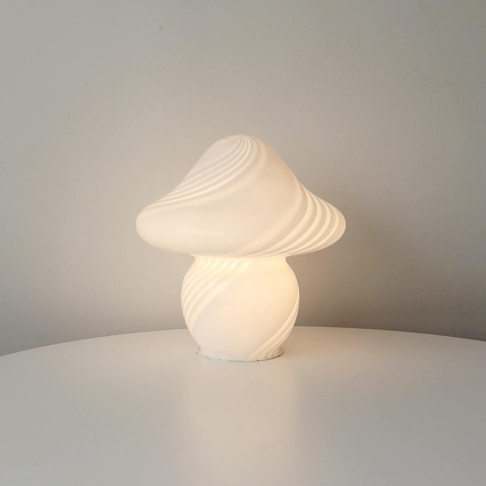 나선형으로 흐르는 유리의 선과 둥근 버섯 형태의 실루엣을 가진 1980년대 머쉬룸 테이블 램프입니다. 유리 공예로 세계적인 명성을 지닌 이탈리아 무라노 섬의 숙련된 장인이 제작한 핸드블로운 글라스 조명으로, 점등 시 표면을 따라 빛이 부드럽게 번지며 조형적인 아름다움과 예술적 존재감을 드러냅니다.