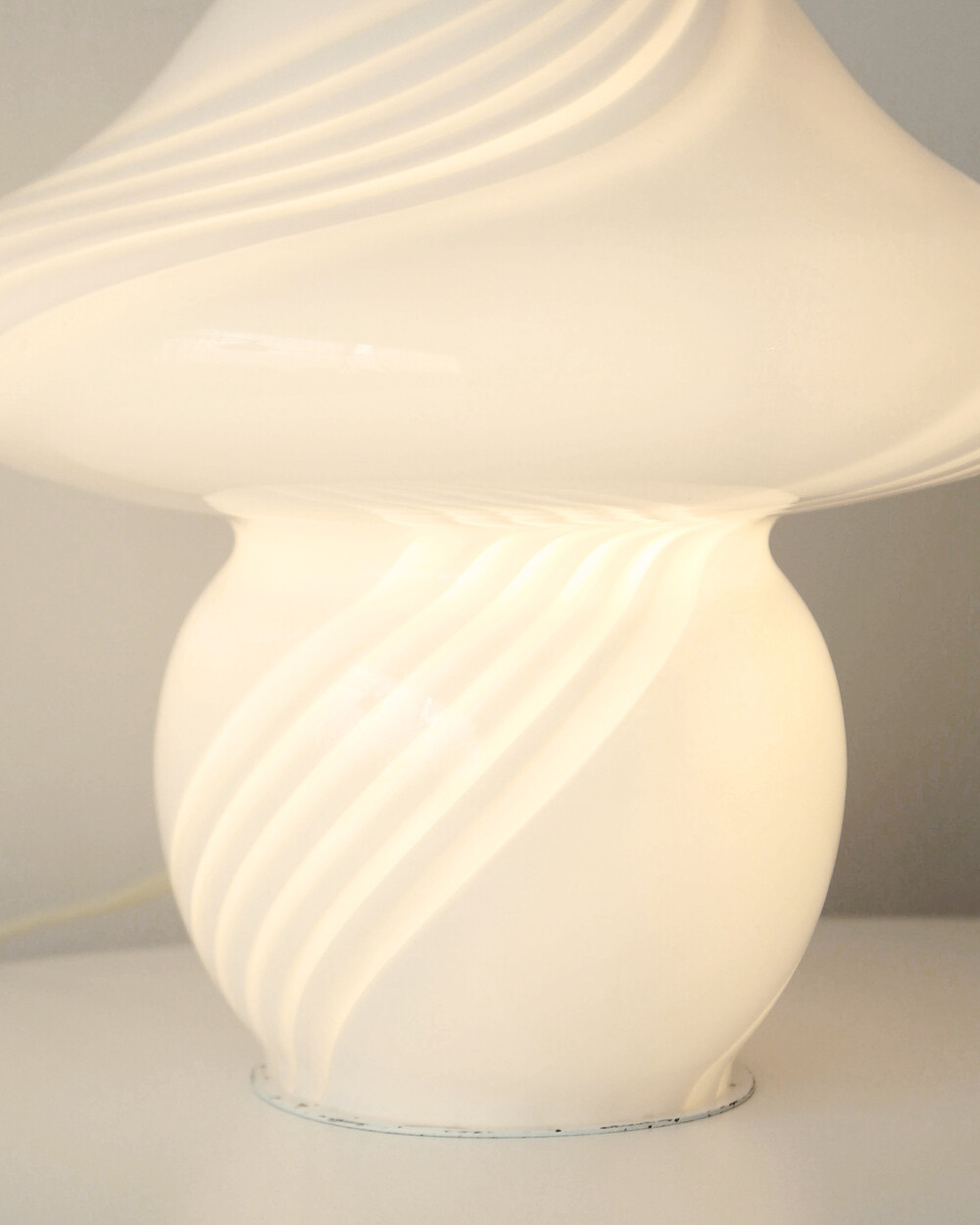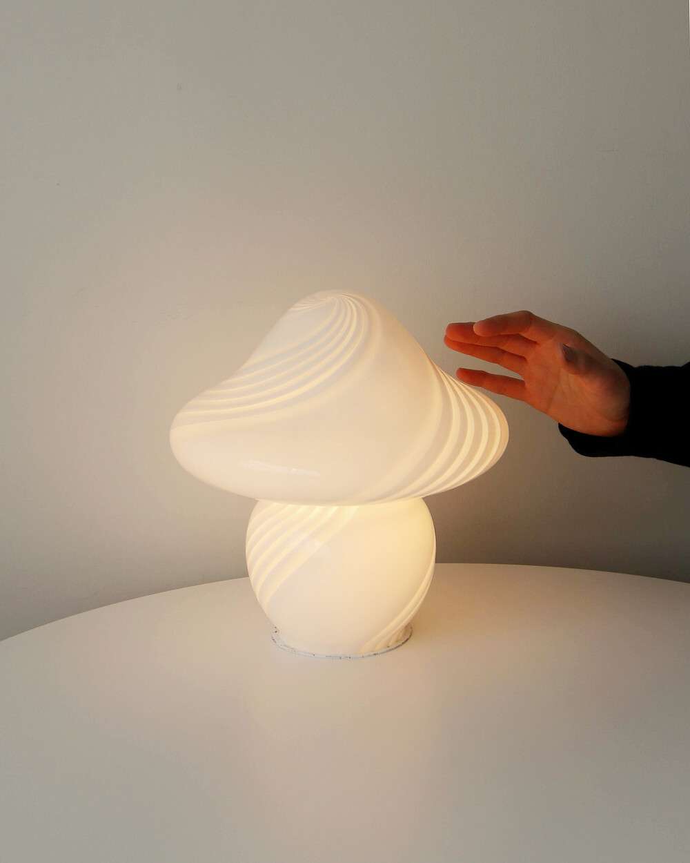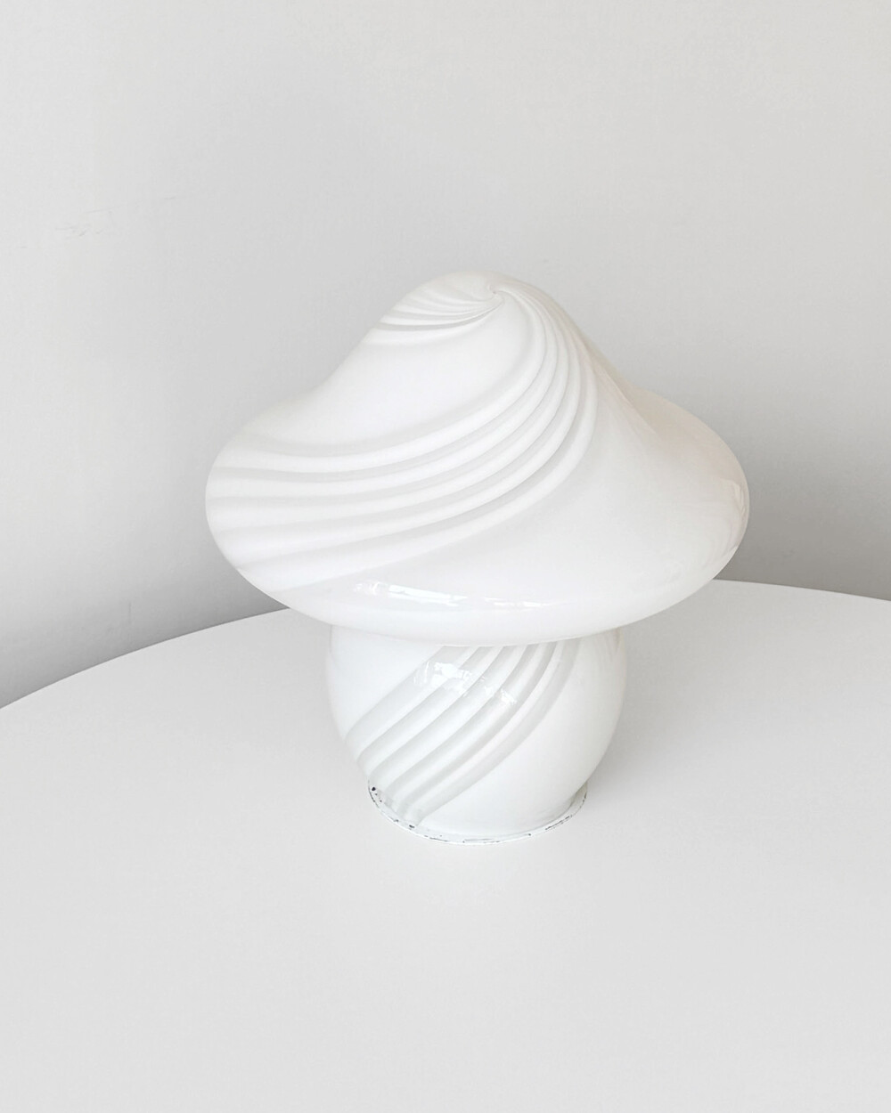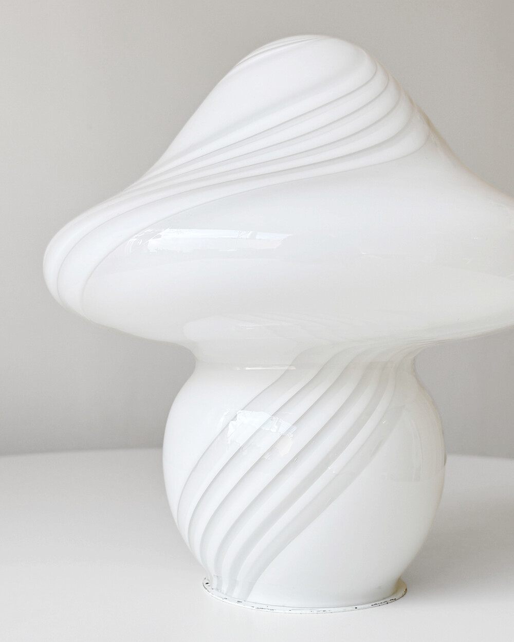 나선형으로 흐르는 유리의 선과 둥근 버섯 형태의 실루엣을 가진 1980년대 머쉬룸 테이블 램프입니다. 유리 공예로 세계적인 명성을 지닌 이탈리아 무라노 섬의 숙련된 장인이 제작한 핸드블로운 글라스 조명으로, 점등 시 표면을 따라 빛이 부드럽게 번지며 조형적인 아름다움과 예술적 존재감을 드러냅니다.