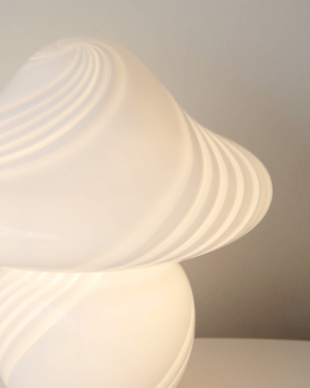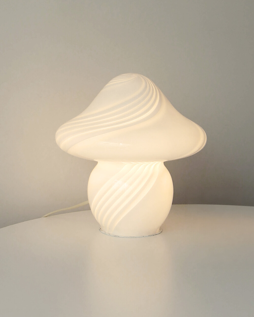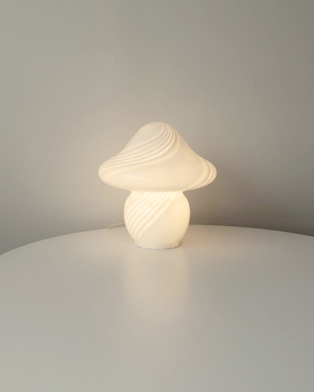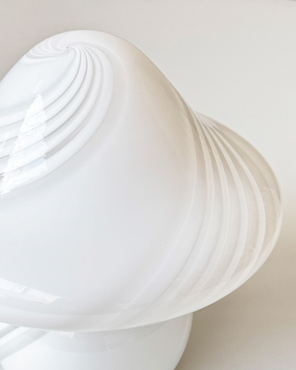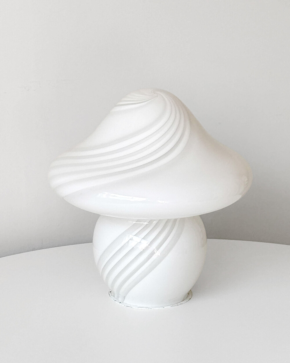 나선형으로 흐르는 유리의 선과 둥근 버섯 형태의 실루엣을 가진 1980년대 머쉬룸 테이블 램프입니다. 유리 공예로 세계적인 명성을 지닌 이탈리아 무라노 섬의 숙련된 장인이 제작한 핸드블로운 글라스 조명으로, 점등 시 표면을 따라 빛이 부드럽게 번지며 조형적인 아름다움과 예술적 존재감을 드러냅니다.
