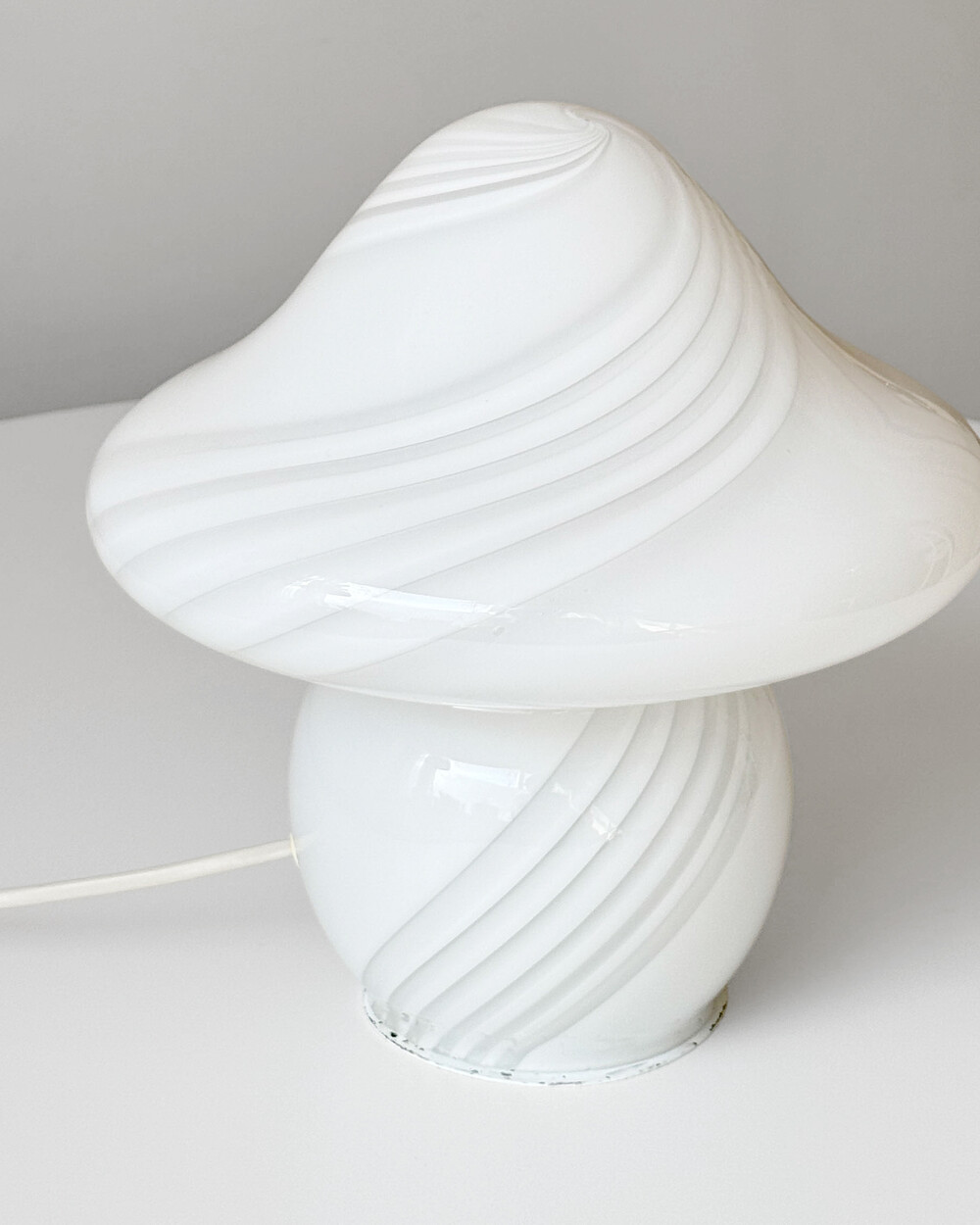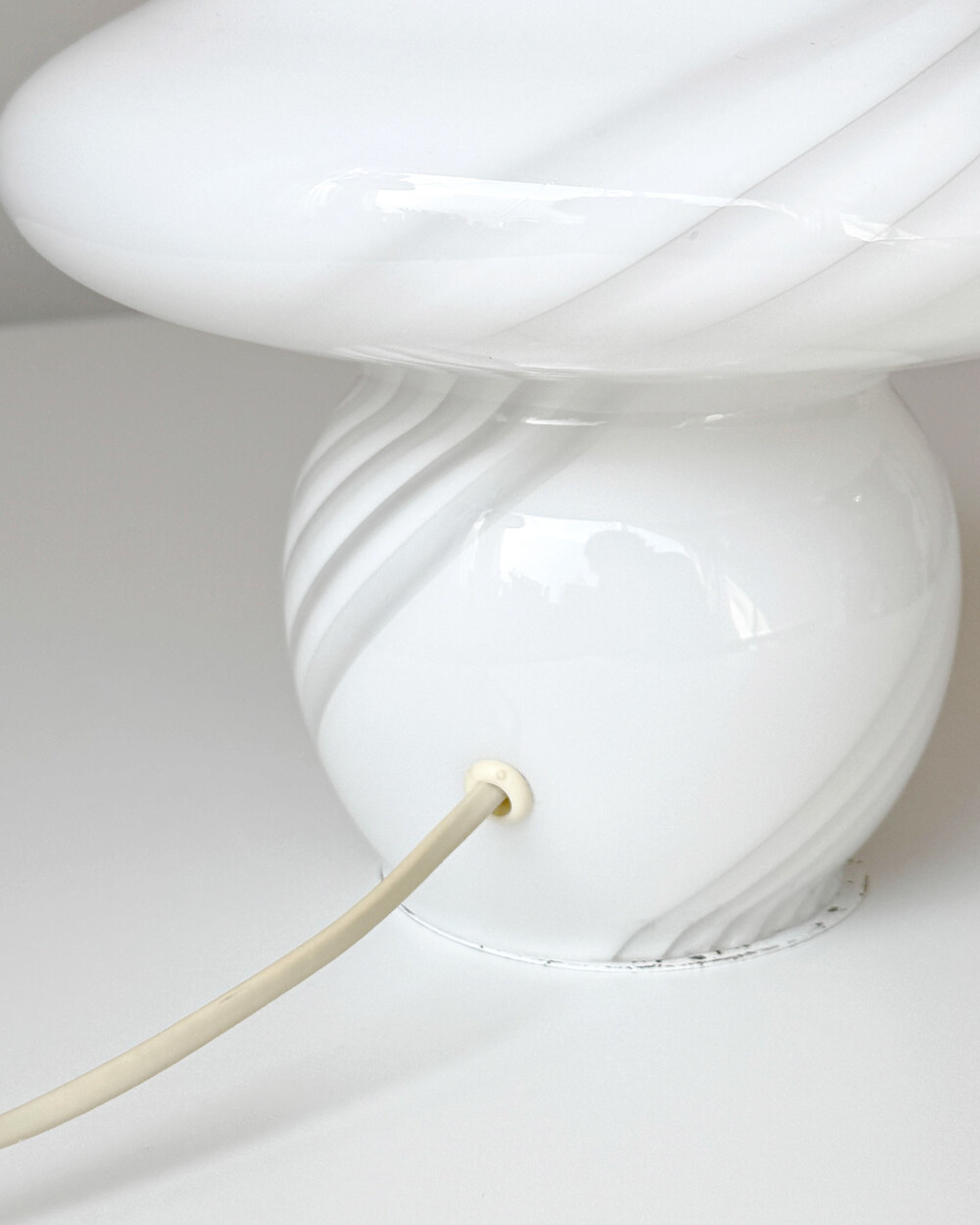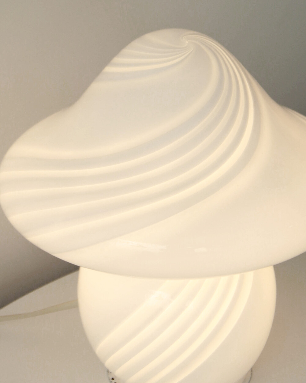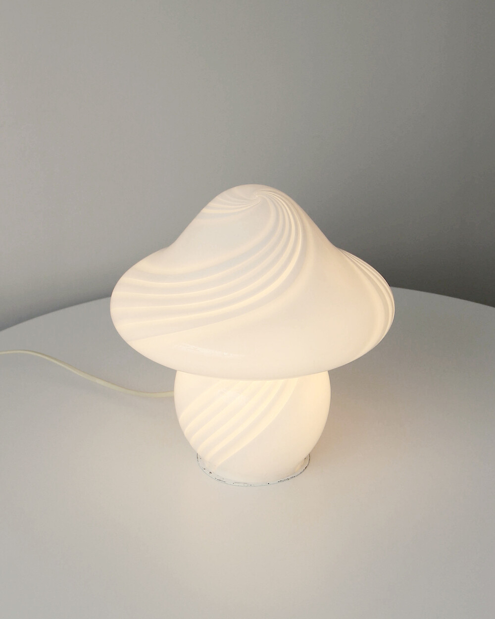 나선형으로 흐르는 유리의 선과 둥근 버섯 형태의 실루엣을 가진 1980년대 머쉬룸 테이블 램프입니다. 유리 공예로 세계적인 명성을 지닌 이탈리아 무라노 섬의 숙련된 장인이 제작한 핸드블로운 글라스 조명으로, 점등 시 표면을 따라 빛이 부드럽게 번지며 조형적인 아름다움과 예술적 존재감을 드러냅니다.