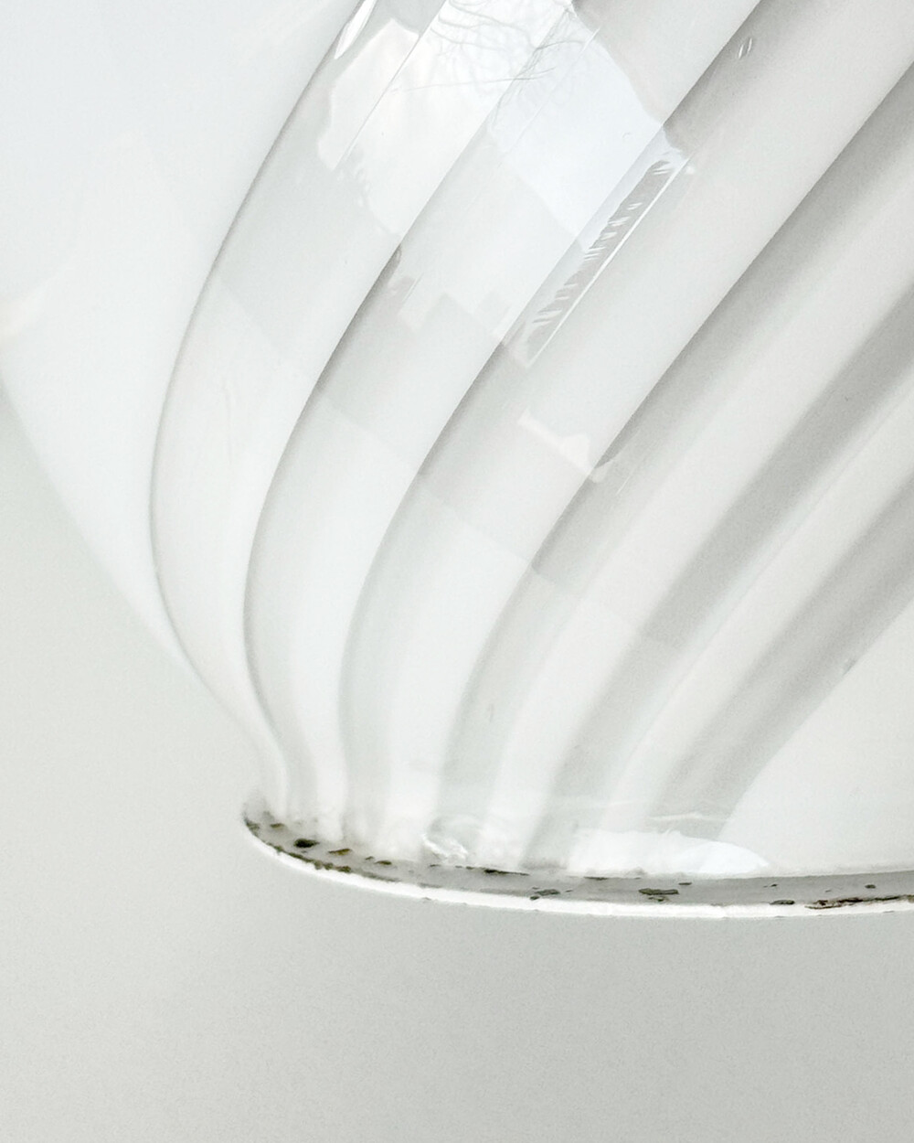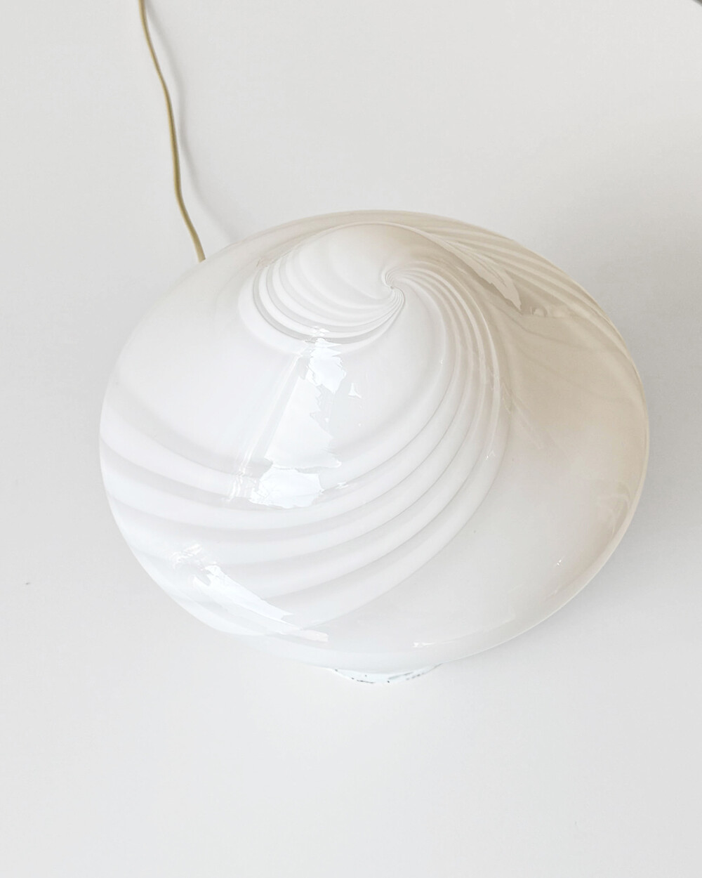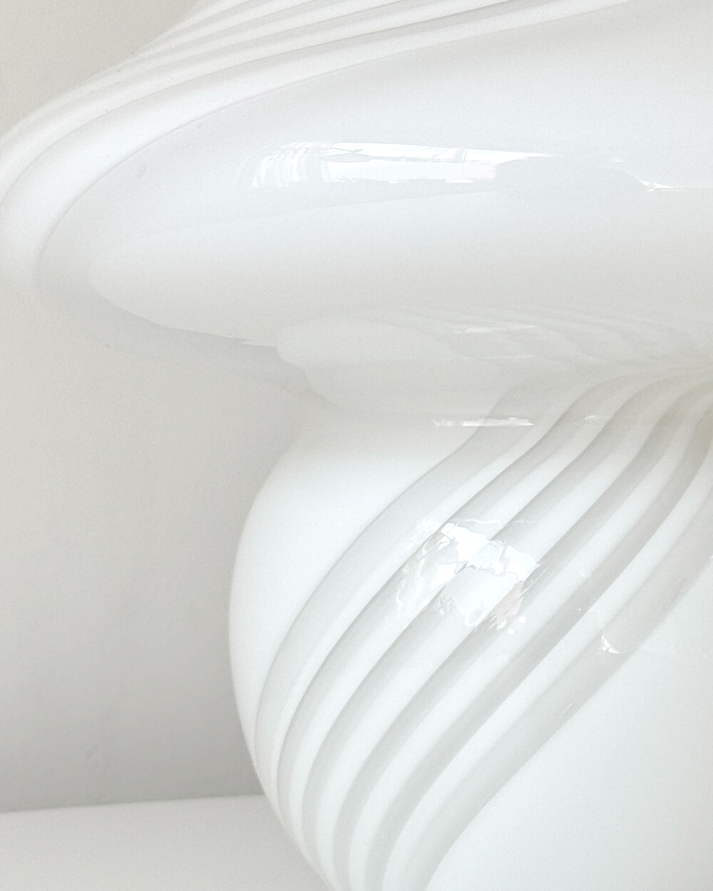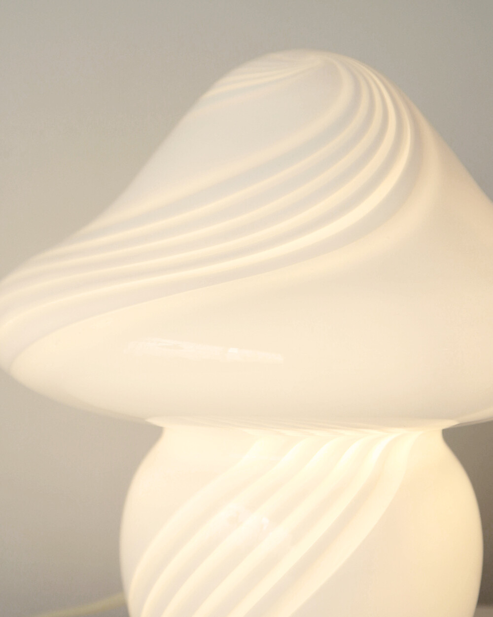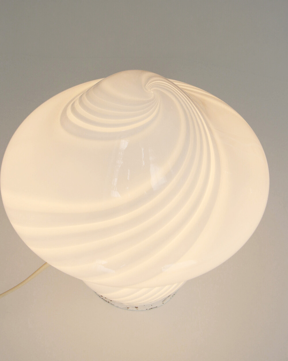 나선형으로 흐르는 유리의 선과 둥근 버섯 형태의 실루엣을 가진 1980년대 머쉬룸 테이블 램프입니다. 유리 공예로 세계적인 명성을 지닌 이탈리아 무라노 섬의 숙련된 장인이 제작한 핸드블로운 글라스 조명으로, 점등 시 표면을 따라 빛이 부드럽게 번지며 조형적인 아름다움과 예술적 존재감을 드러냅니다.