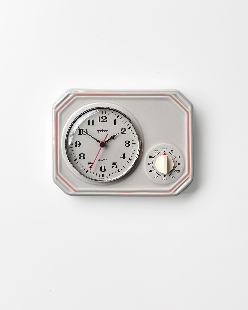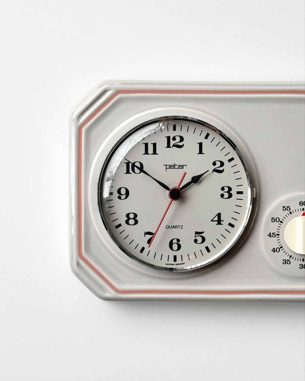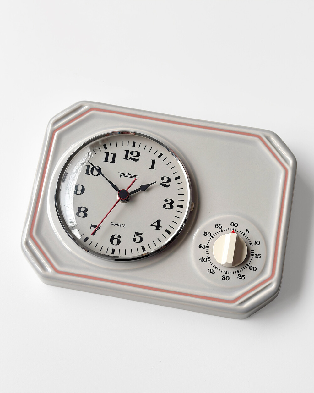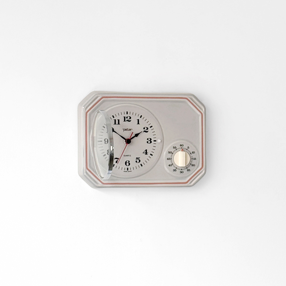 부드러운 그레이 세라믹 바디에 핑크 라인이 더해진 1980년대 서독일의 시계회사 Peter에서 제작된 벽시계입니다. 에그타이머 다이얼이 함께 구성된 실용적인 디자인으로, 단정한 형태와 귀여운 색감이 조화를 이룹니다.
