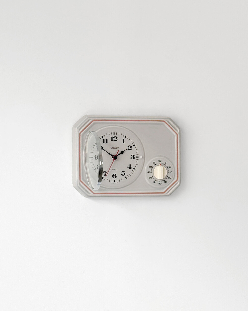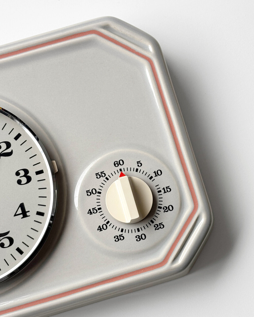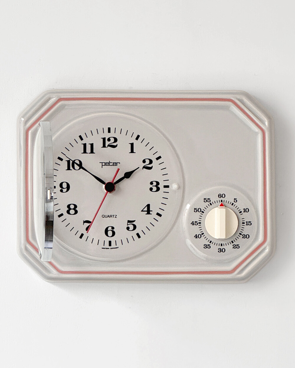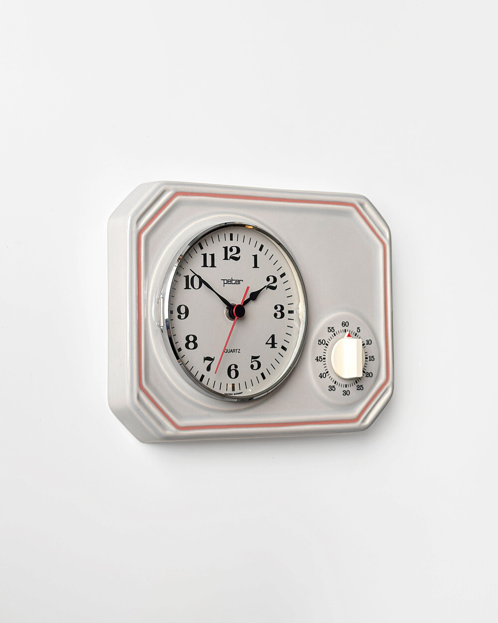 부드러운 그레이 세라믹 바디에 핑크 라인이 더해진 1980년대 서독일의 시계회사 Peter에서 제작된 벽시계입니다. 에그타이머 다이얼이 함께 구성된 실용적인 디자인으로, 단정한 형태와 귀여운 색감이 조화를 이룹니다.