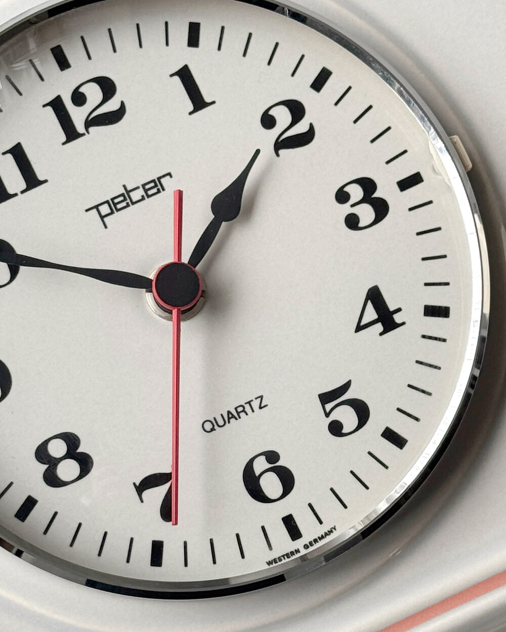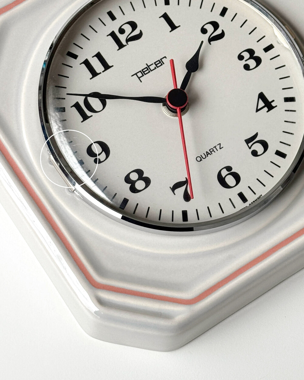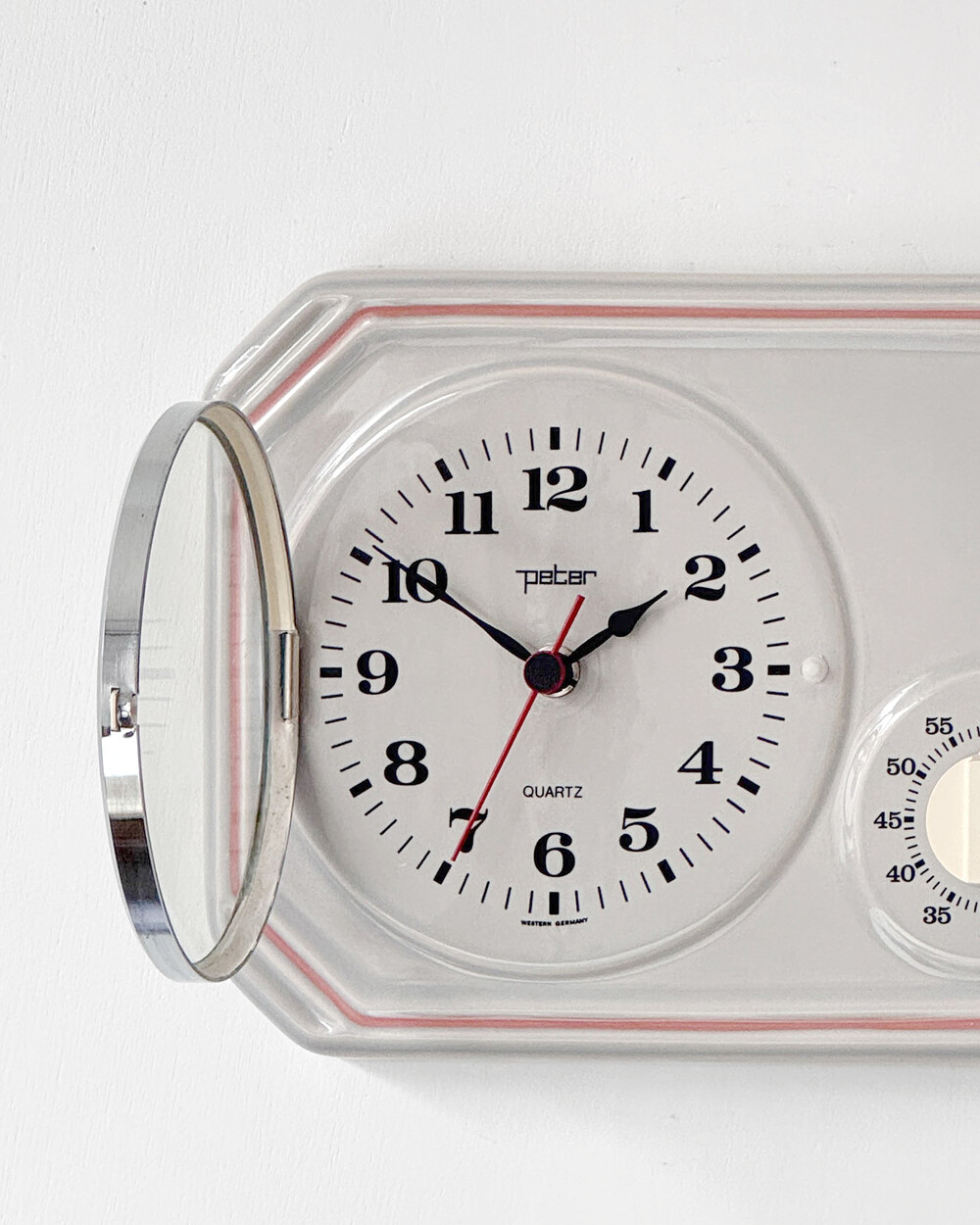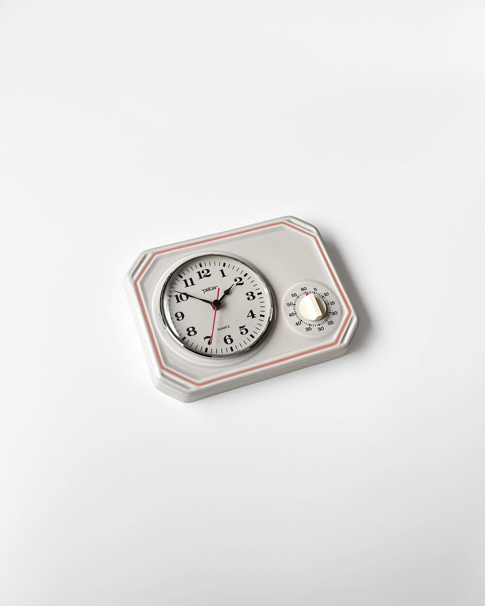 부드러운 그레이 세라믹 바디에 핑크 라인이 더해진 1980년대 서독일의 시계회사 Peter에서 제작된 벽시계입니다. 에그타이머 다이얼이 함께 구성된 실용적인 디자인으로, 단정한 형태와 귀여운 색감이 조화를 이룹니다.