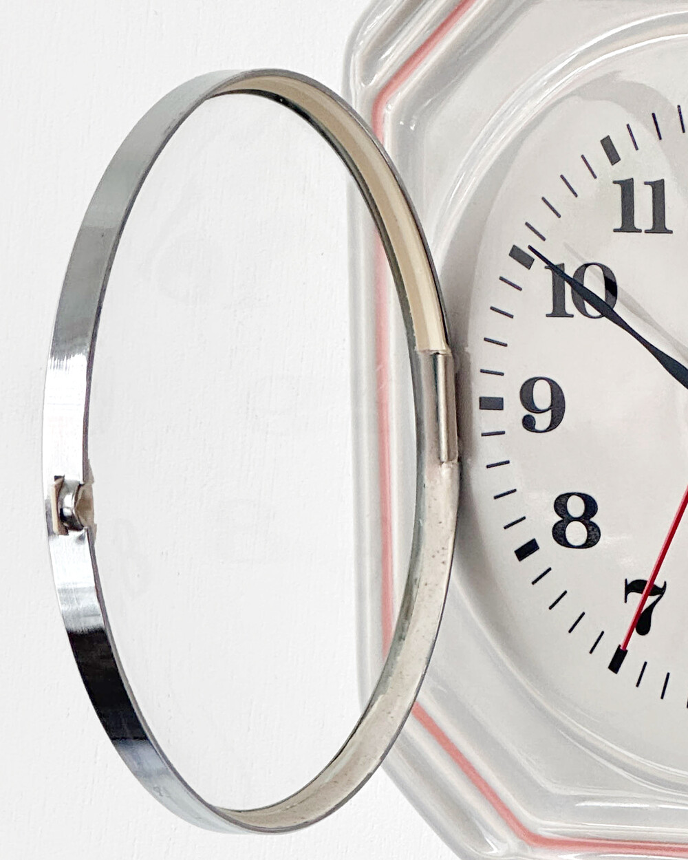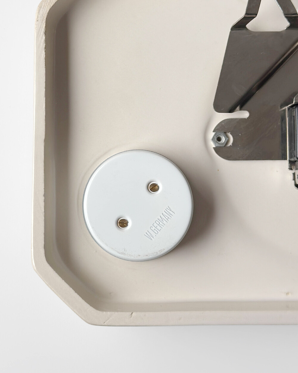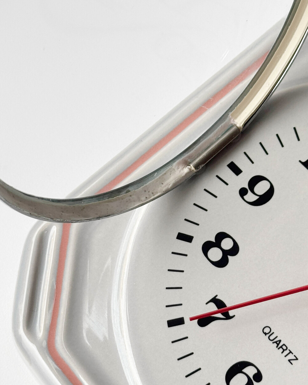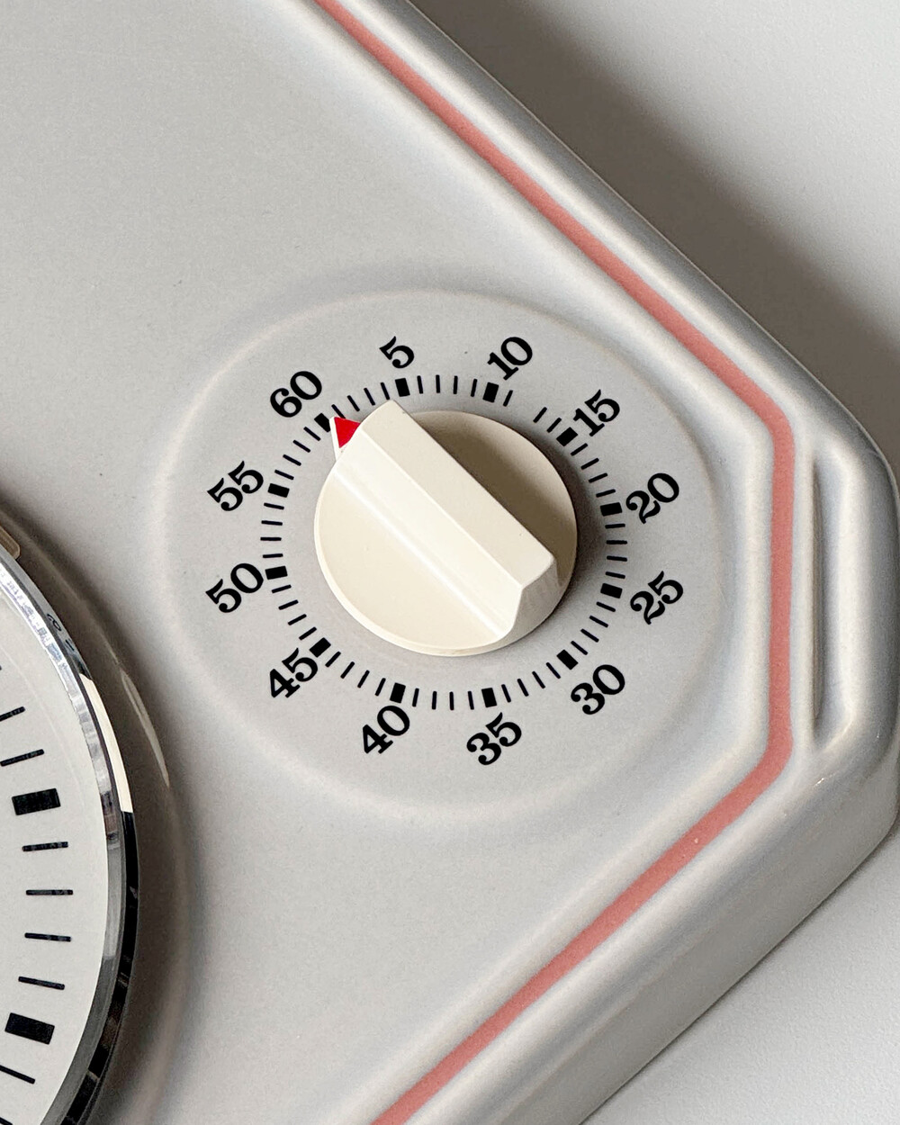 부드러운 그레이 세라믹 바디에 핑크 라인이 더해진 1980년대 서독일의 시계회사 Peter에서 제작된 벽시계입니다. 에그타이머 다이얼이 함께 구성된 실용적인 디자인으로, 단정한 형태와 귀여운 색감이 조화를 이룹니다.