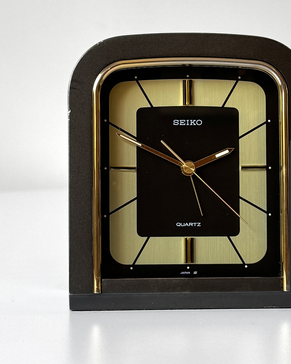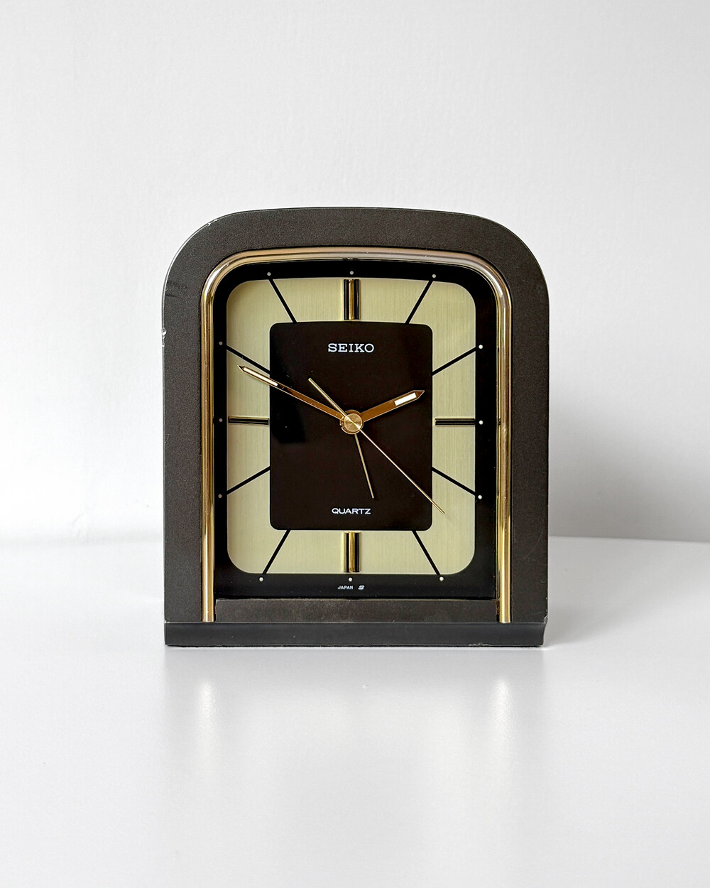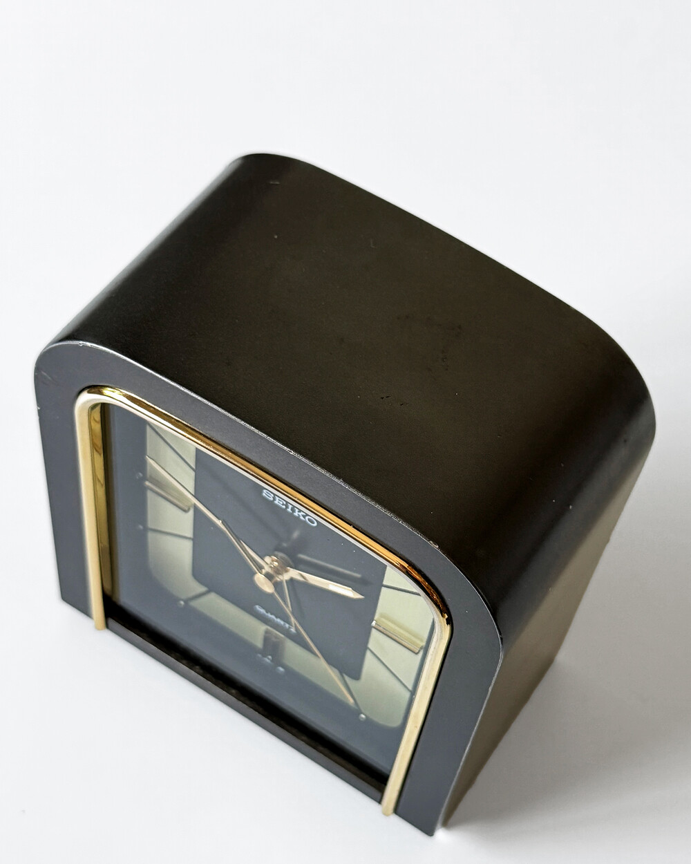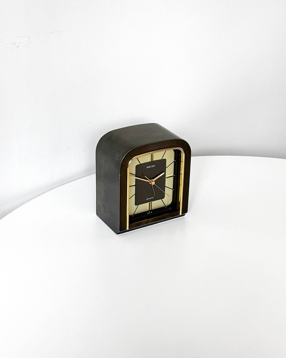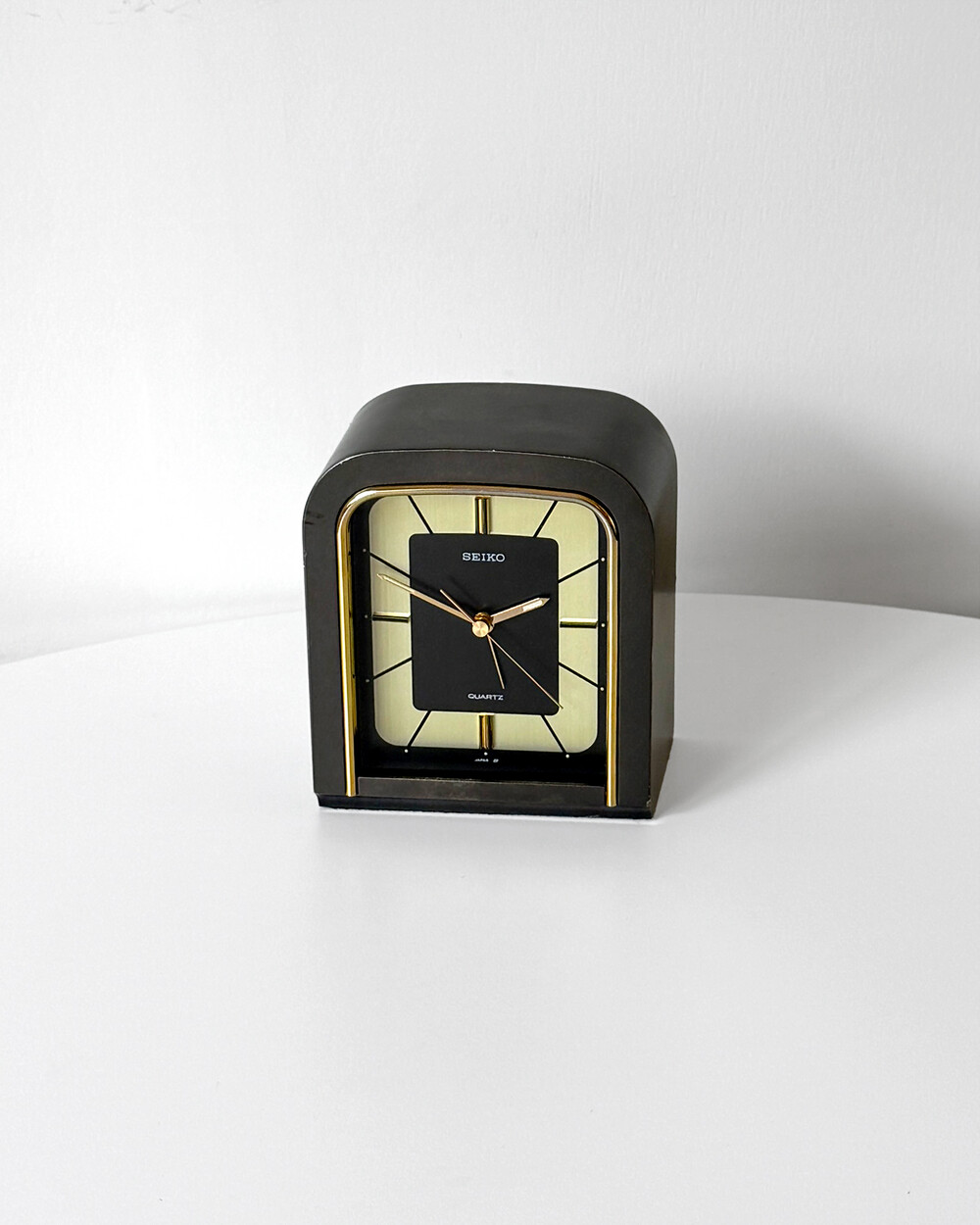 세이코 특유의 고전적이면서도 균형 잡힌 미감이 잘 드러나는 1980년대 탁상시계입니다.모서리가 부드럽게 곡면 처리된 블랙 메탈 케이스에 차분한 골드 디테일이 어우러져 절제된 우아함을 보여줍니다.후면에는 알람 기능을 설정할 수 있는 다이얼과 ON/OFF 스위치가 마련되어 있어 실용성도 갖추고 있습니다.