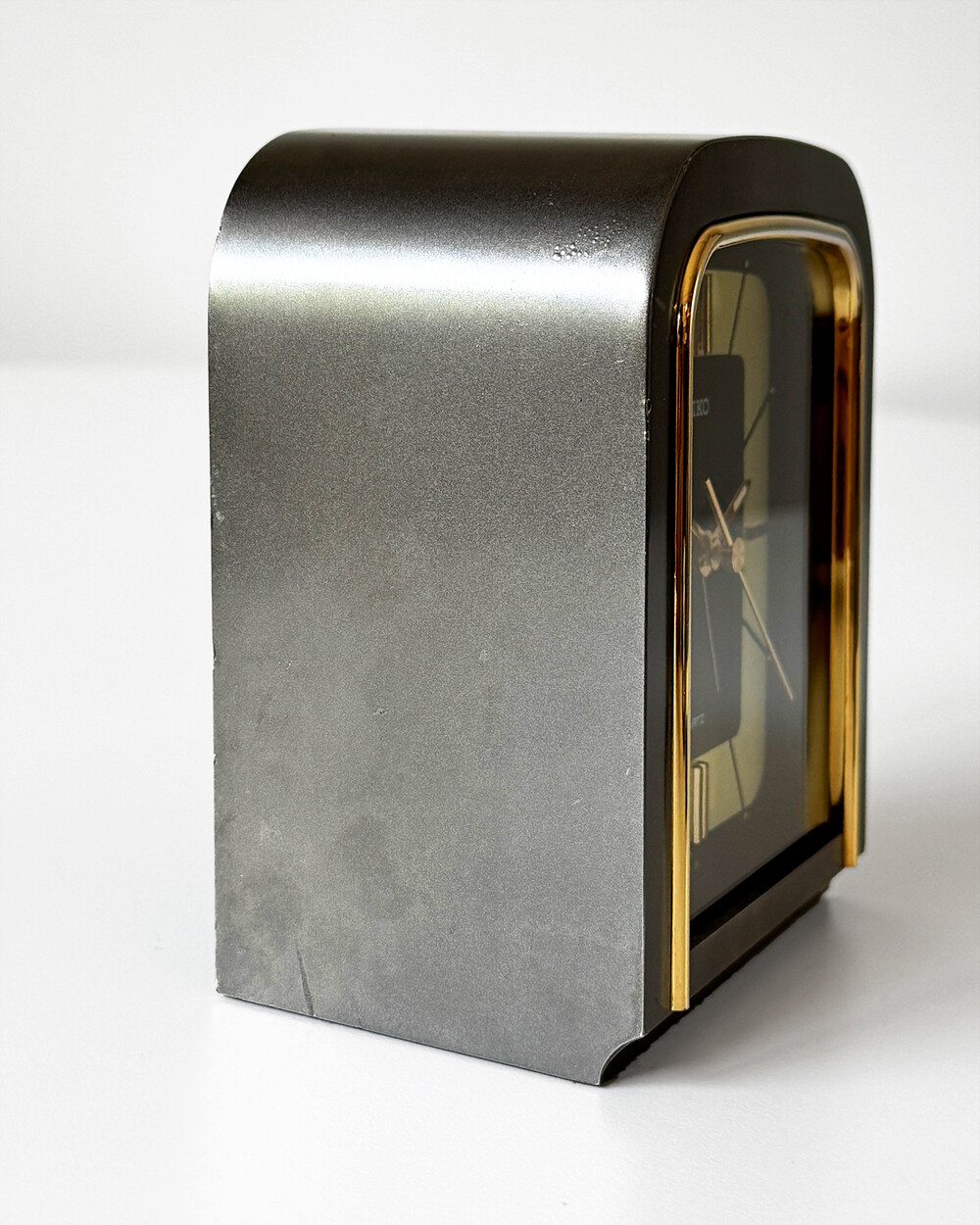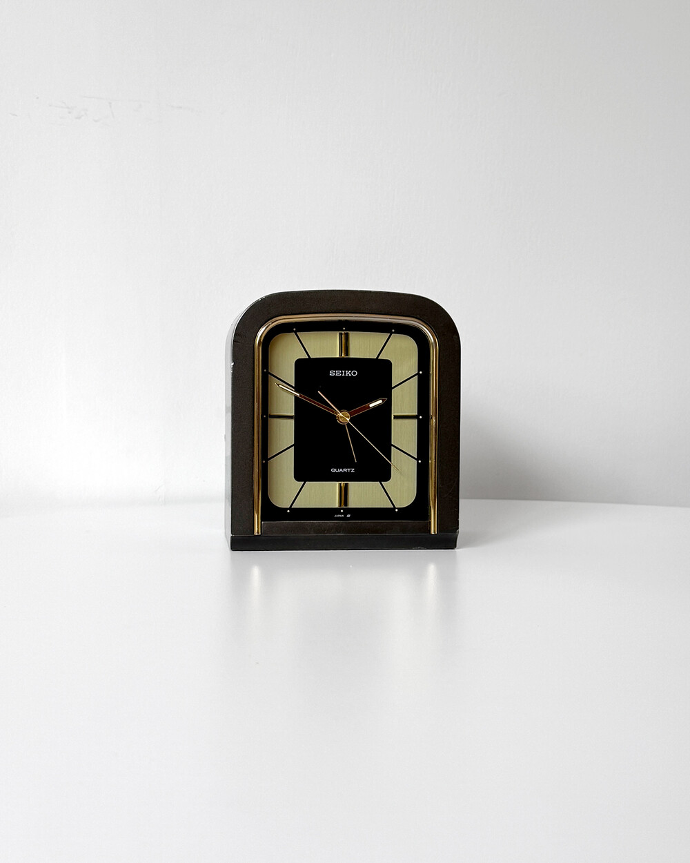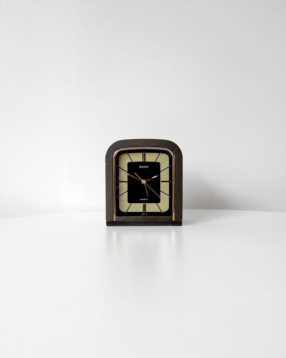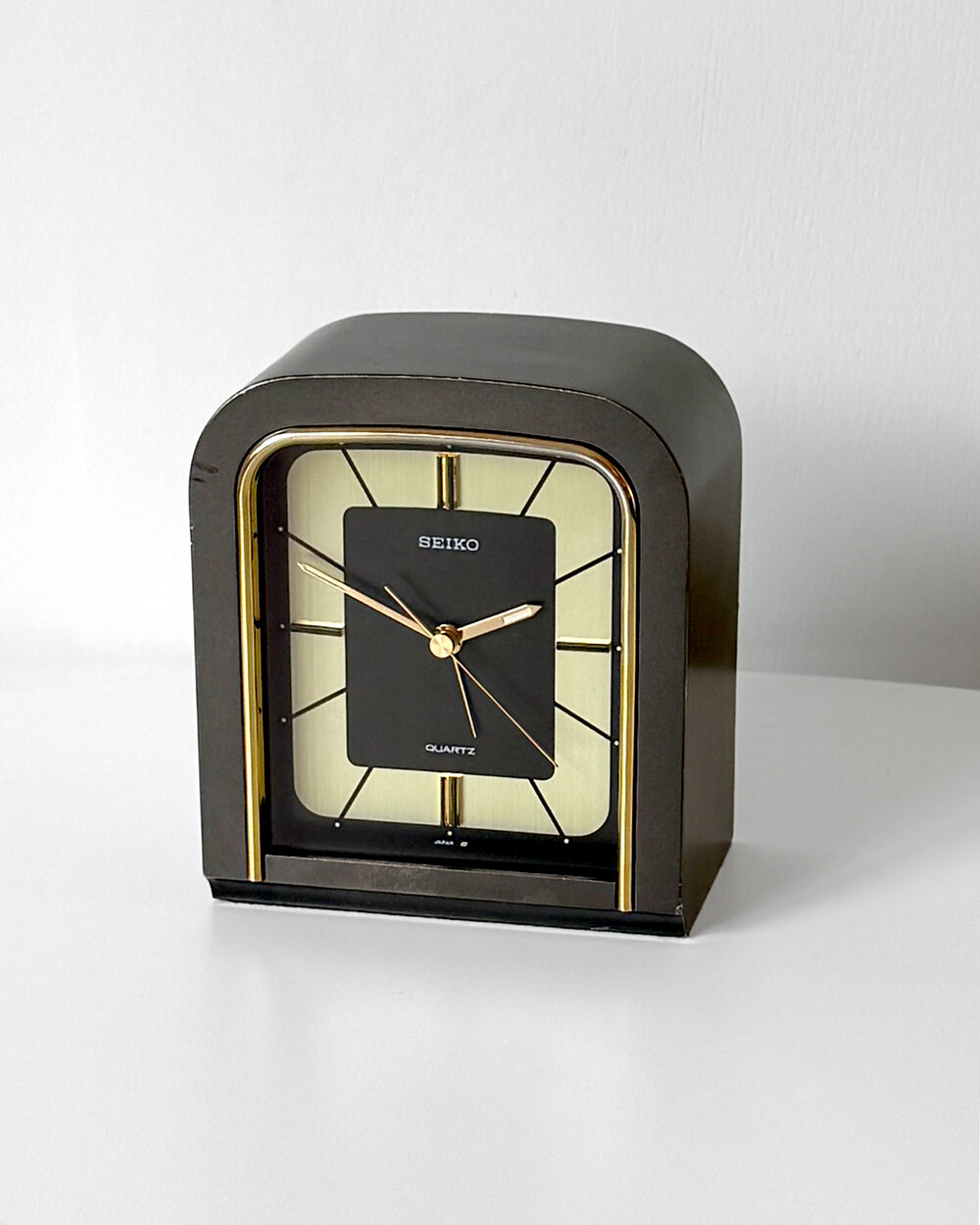 세이코 특유의 고전적이면서도 균형 잡힌 미감이 잘 드러나는 1980년대 탁상시계입니다.모서리가 부드럽게 곡면 처리된 블랙 메탈 케이스에 차분한 골드 디테일이 어우러져 절제된 우아함을 보여줍니다.후면에는 알람 기능을 설정할 수 있는 다이얼과 ON/OFF 스위치가 마련되어 있어 실용성도 갖추고 있습니다.