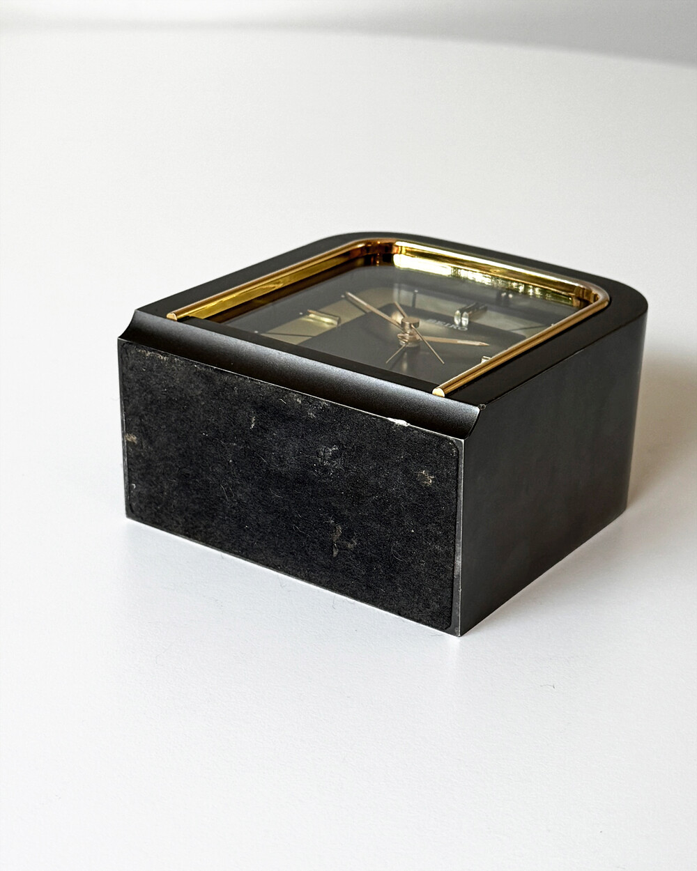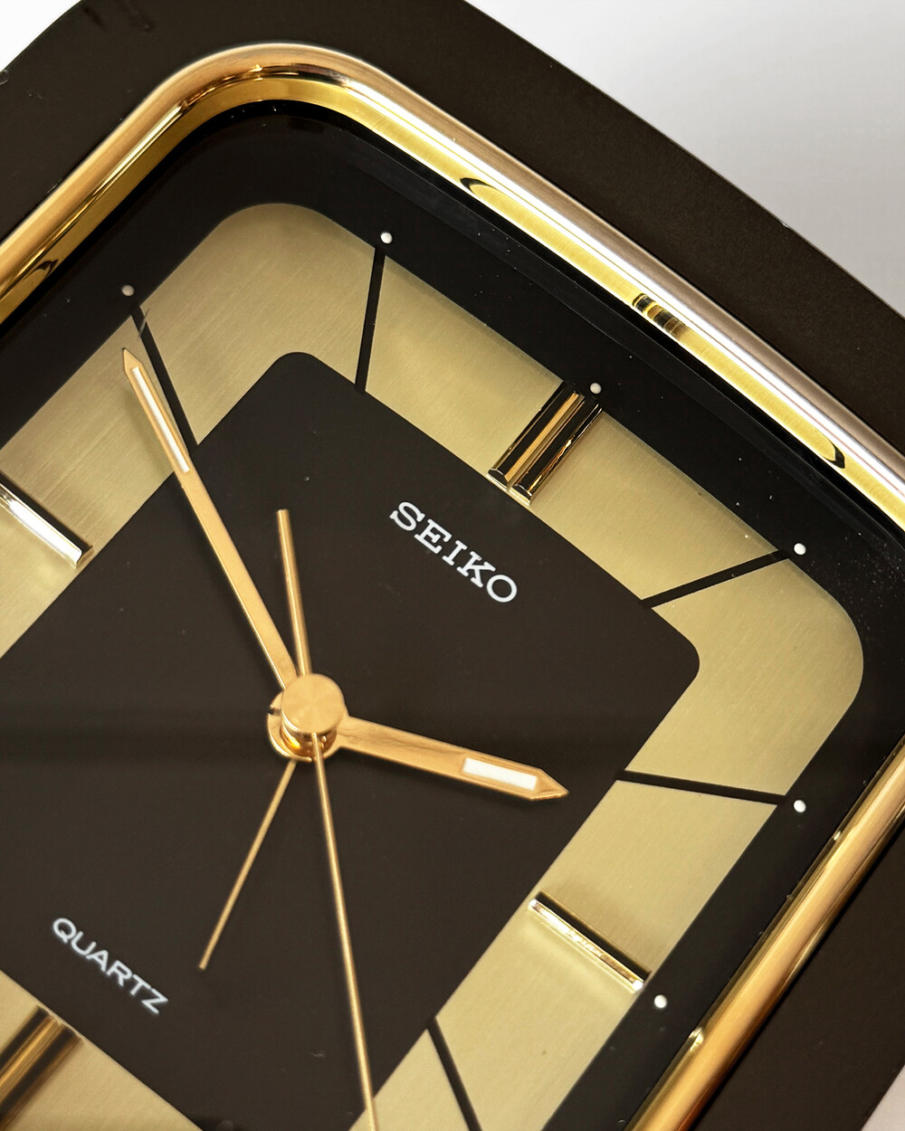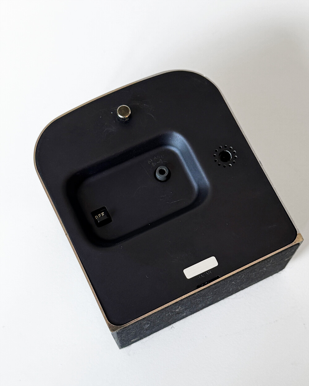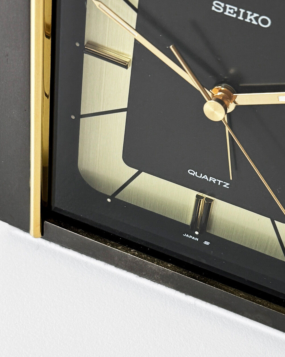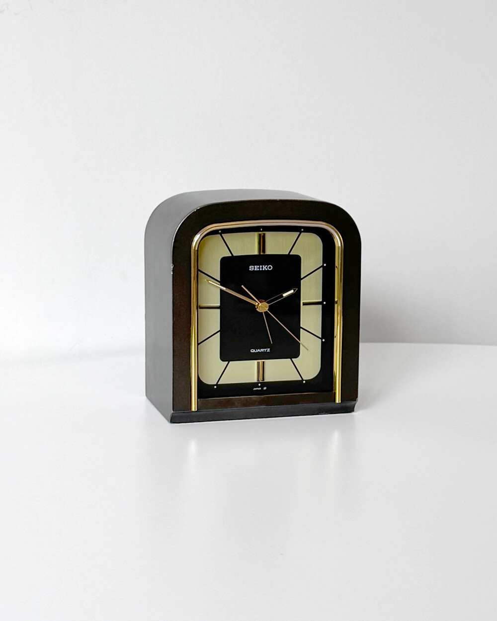 세이코 특유의 고전적이면서도 균형 잡힌 미감이 잘 드러나는 1980년대 탁상시계입니다.모서리가 부드럽게 곡면 처리된 블랙 메탈 케이스에 차분한 골드 디테일이 어우러져 절제된 우아함을 보여줍니다.후면에는 알람 기능을 설정할 수 있는 다이얼과 ON/OFF 스위치가 마련되어 있어 실용성도 갖추고 있습니다.