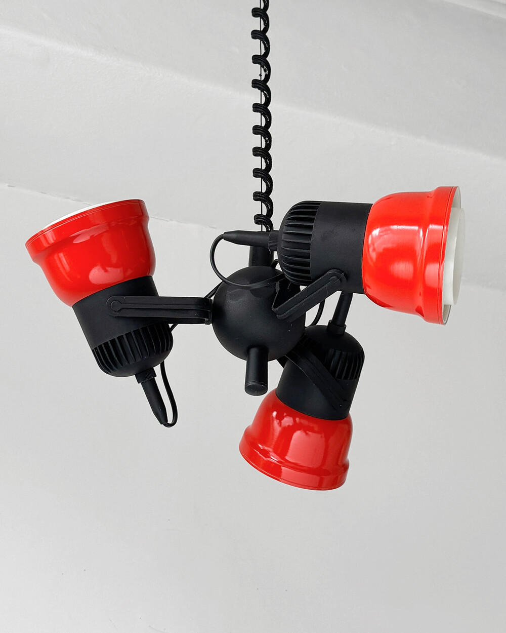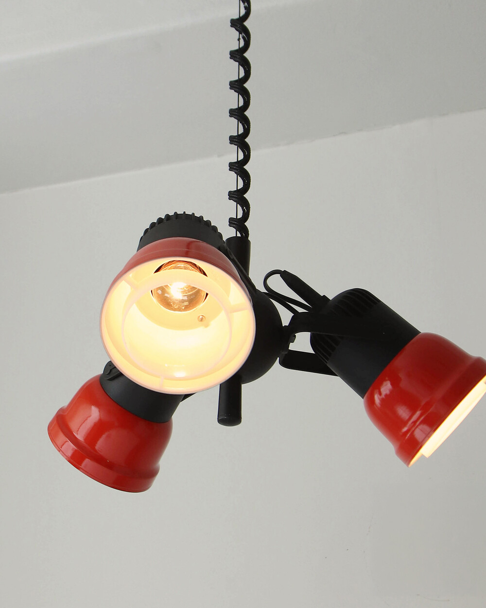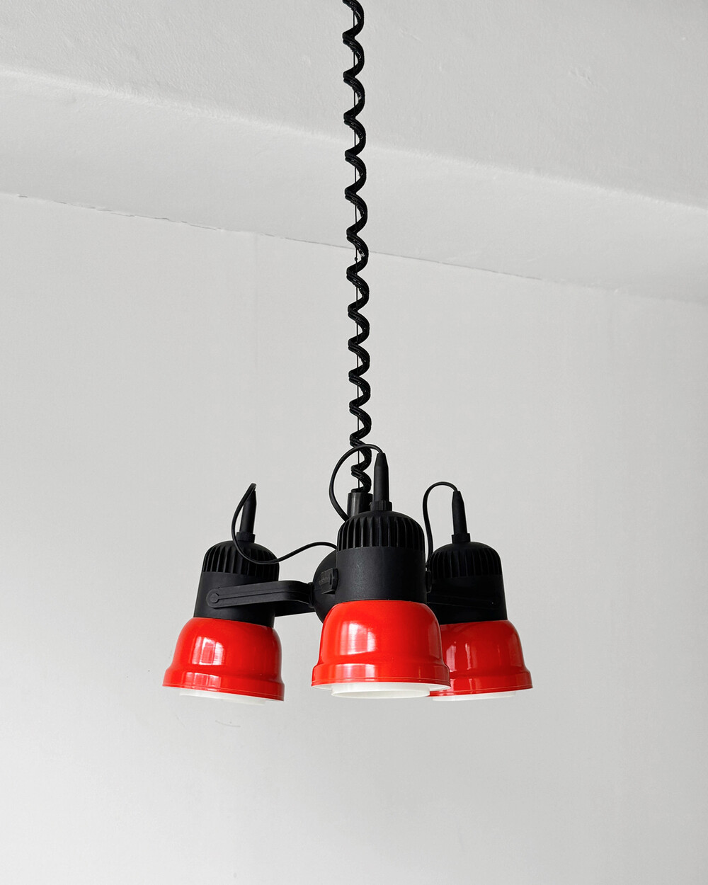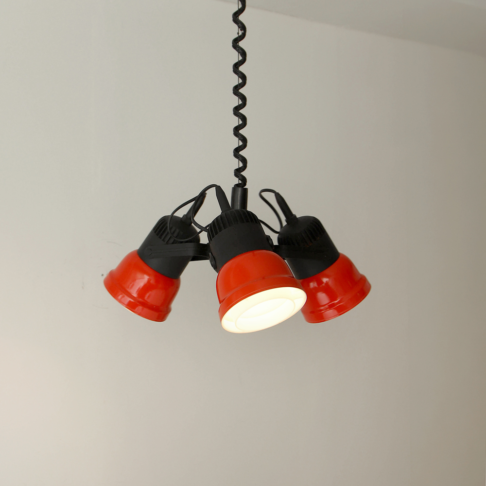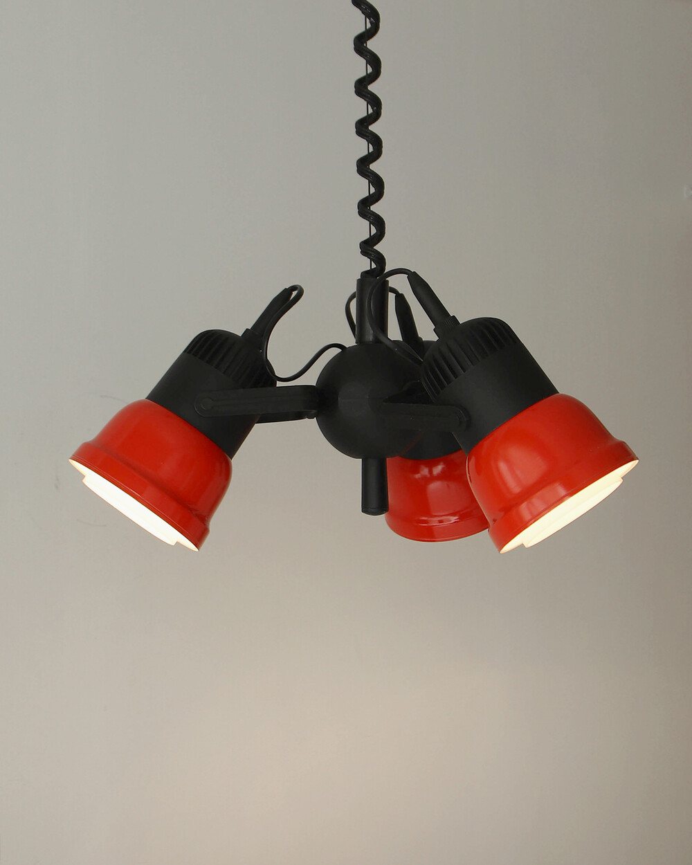 선명한 레드 컬러와 스페이스 에이지 감각이 어우러진 1980년대 폴란드 POLAM PILA의 스팟 펜던트 조명입니다. 블랙 바디와 레드 쉐이드의 대비가 또렷하며, 세 개의 헤드가 만들어내는 조형적인 실루엣이 인상적인 모델입니다.