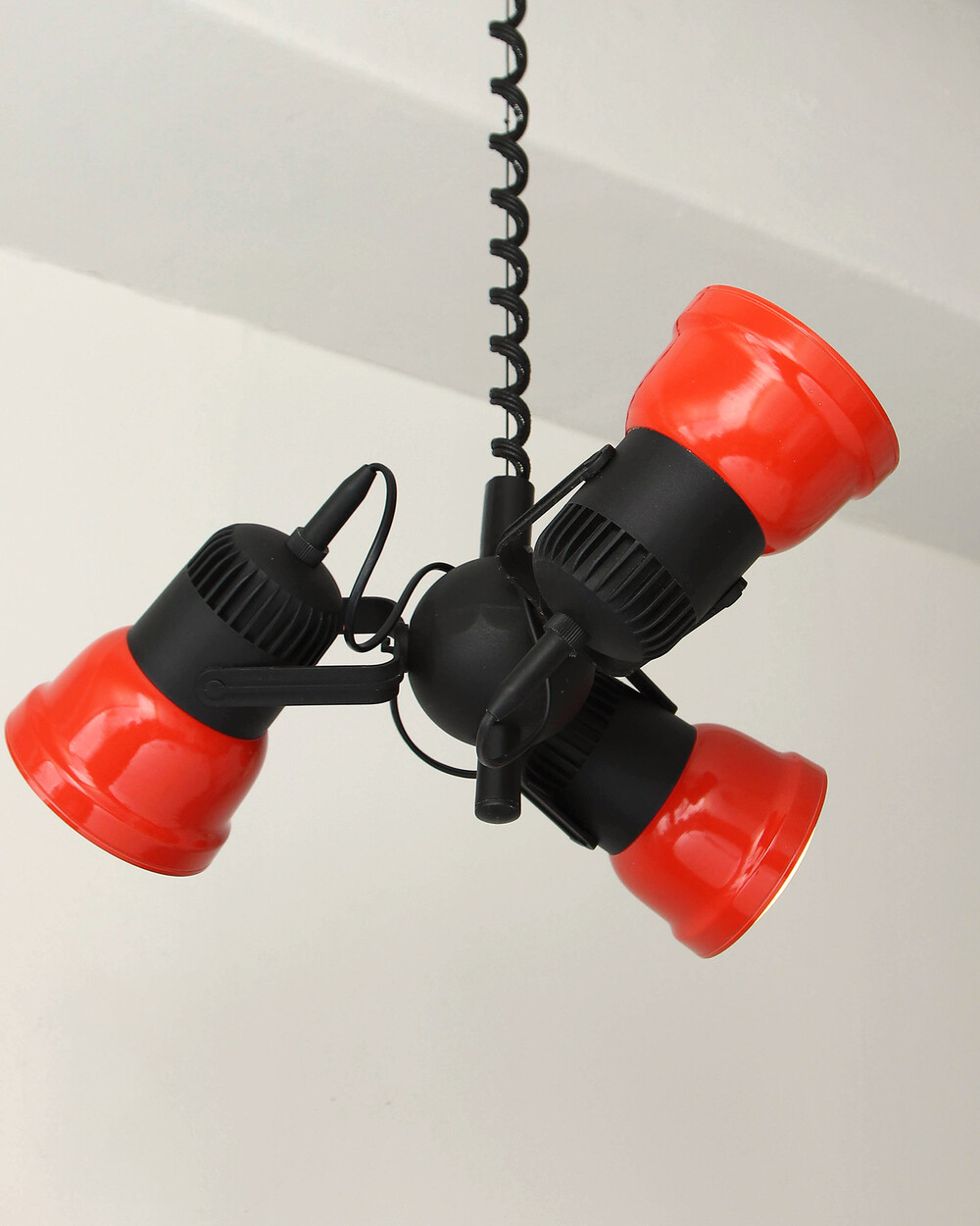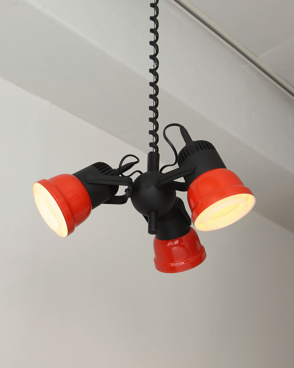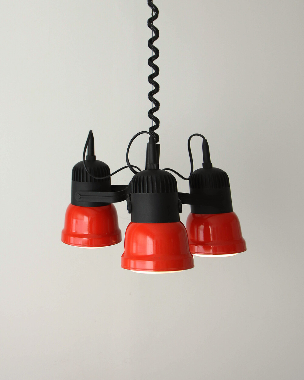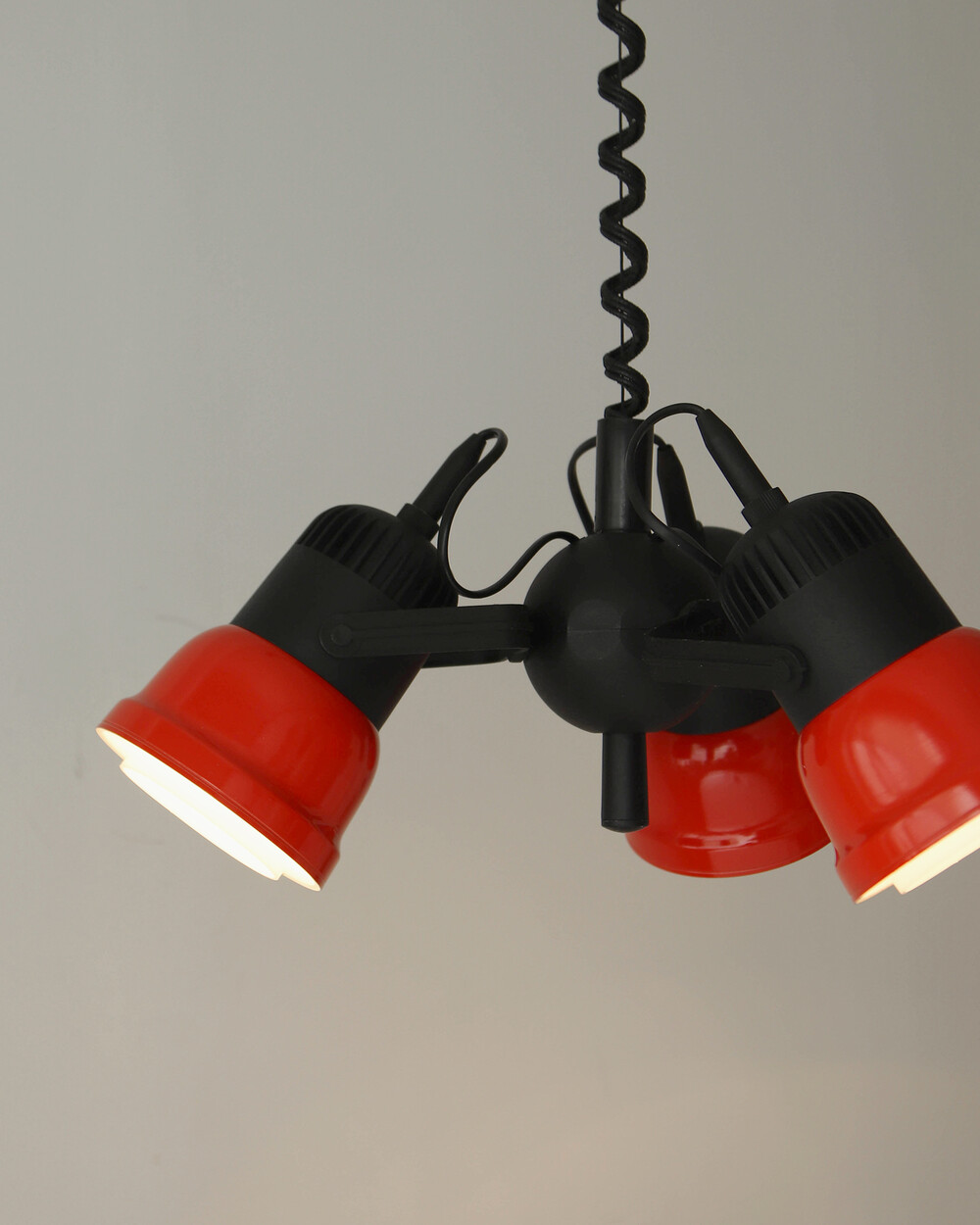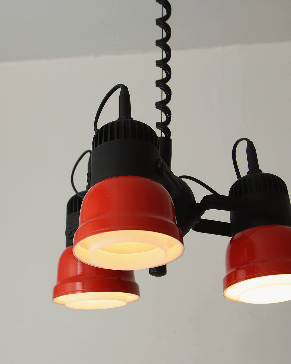 선명한 레드 컬러와 스페이스 에이지 감각이 어우러진 1980년대 폴란드 POLAM PILA의 스팟 펜던트 조명입니다. 블랙 바디와 레드 쉐이드의 대비가 또렷하며, 세 개의 헤드가 만들어내는 조형적인 실루엣이 인상적인 모델입니다.