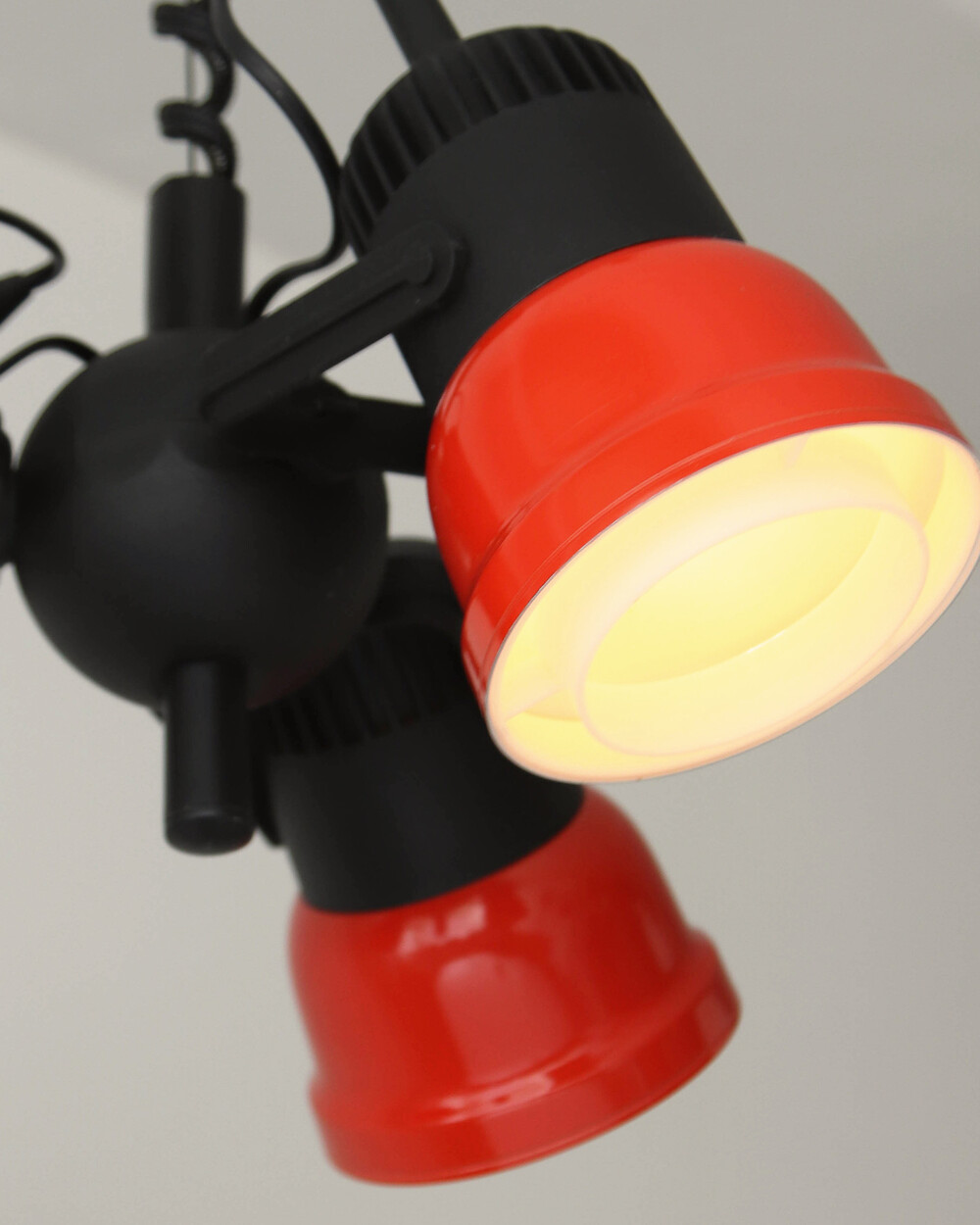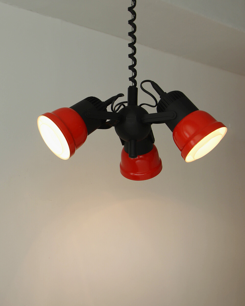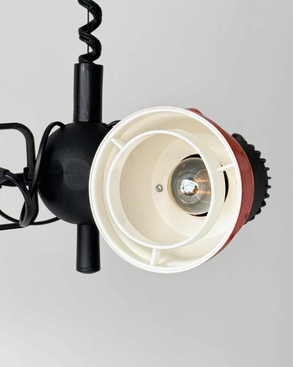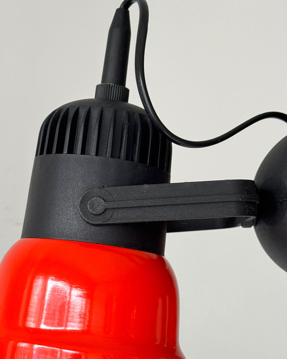 선명한 레드 컬러와 스페이스 에이지 감각이 어우러진 1980년대 폴란드 POLAM PILA의 스팟 펜던트 조명입니다. 블랙 바디와 레드 쉐이드의 대비가 또렷하며, 세 개의 헤드가 만들어내는 조형적인 실루엣이 인상적인 모델입니다.