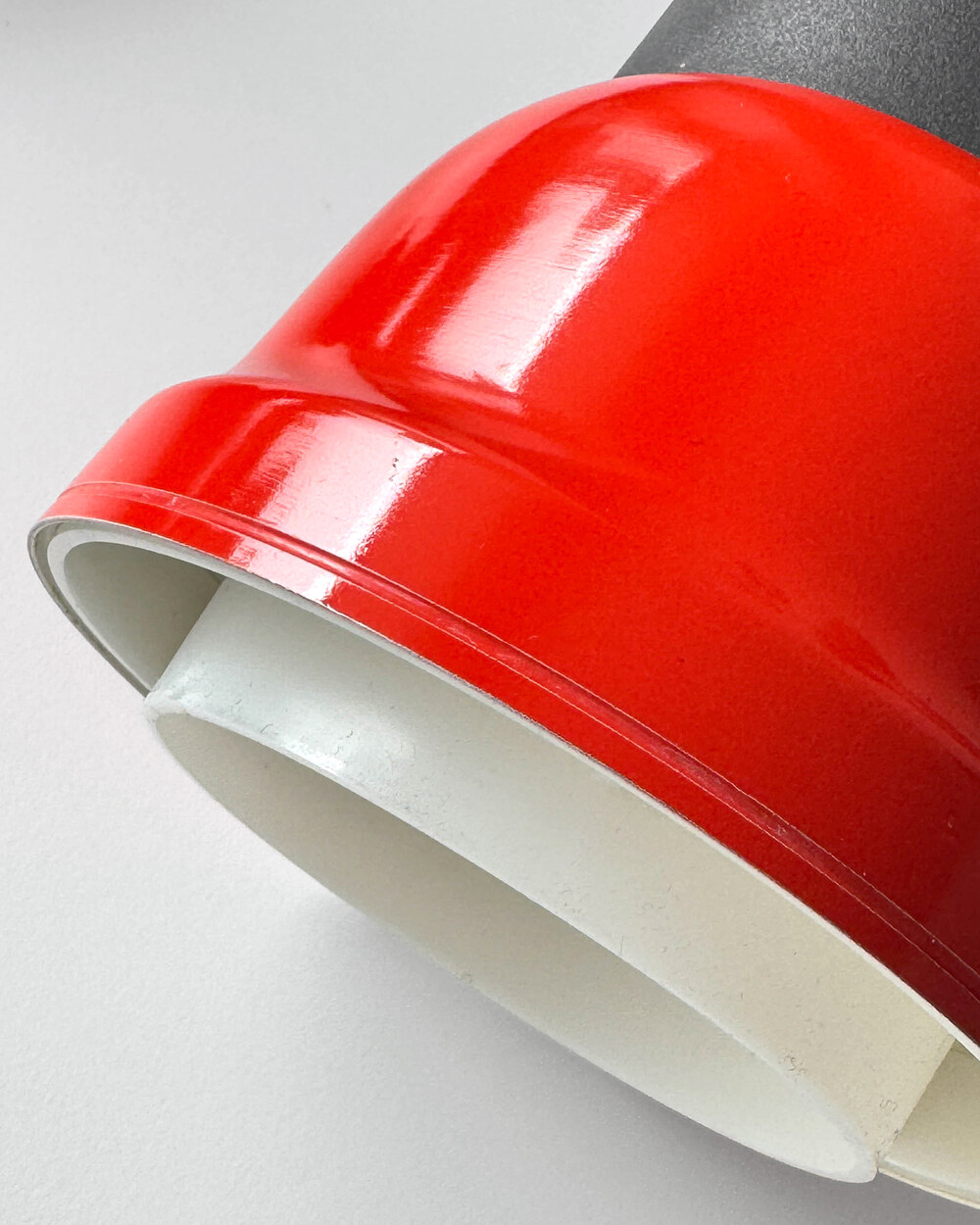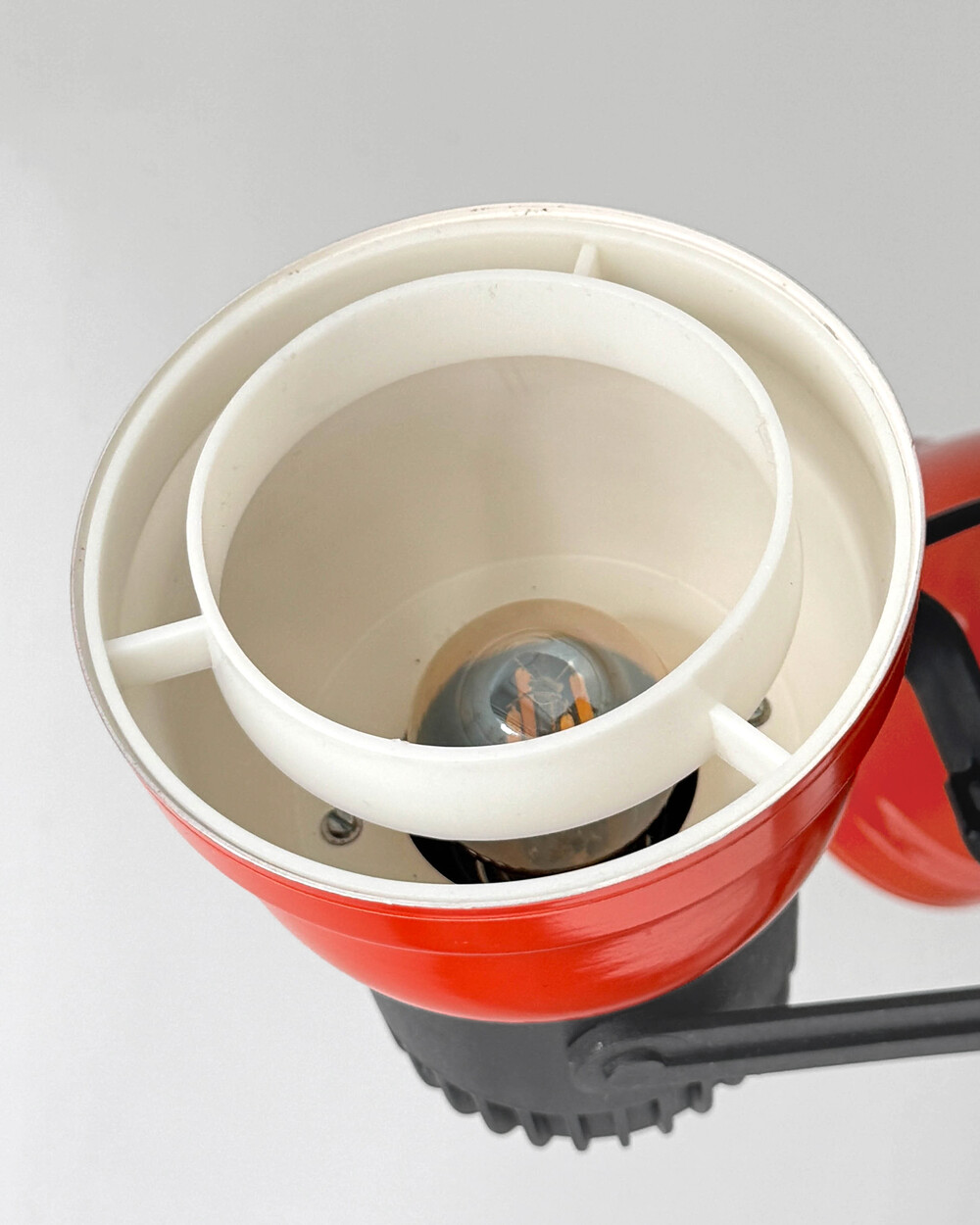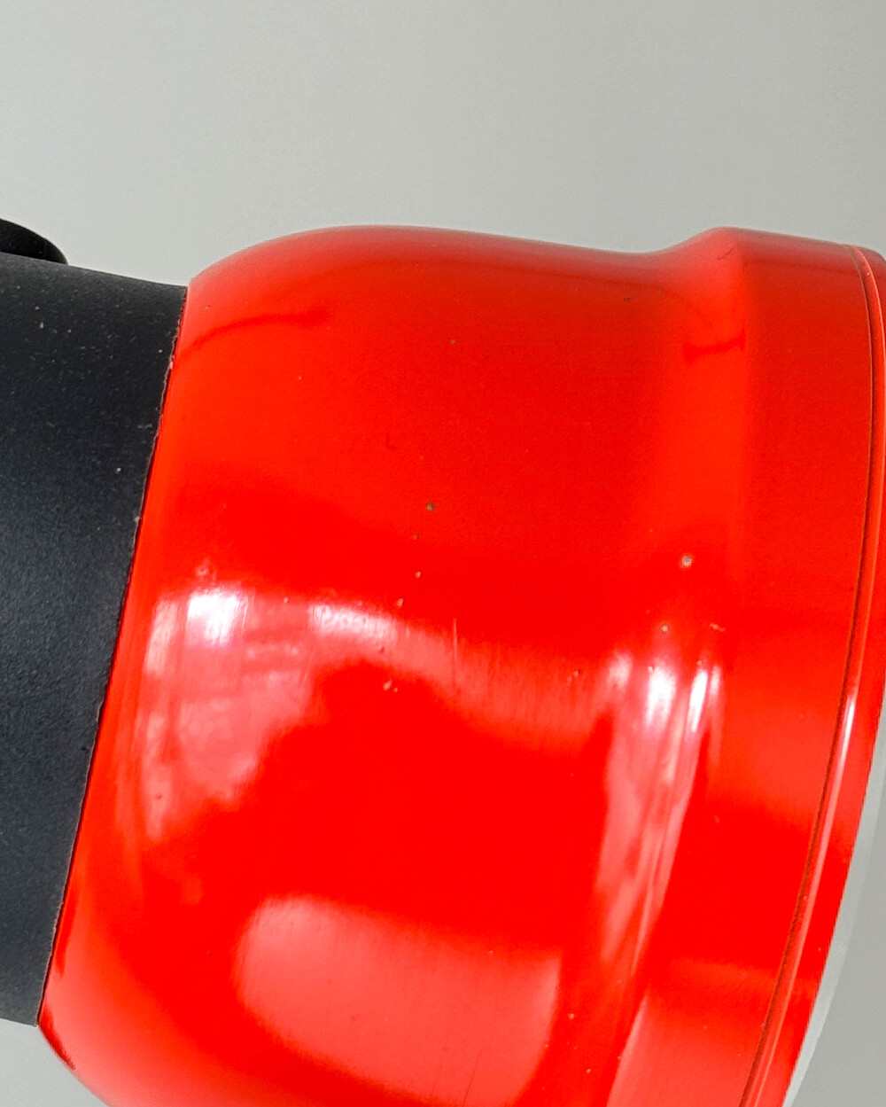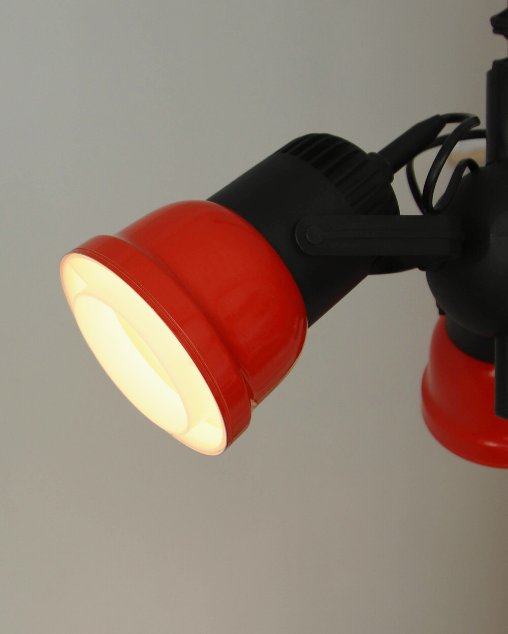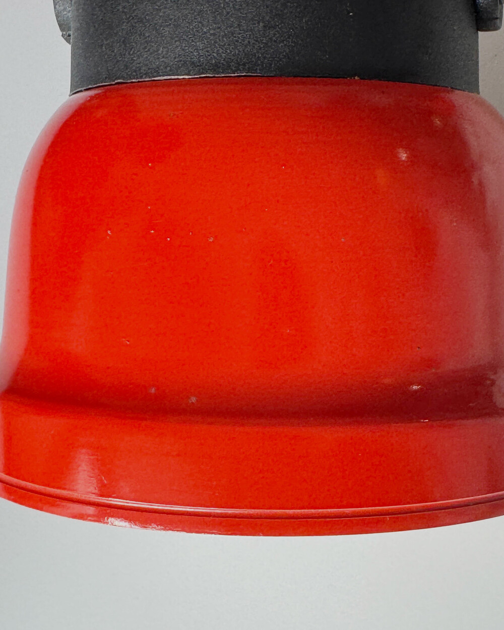 선명한 레드 컬러와 스페이스 에이지 감각이 어우러진 1980년대 폴란드 POLAM PILA의 스팟 펜던트 조명입니다. 블랙 바디와 레드 쉐이드의 대비가 또렷하며, 세 개의 헤드가 만들어내는 조형적인 실루엣이 인상적인 모델입니다.
