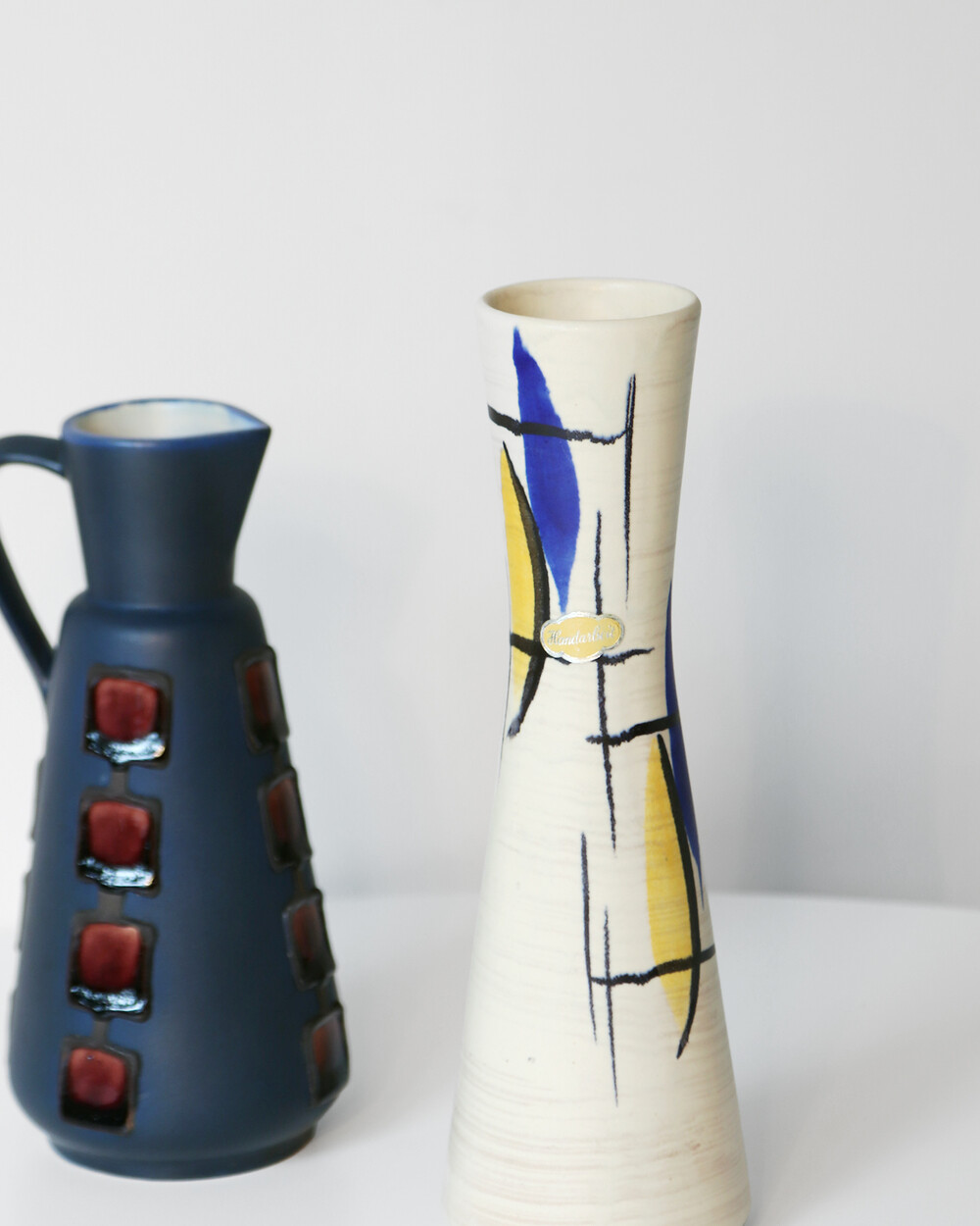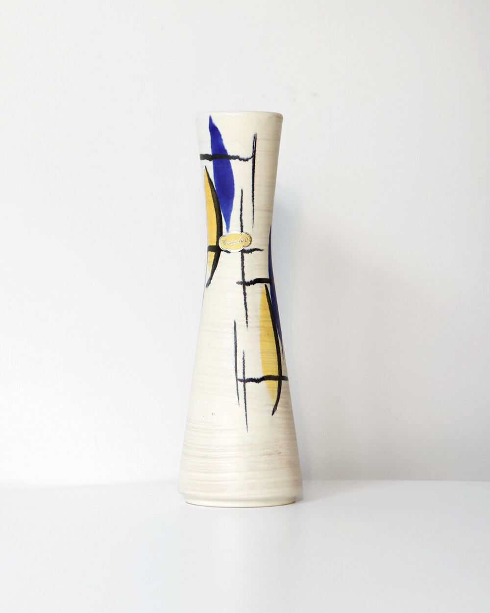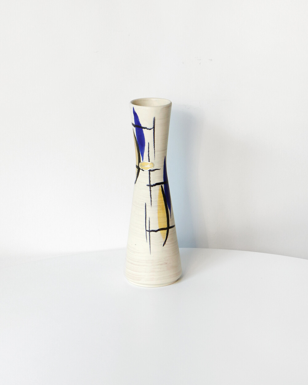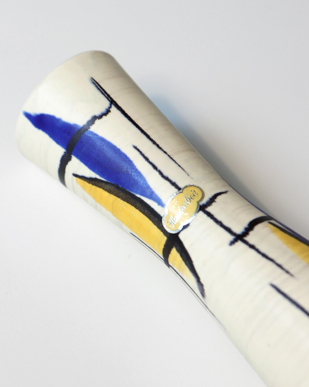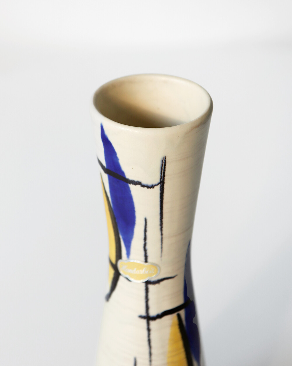 1933년 독일 Westerwald에서 도예가 Eduard Bay가 설립한 BAY Keramik Studio의 세라믹 화병입니다.블루와 옐로우 컬러, 리듬감 있는 라인이 핸드페인팅으로 장식되어 있으며, 줄기 긴 꽃이나 식물을 꽂기 좋은 실루엣을 갖추고 있습니다.