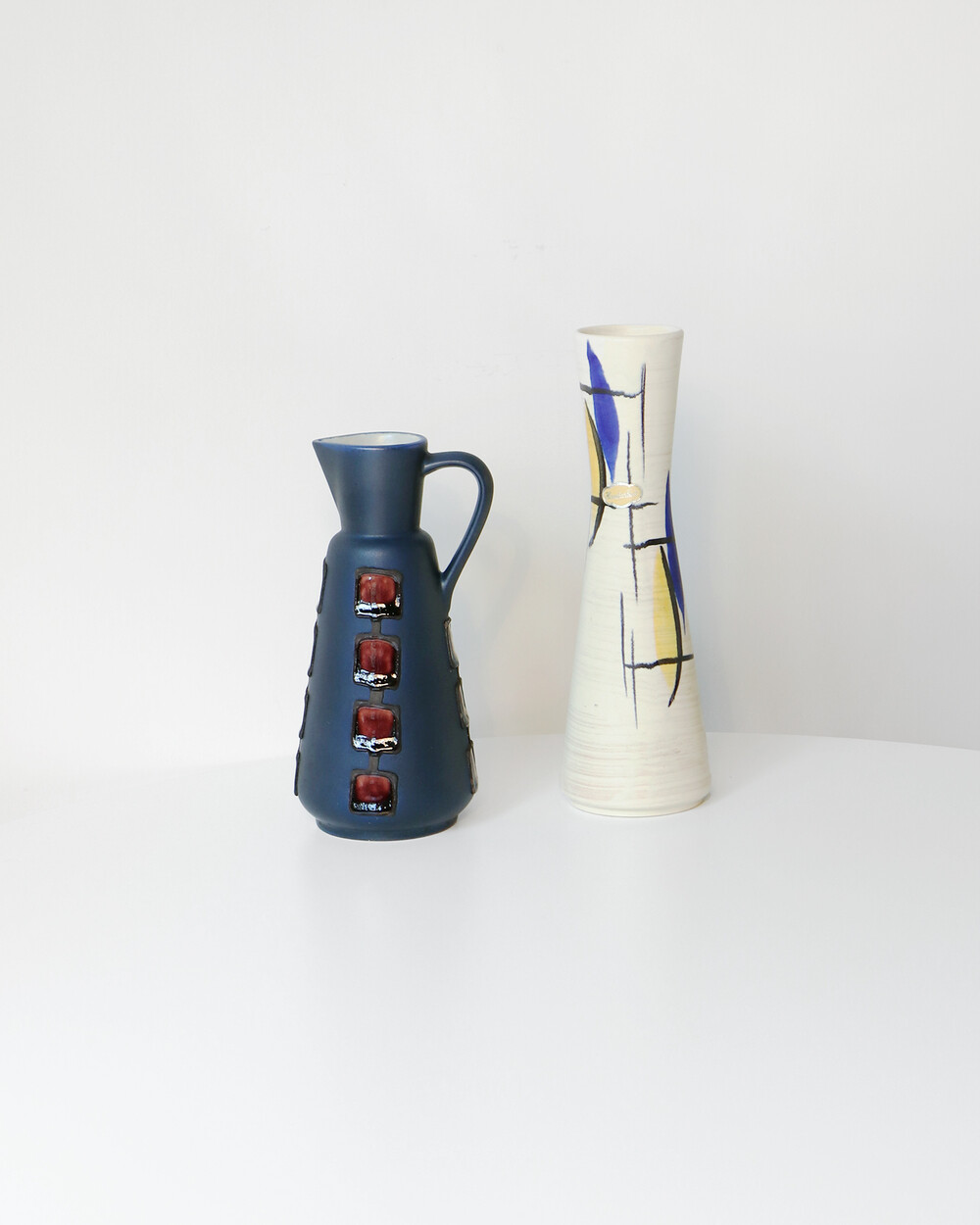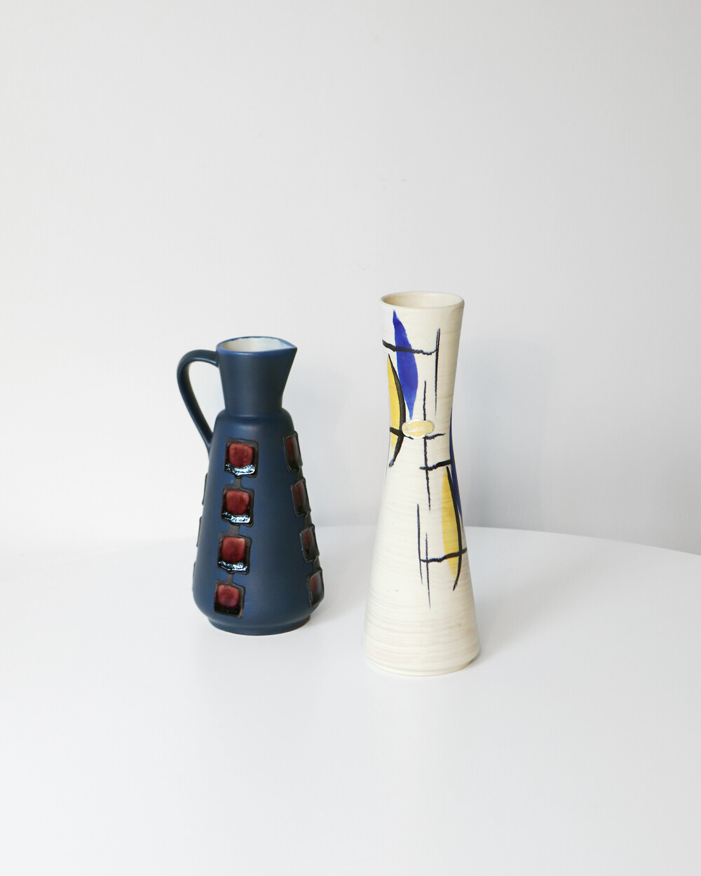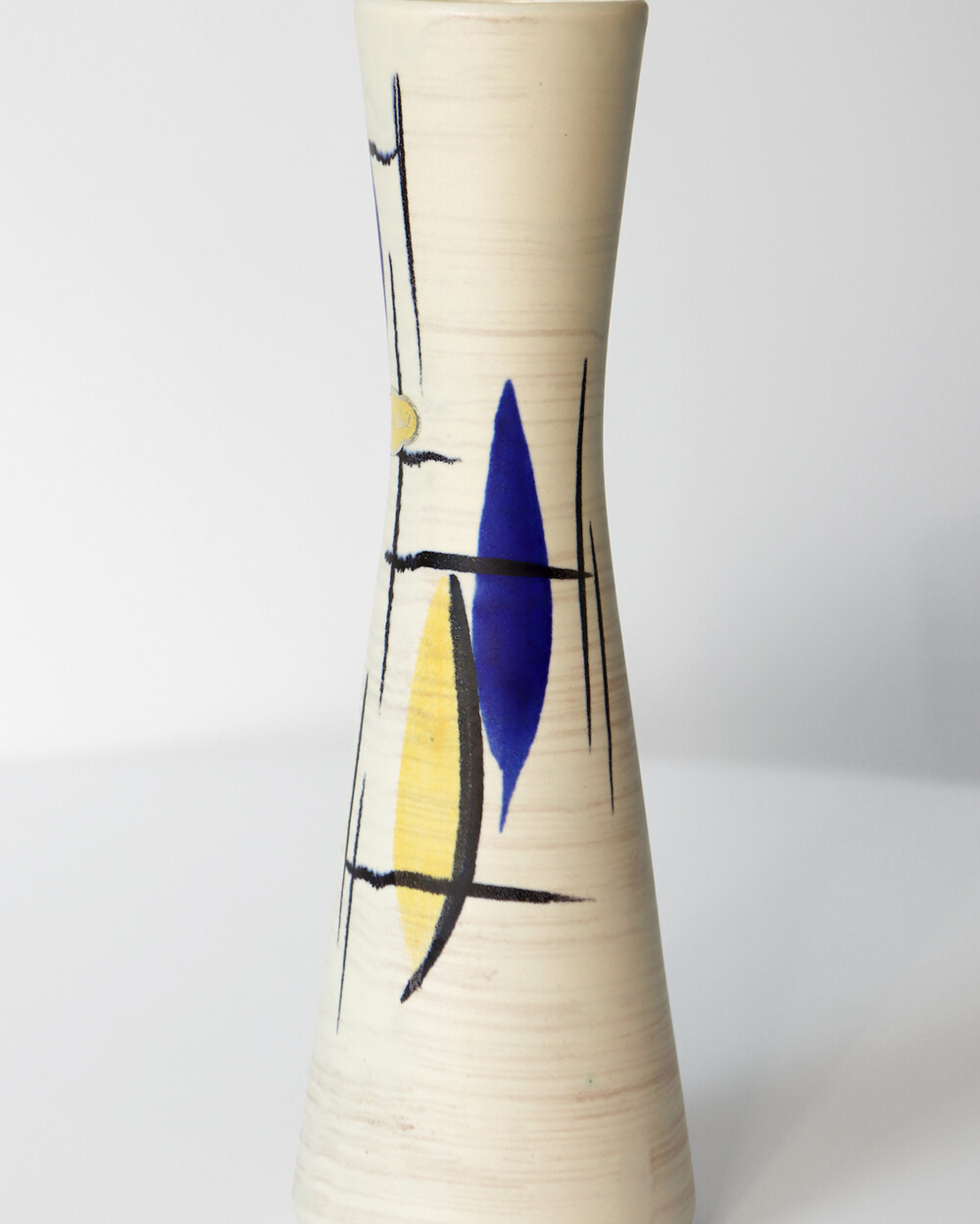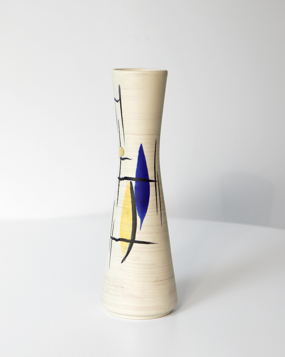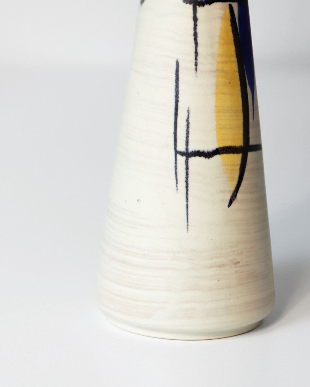 1933년 독일 Westerwald에서 도예가 Eduard Bay가 설립한 BAY Keramik Studio의 세라믹 화병입니다.블루와 옐로우 컬러, 리듬감 있는 라인이 핸드페인팅으로 장식되어 있으며, 줄기 긴 꽃이나 식물을 꽂기 좋은 실루엣을 갖추고 있습니다.