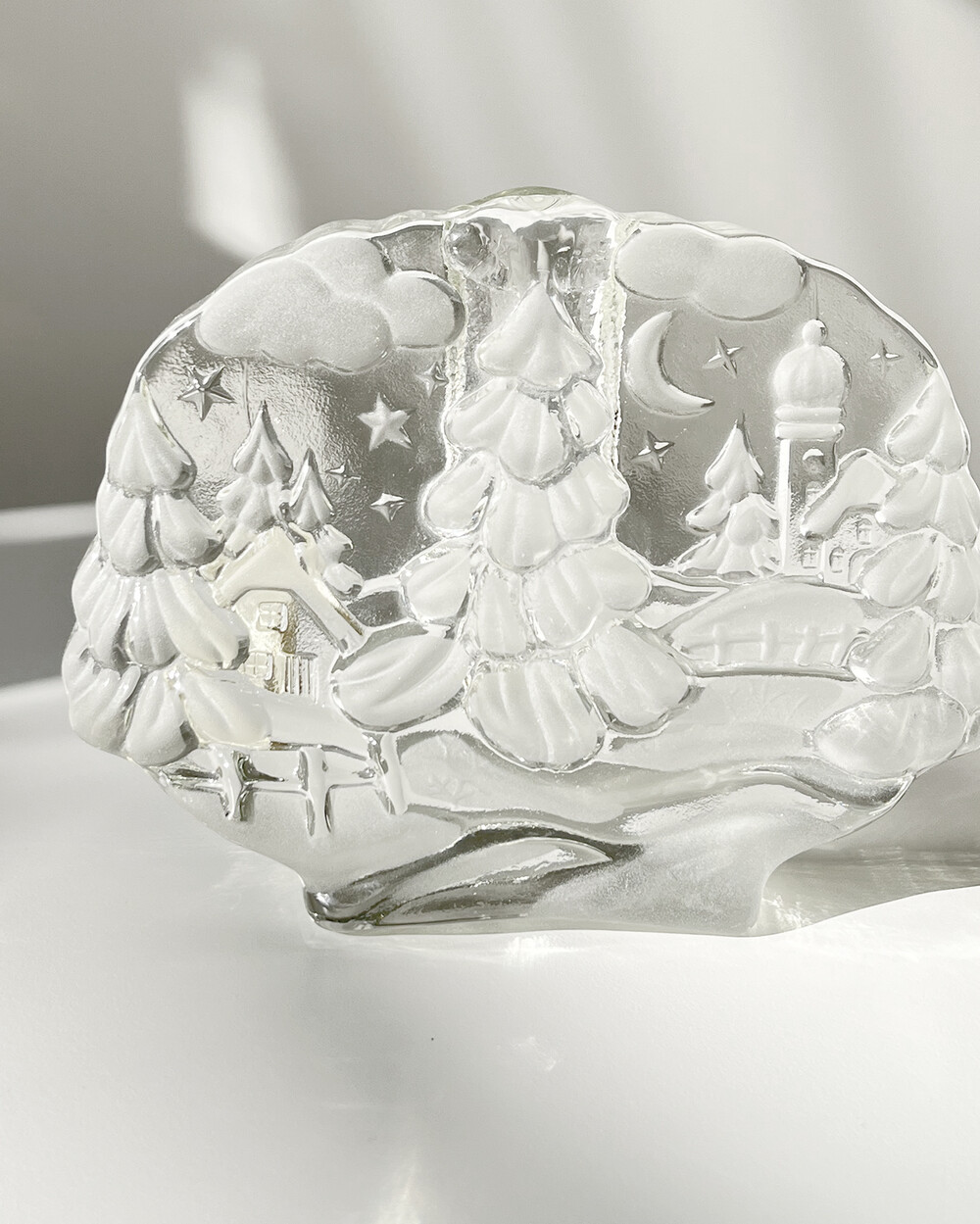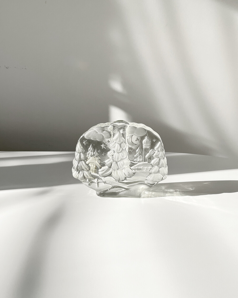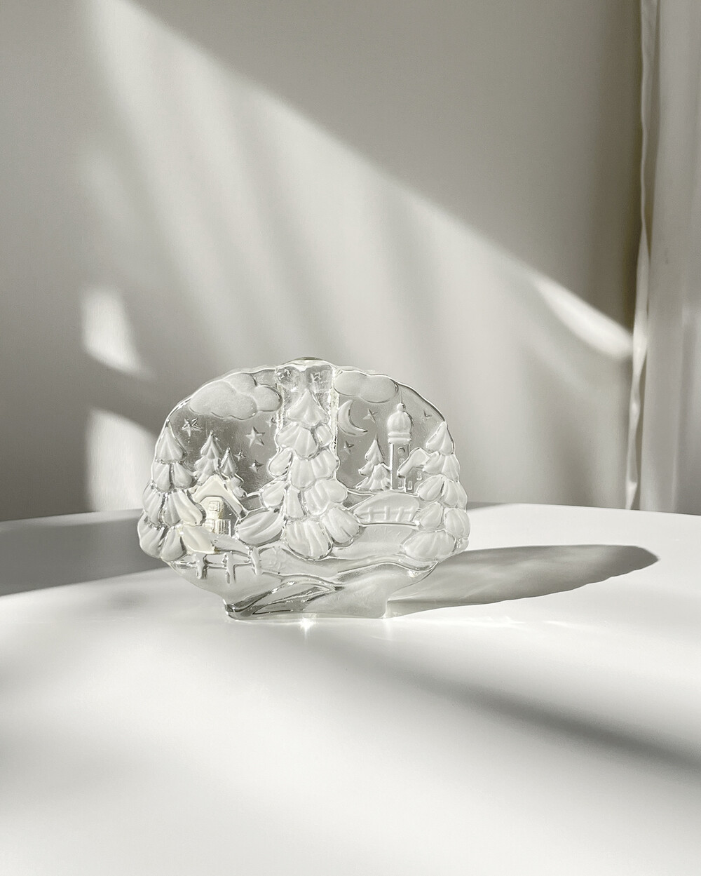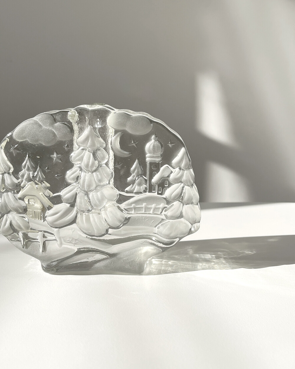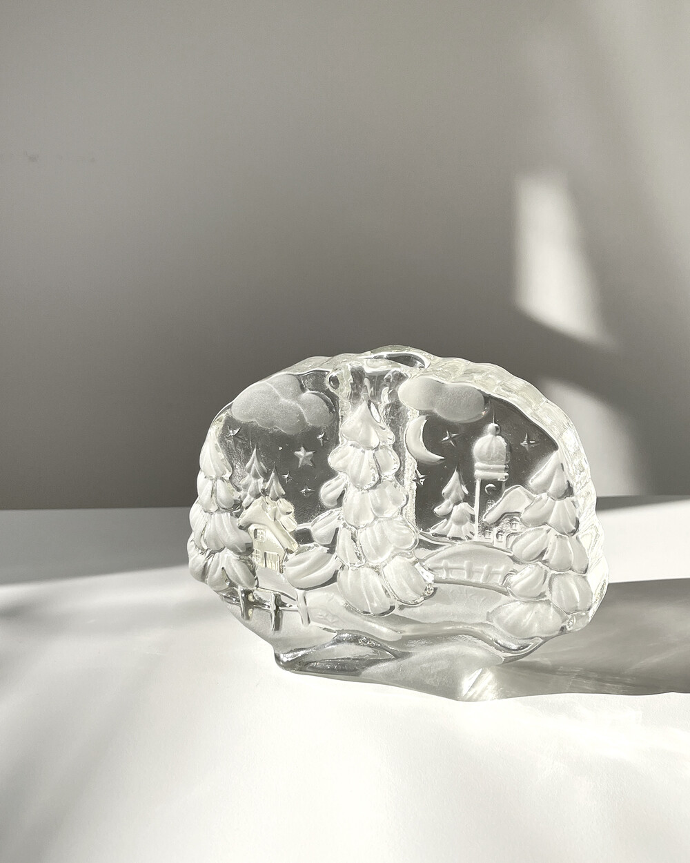 1865년 독일에서 설립된 Walther Glass의 크리스탈 블록 글라스 화병입니다. 맑은 투명도를 가진 크리스탈 글라스에 눈이 내린 크리스마스 풍경이 담겨 있습니다.