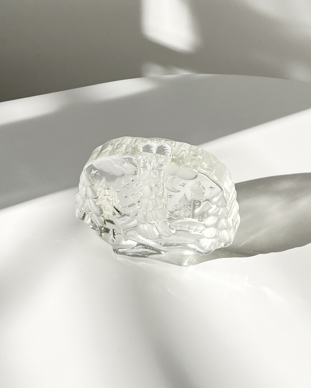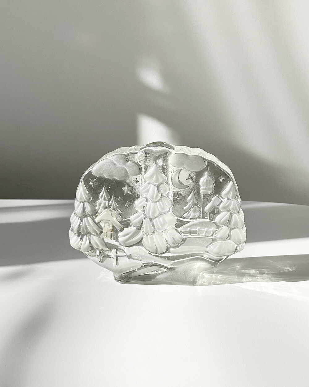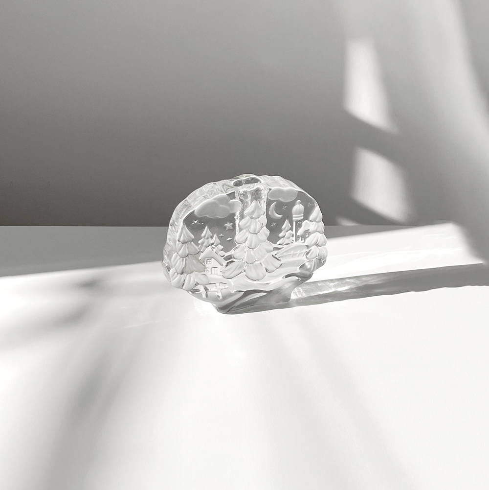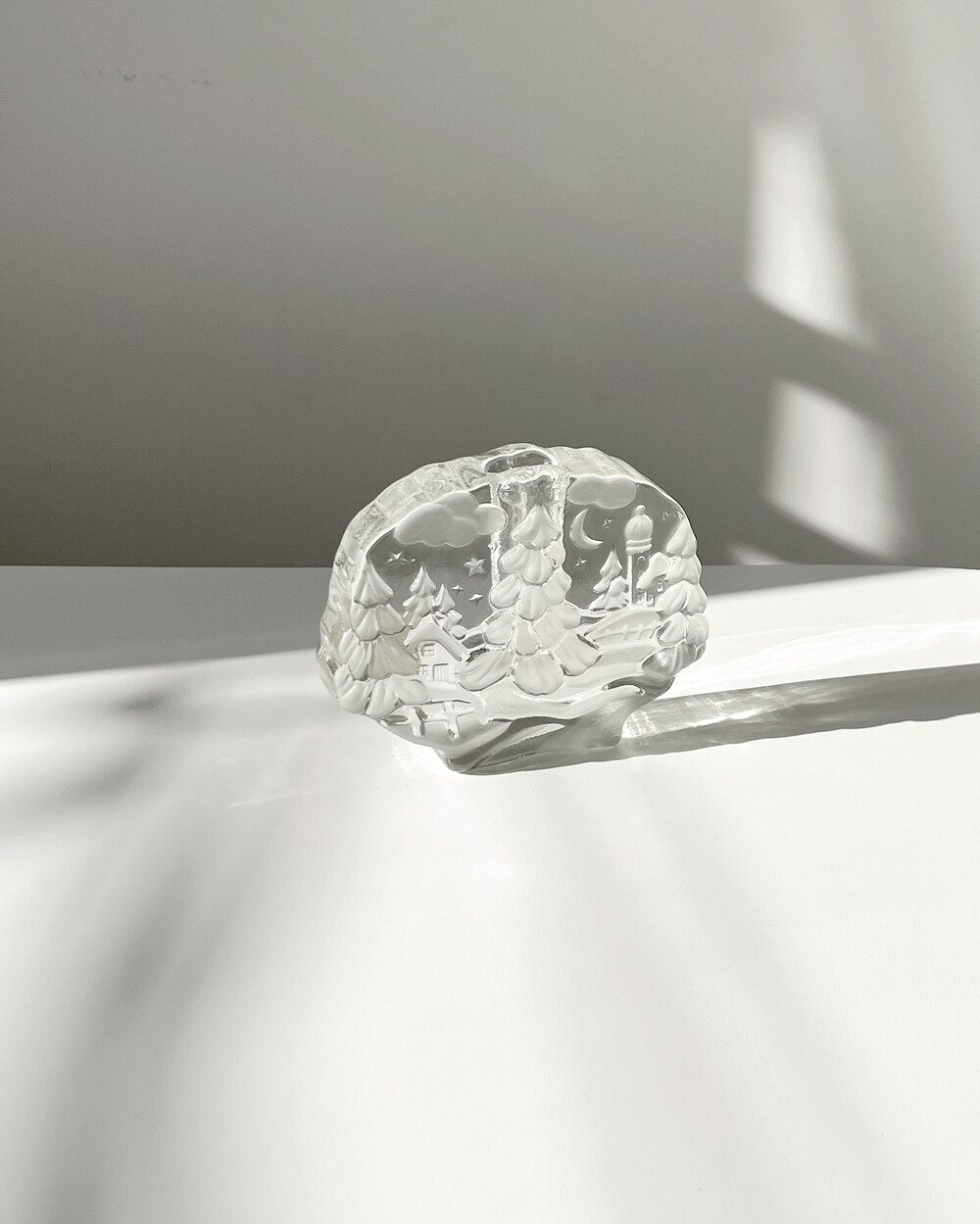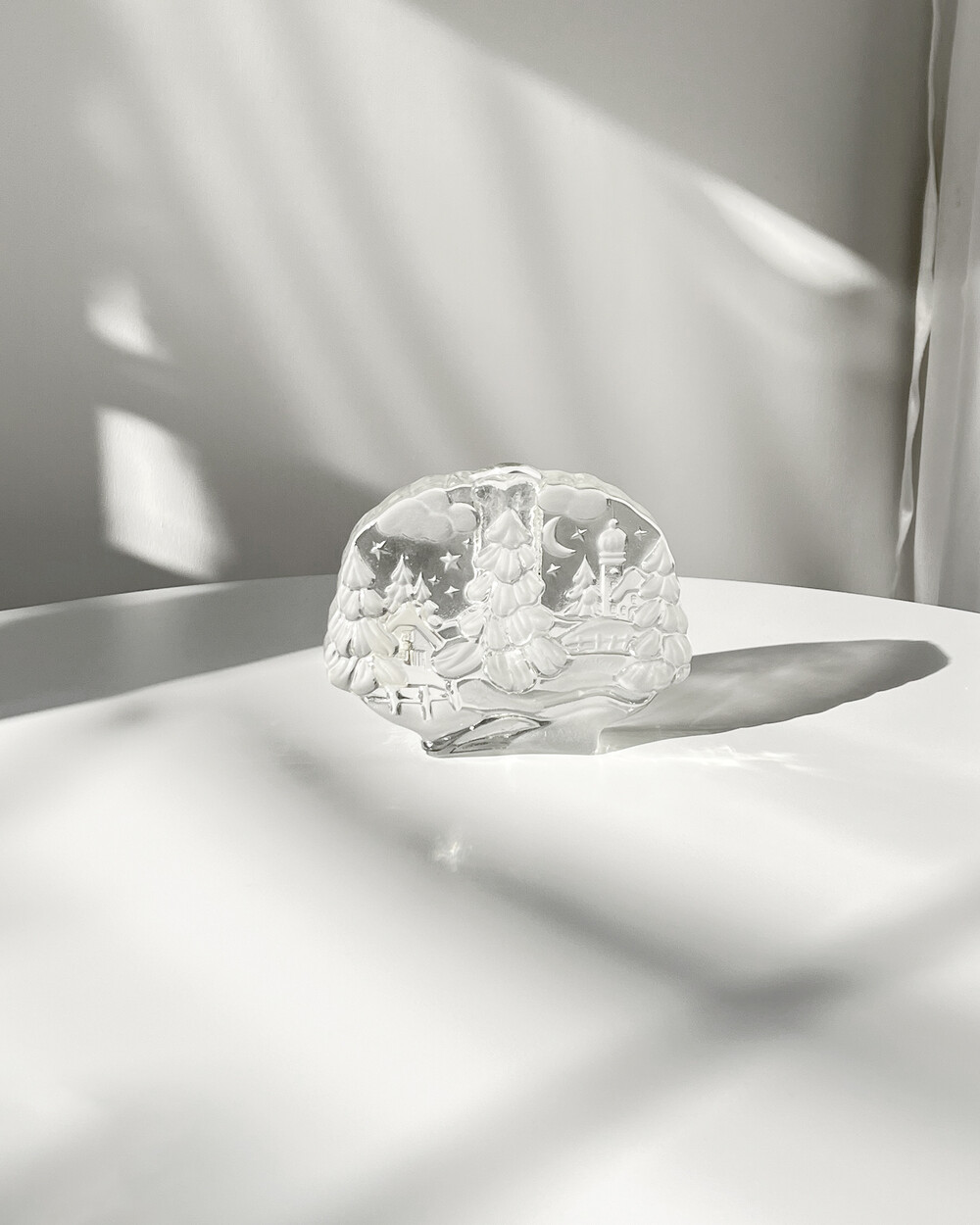 1865년 독일에서 설립된 Walther Glass의 크리스탈 블록 글라스 화병입니다. 맑은 투명도를 가진 크리스탈 글라스에 눈이 내린 크리스마스 풍경이 담겨 있습니다.