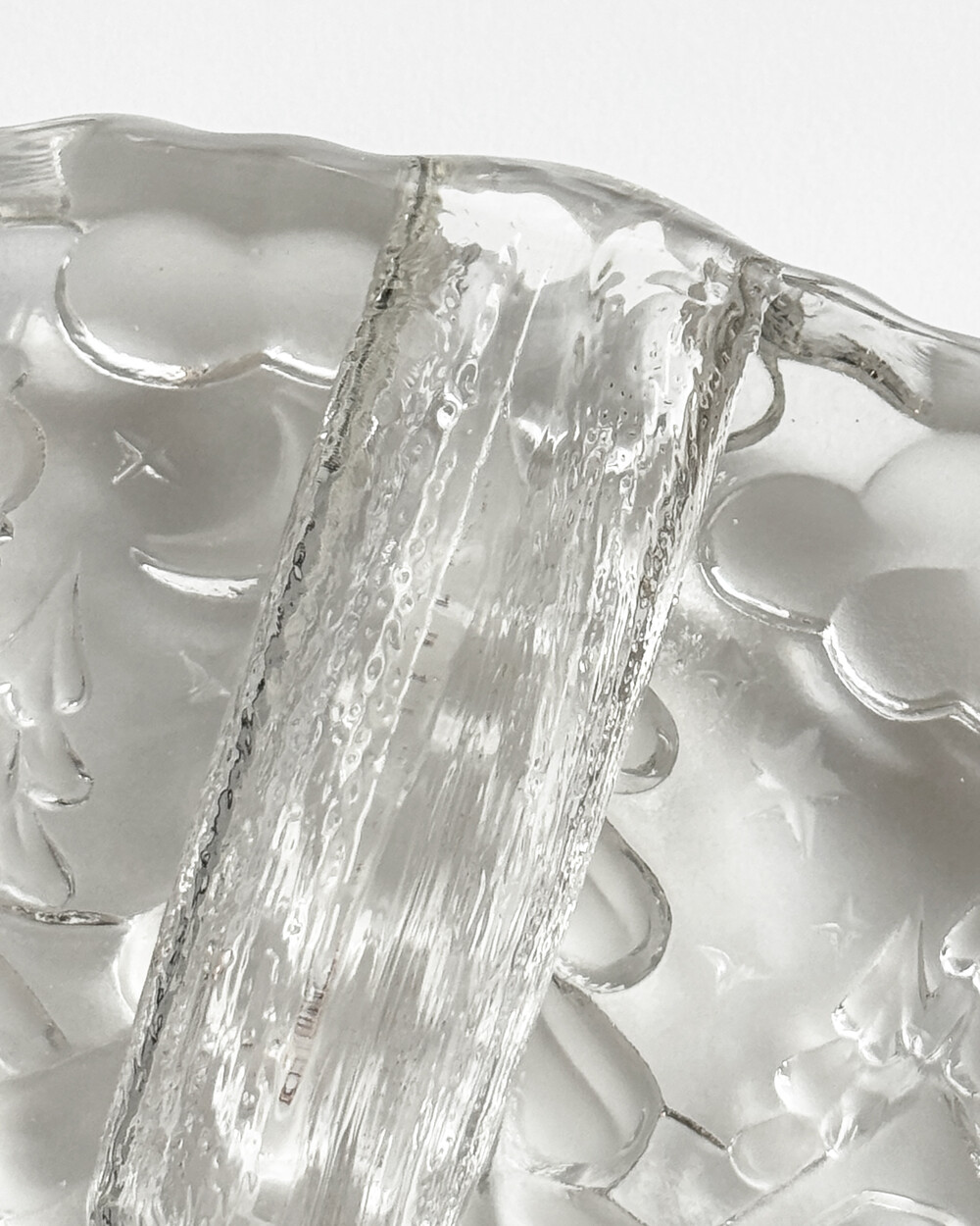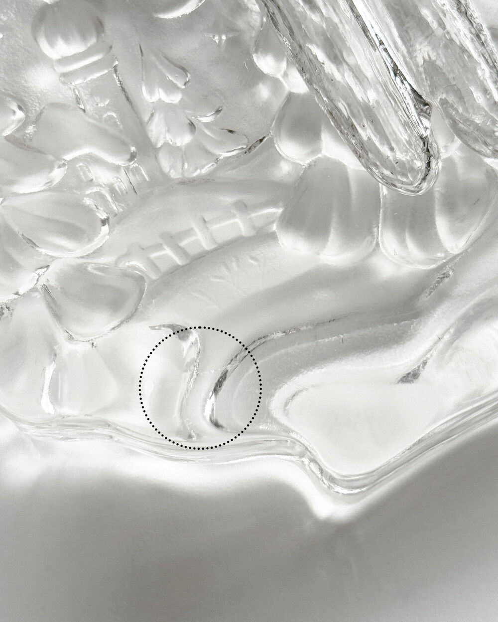 바닥면에 닿으면서 남은 반투명한 자국과 기포, 모래알, 유리주름 자국 등 제작 과정에서 생기는 흔적이 일부 보입니다.