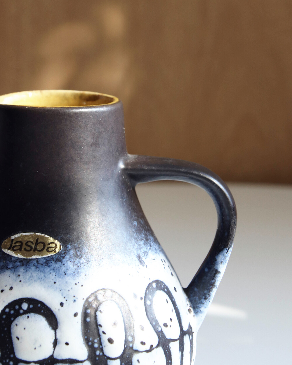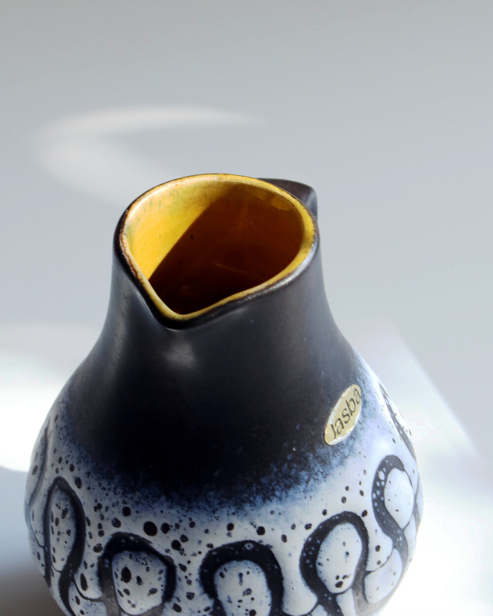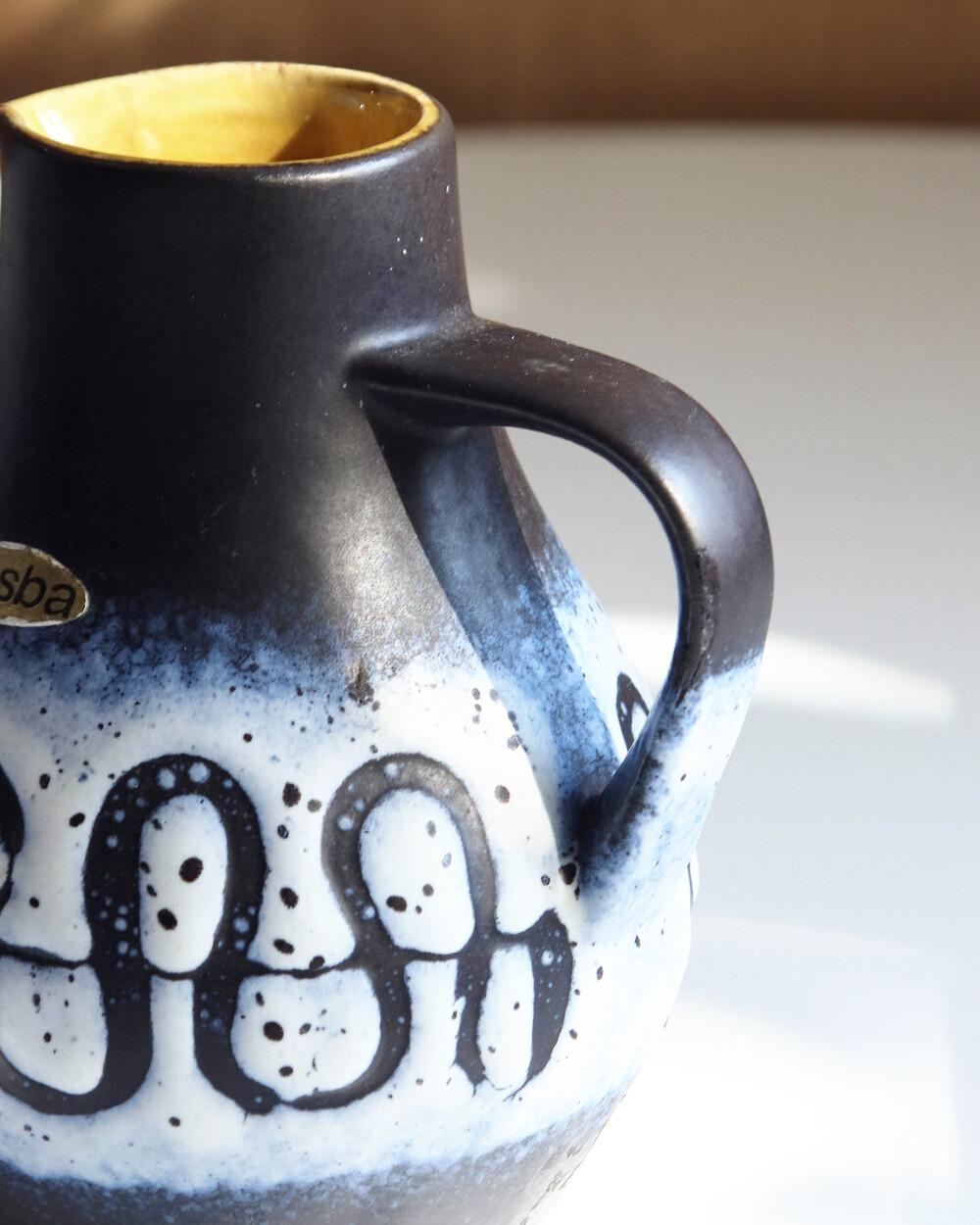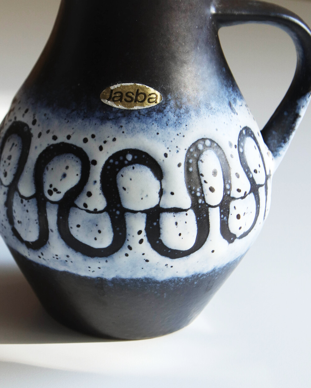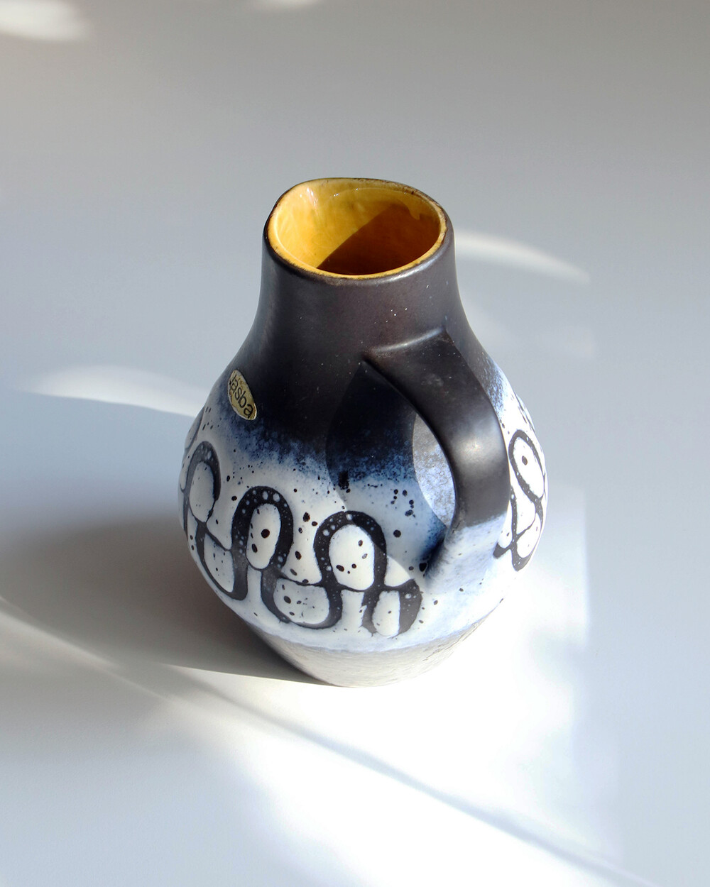 깊이 있는 푸른 색감과 독특한 루프 패턴이 장식된 세라믹 핸들 화병으로, Jasba Keramik이 1960년대 독일에서 제작한 작품입니다. 러프한 무광 텍스쳐와 대비되는 내부의 은은한 노란빛이 따뜻한 분위기를 더하며, 안정적인 형태감을 가지고 있습니다.