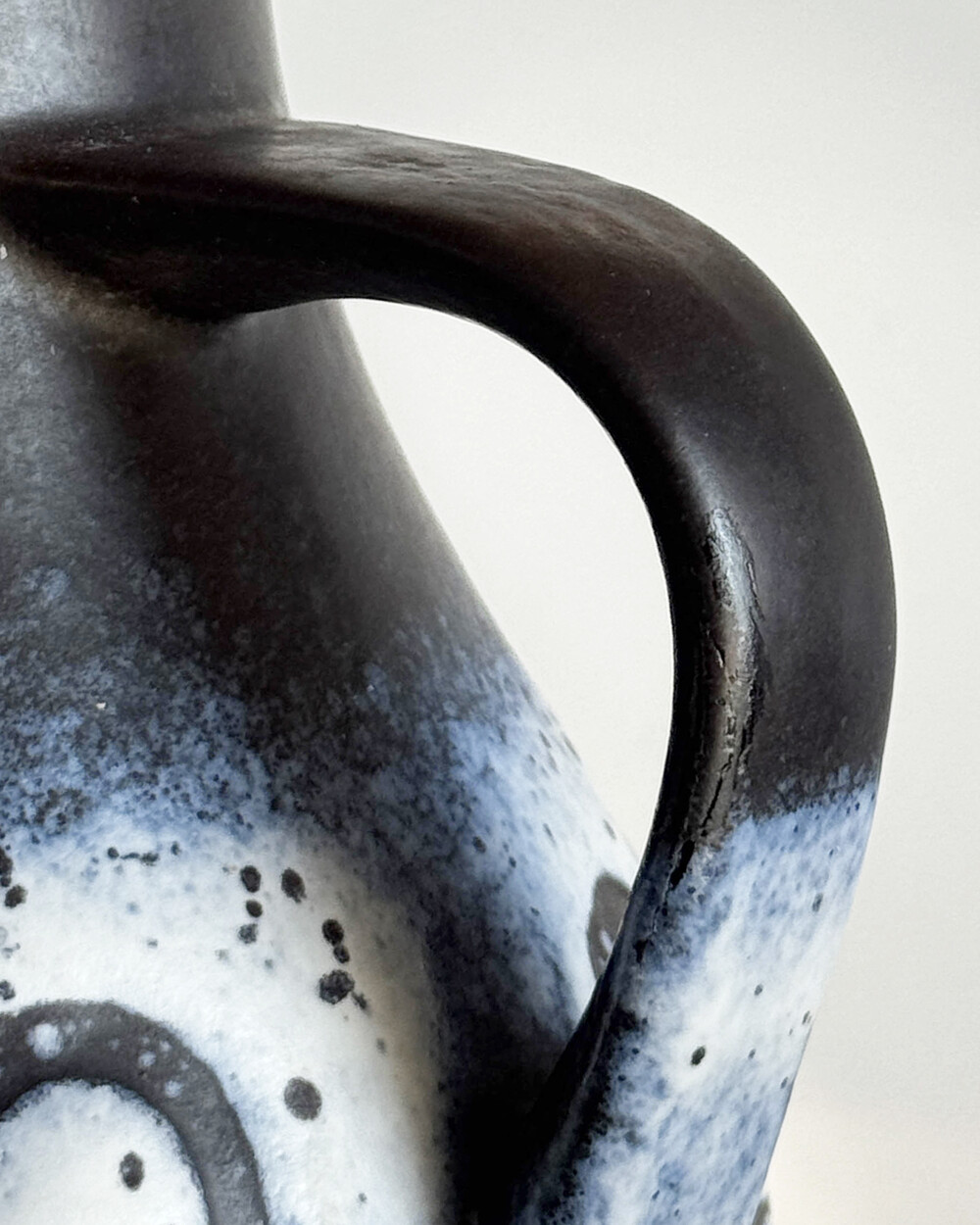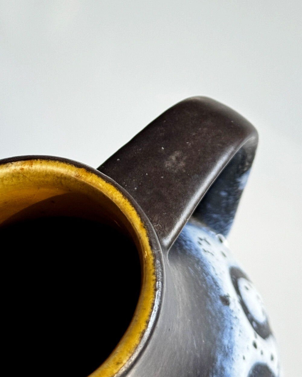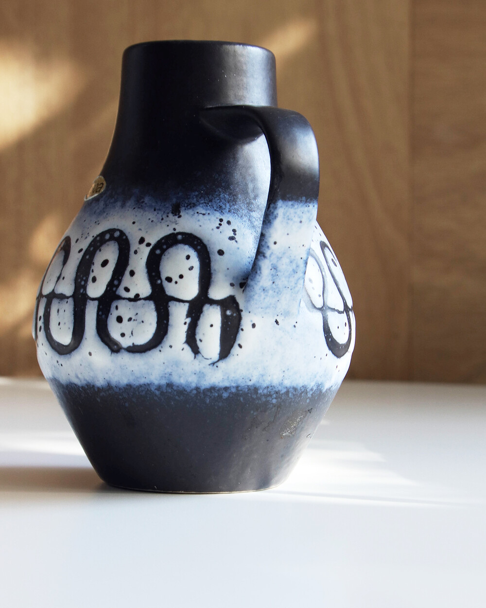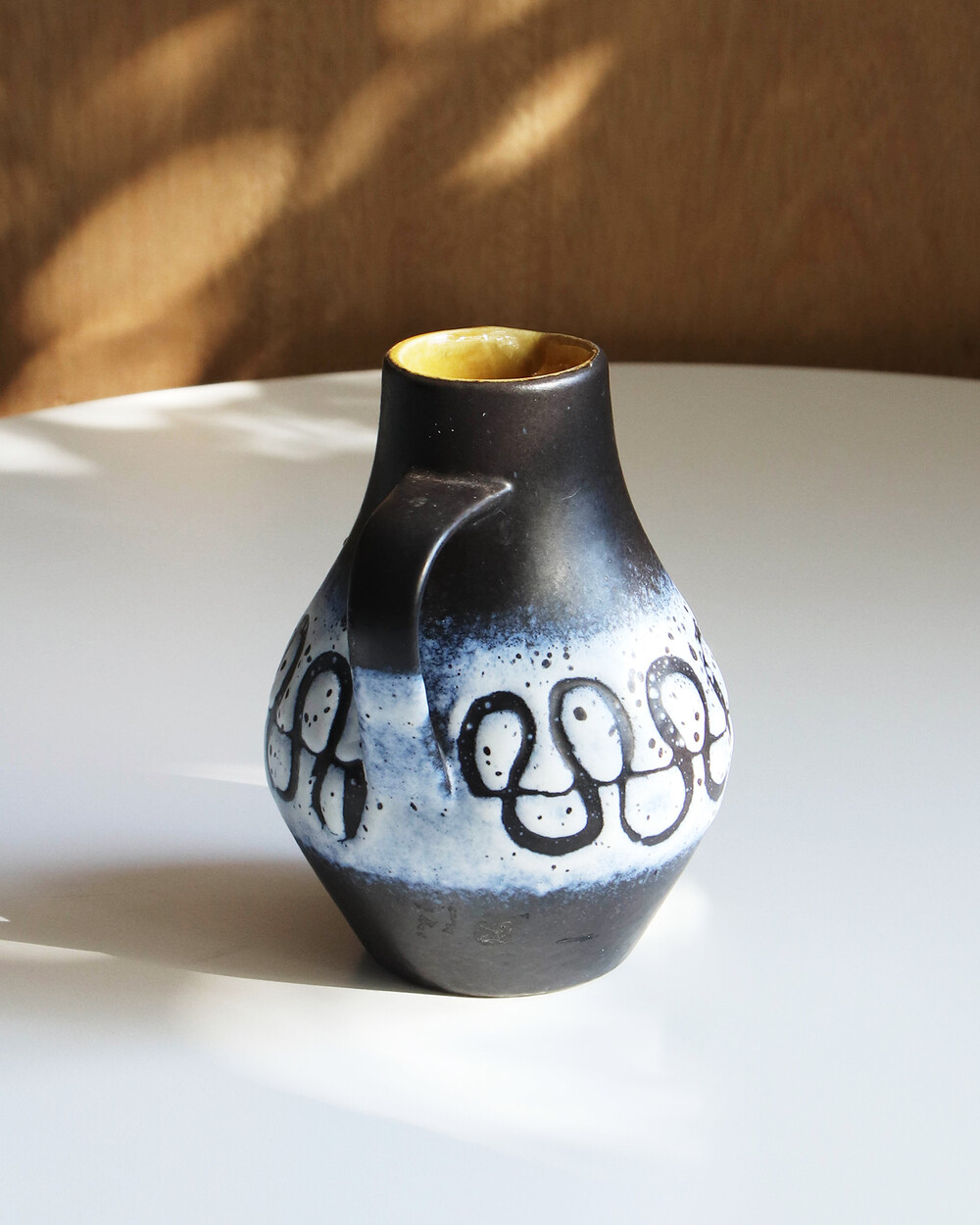 깊이 있는 푸른 색감과 독특한 루프 패턴이 장식된 세라믹 핸들 화병으로, Jasba Keramik이 1960년대 독일에서 제작한 작품입니다. 러프한 무광 텍스쳐와 대비되는 내부의 은은한 노란빛이 따뜻한 분위기를 더하며, 안정적인 형태감을 가지고 있습니다.