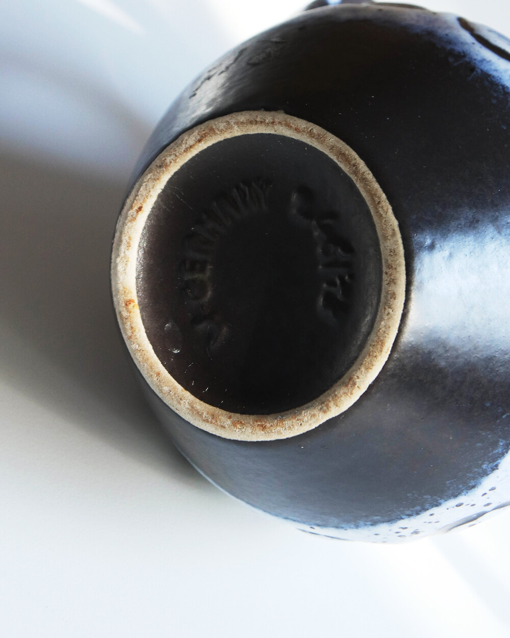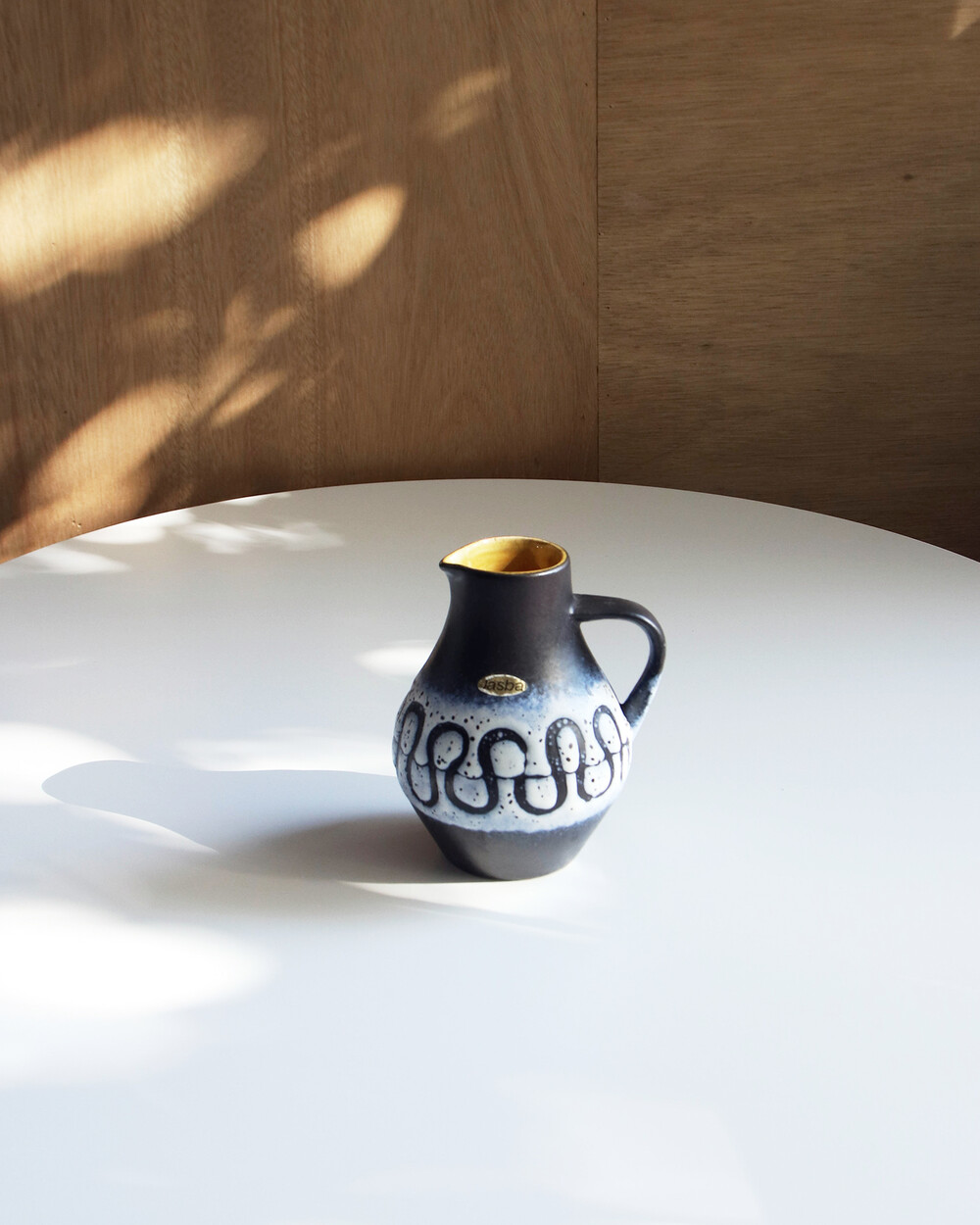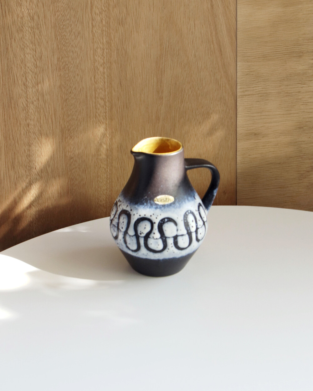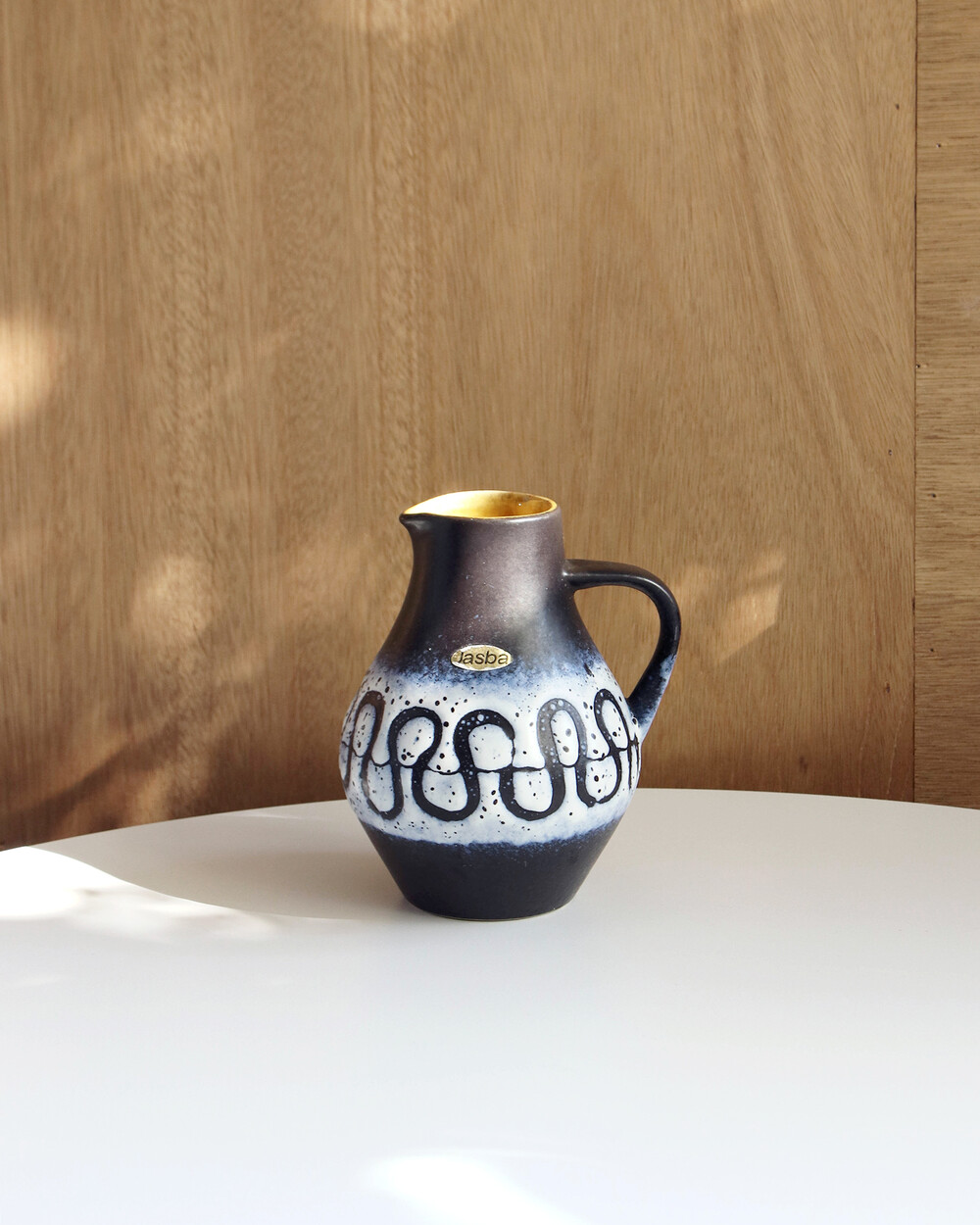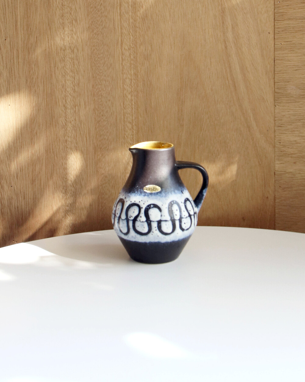 깊이 있는 푸른 색감과 독특한 루프 패턴이 장식된 세라믹 핸들 화병으로, Jasba Keramik이 1960년대 독일에서 제작한 작품입니다. 러프한 무광 텍스쳐와 대비되는 내부의 은은한 노란빛이 따뜻한 분위기를 더하며, 안정적인 형태감을 가지고 있습니다.