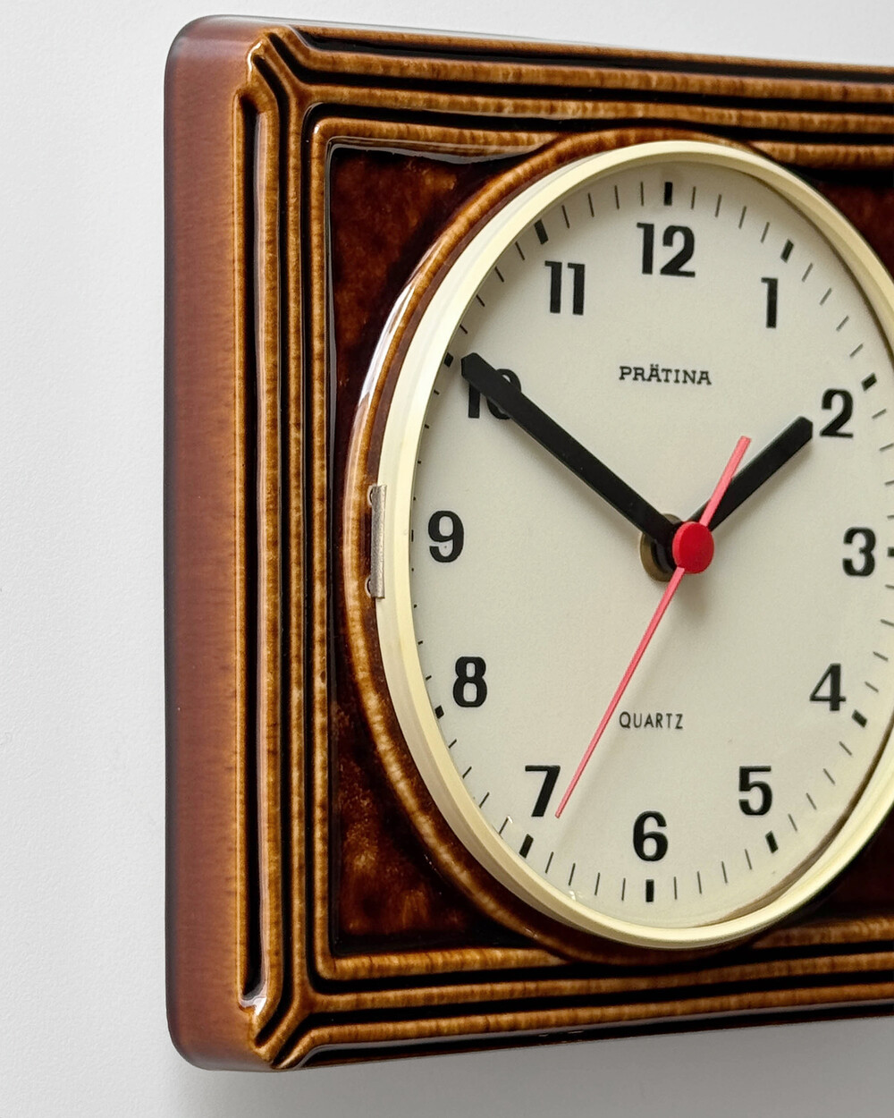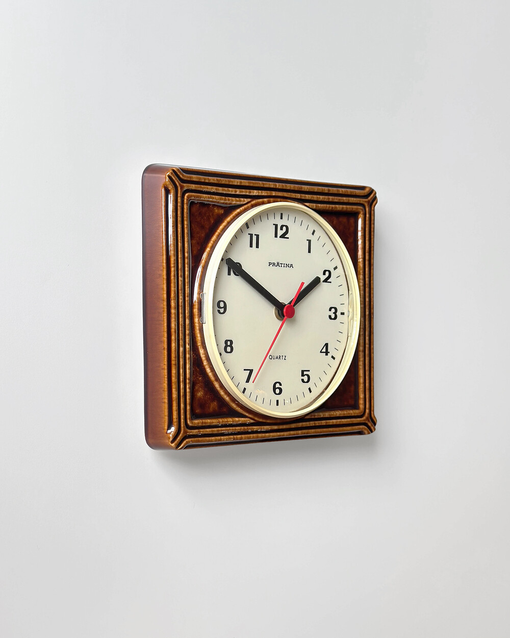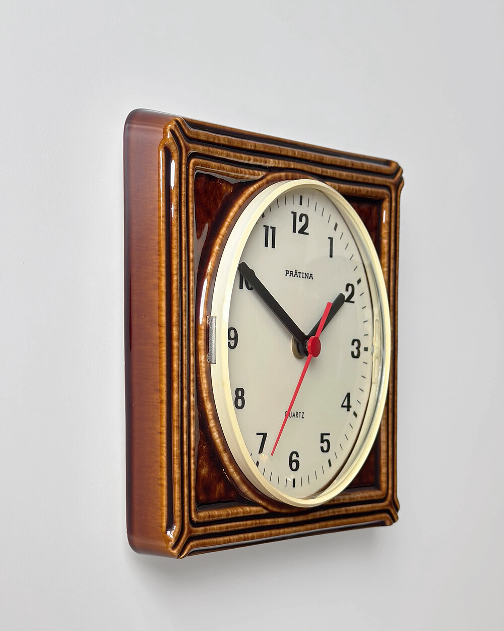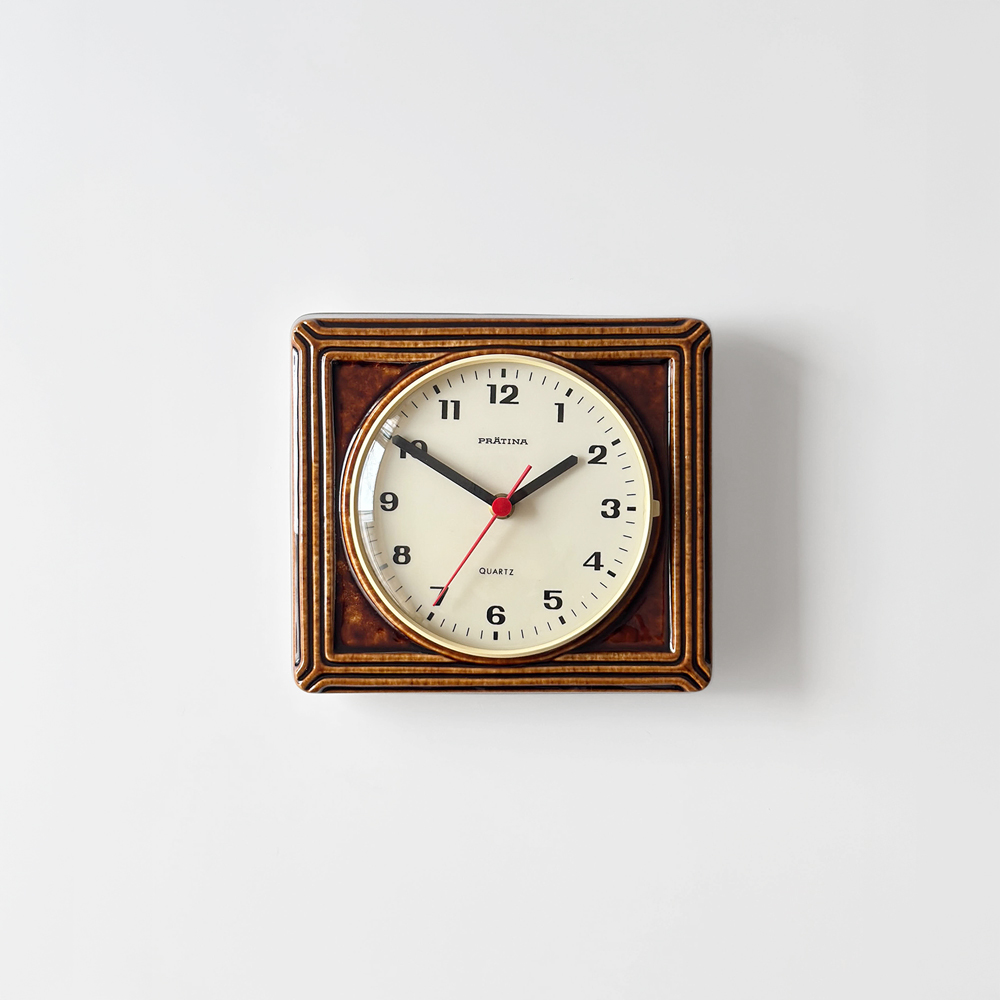 브라운 유광 세라믹 바디와 단정한 직사각 프레임, 절제된 라인 디테일이 어우러진 1980년대 독일 PRÄTINA 벽시계입니다. 전면 도어가 오픈되는 구조로 실용성을 갖추었으며, 전체적으로 클래식한 분위기와 안정된 컨디션을 보여줍니다.
