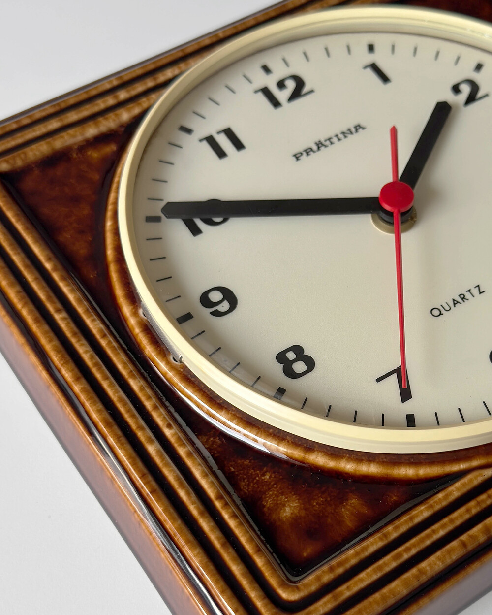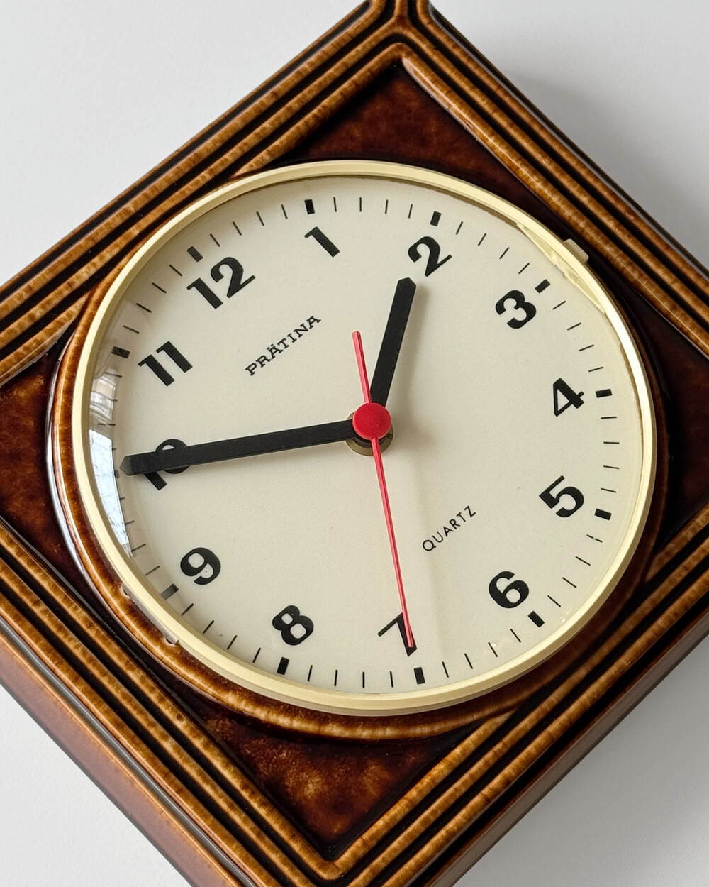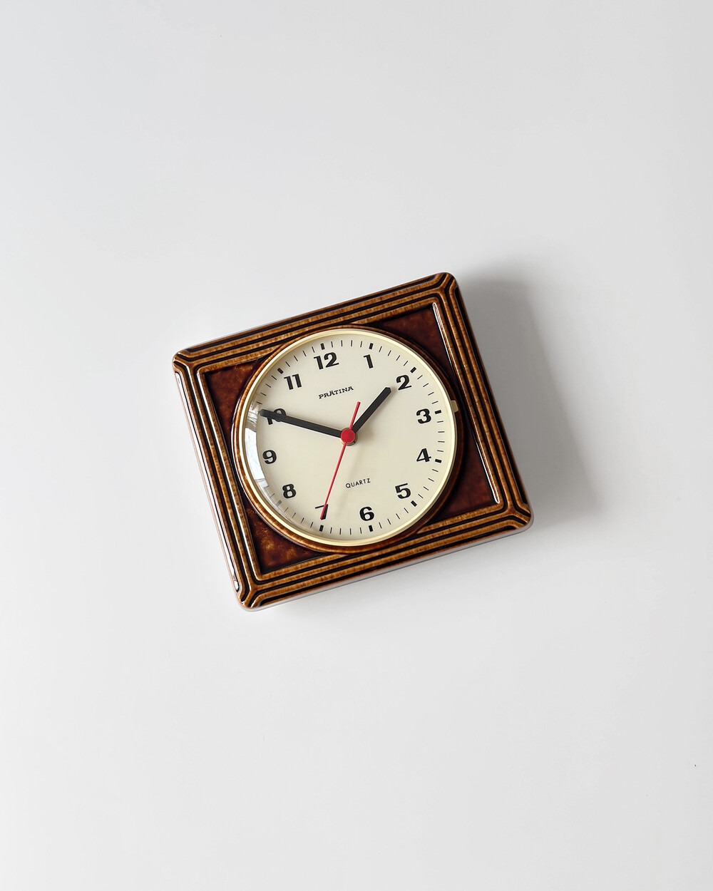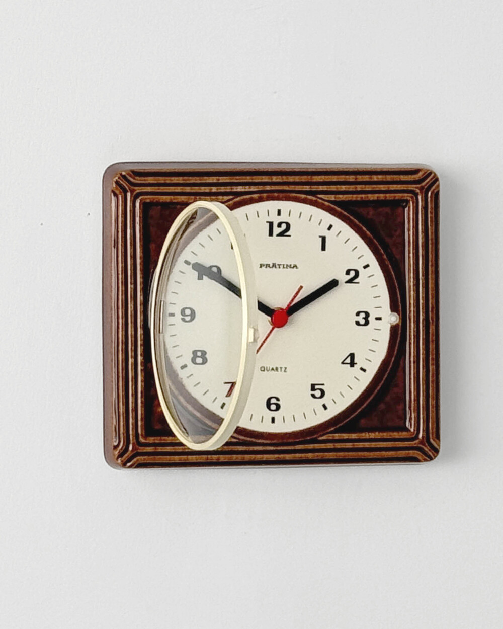 브라운 유광 세라믹 바디와 단정한 직사각 프레임, 절제된 라인 디테일이 어우러진 1980년대 독일 PRÄTINA 벽시계입니다. 전면 도어가 오픈되는 구조로 실용성을 갖추었으며, 전체적으로 클래식한 분위기와 안정된 컨디션을 보여줍니다.