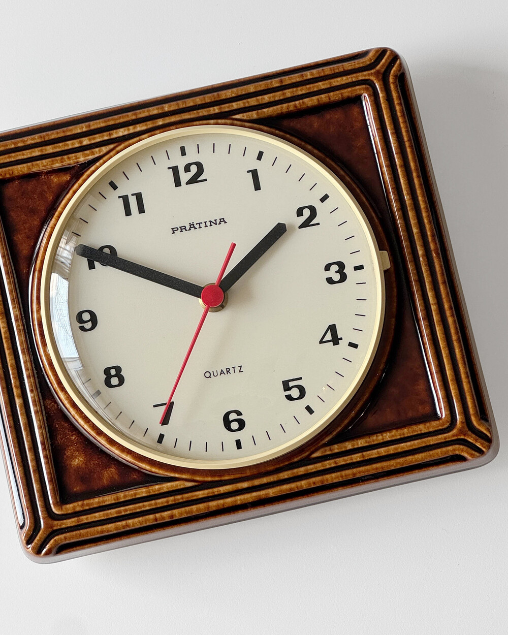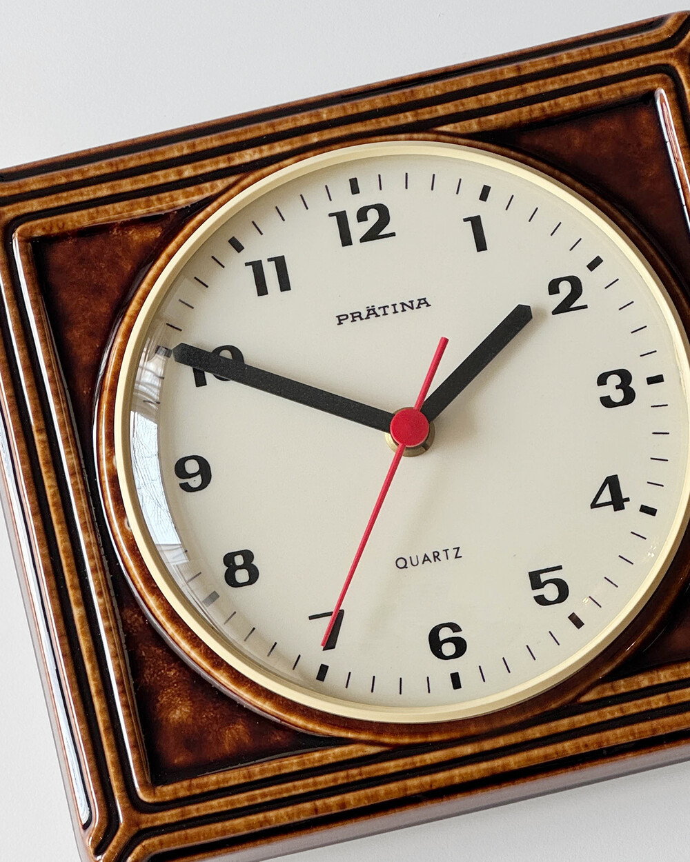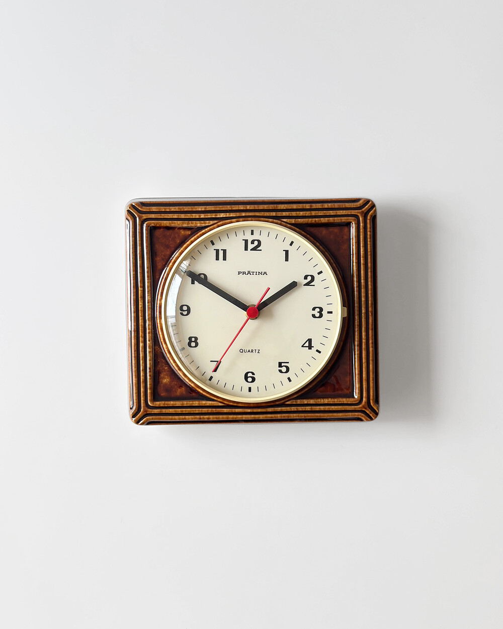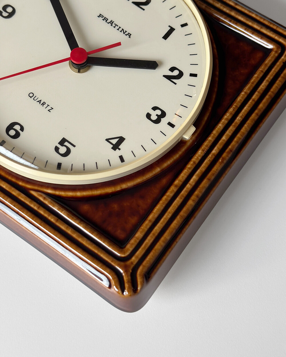 브라운 유광 세라믹 바디와 단정한 직사각 프레임, 절제된 라인 디테일이 어우러진 1980년대 독일 PRÄTINA 벽시계입니다. 전면 도어가 오픈되는 구조로 실용성을 갖추었으며, 전체적으로 클래식한 분위기와 안정된 컨디션을 보여줍니다.