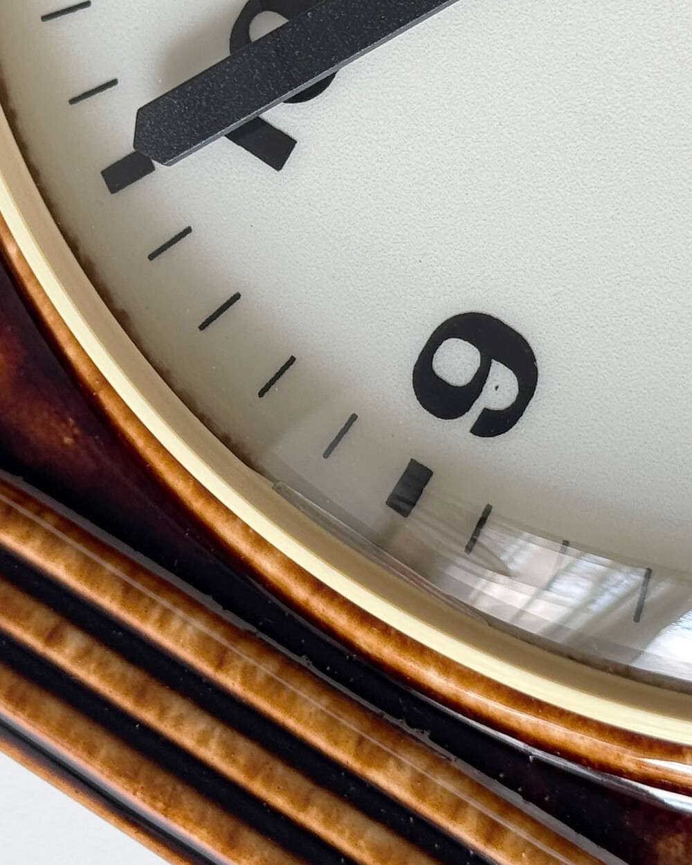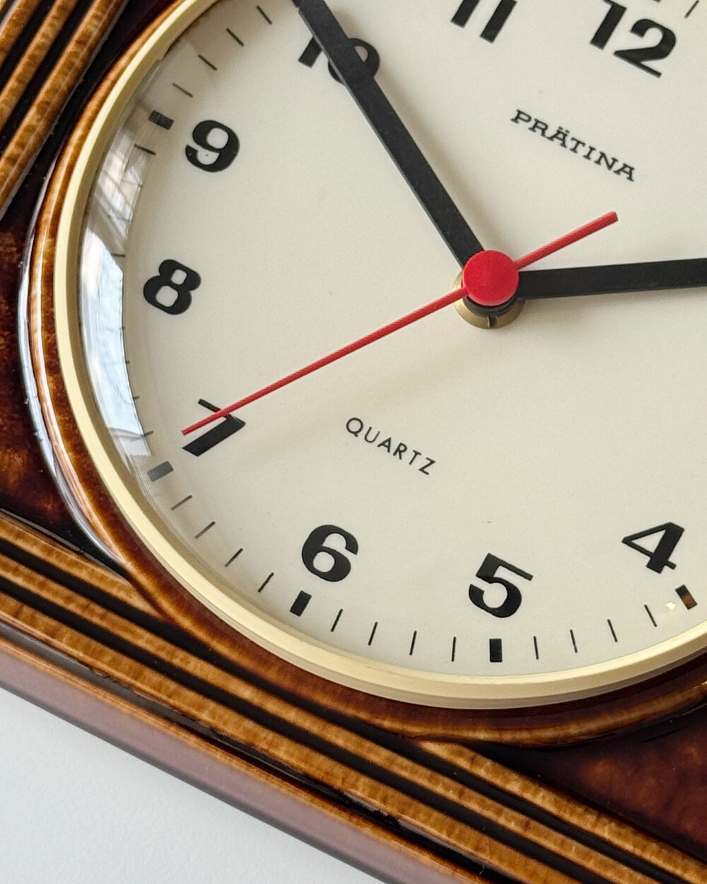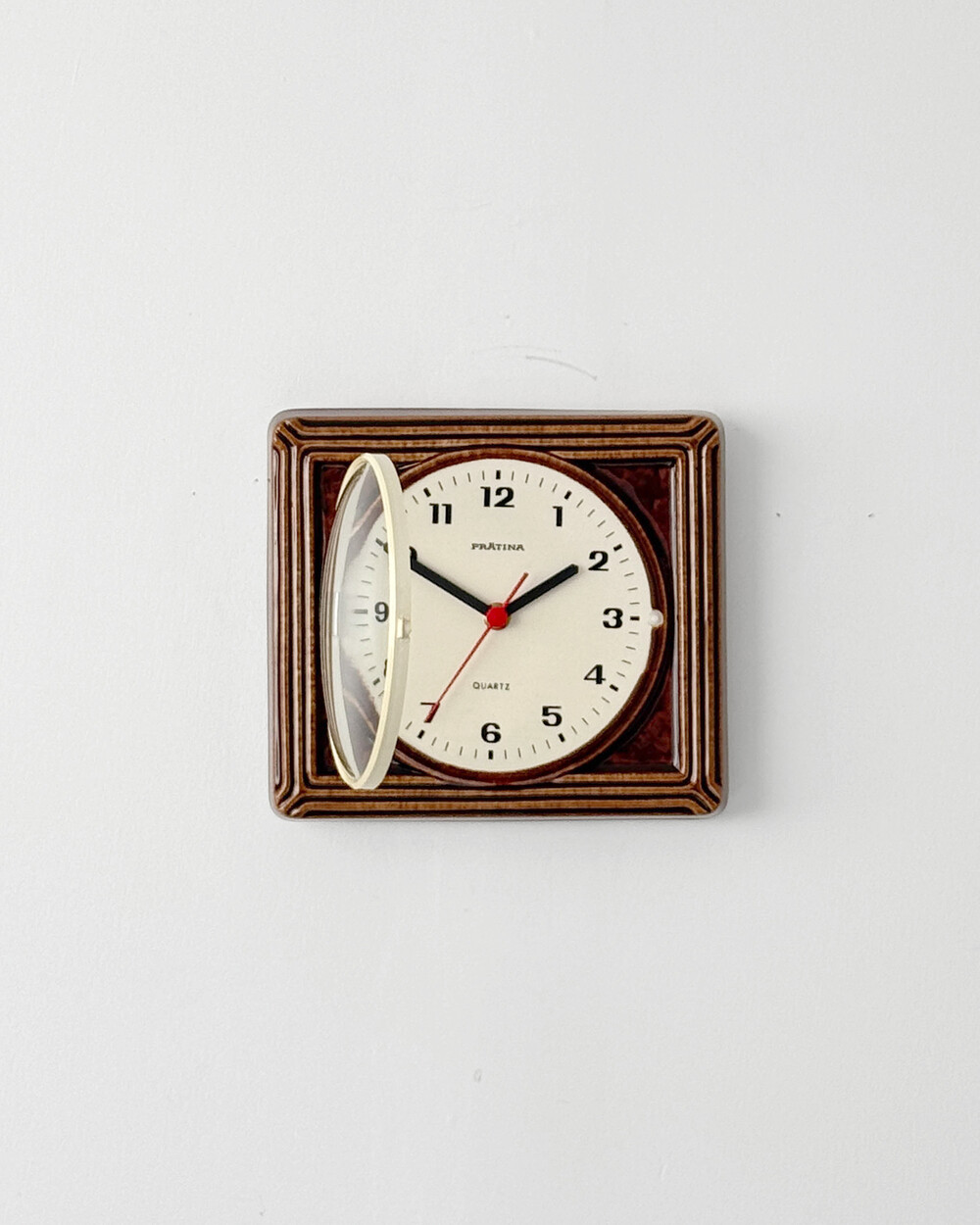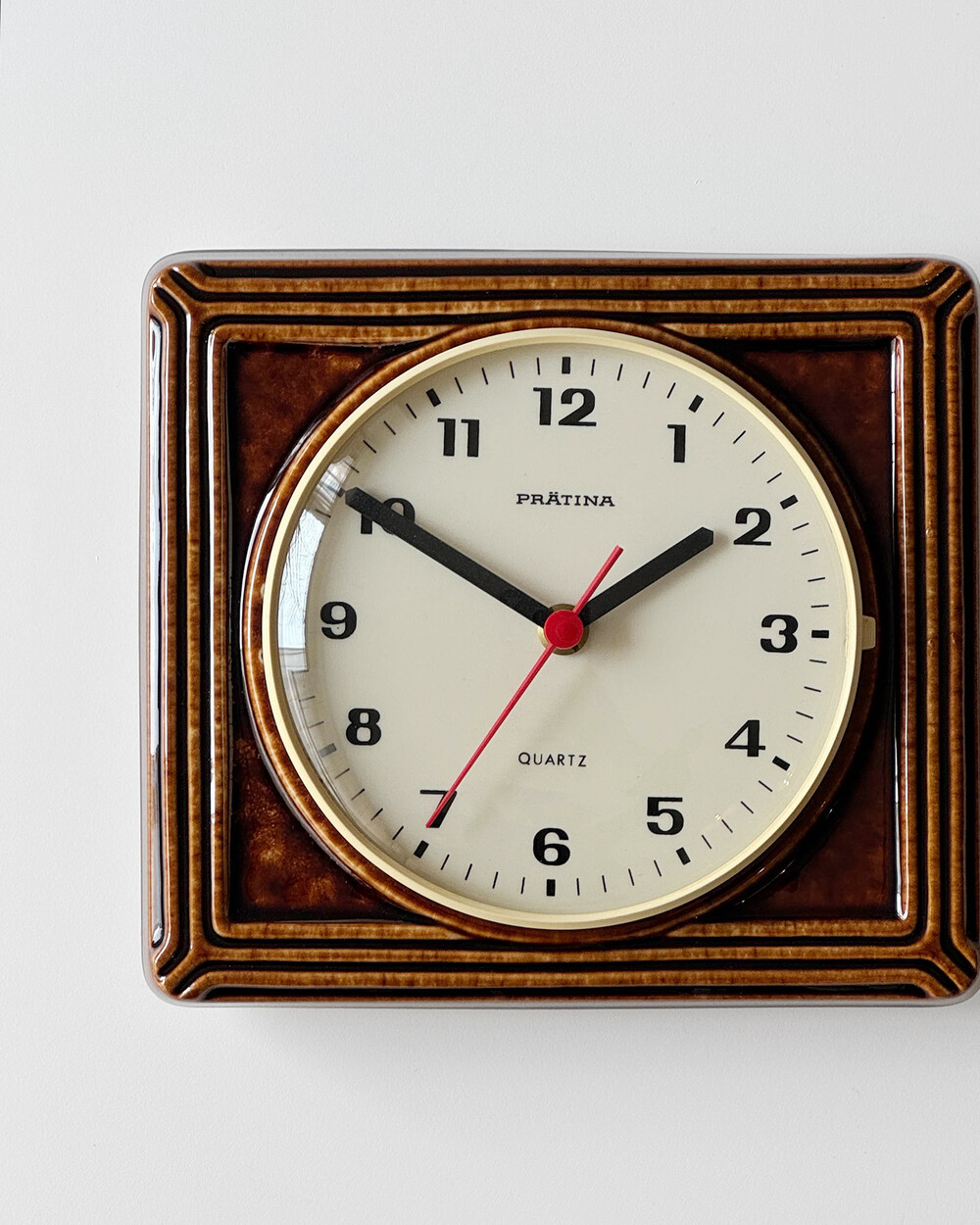 브라운 유광 세라믹 바디와 단정한 직사각 프레임, 절제된 라인 디테일이 어우러진 1980년대 독일 PRÄTINA 벽시계입니다. 전면 도어가 오픈되는 구조로 실용성을 갖추었으며, 전체적으로 클래식한 분위기와 안정된 컨디션을 보여줍니다.