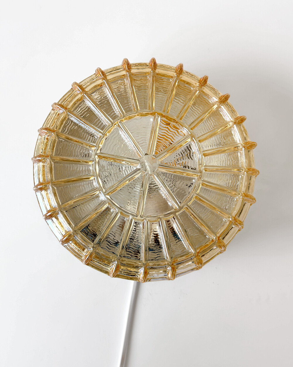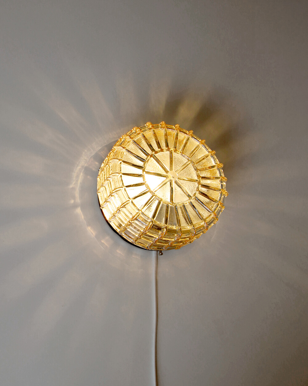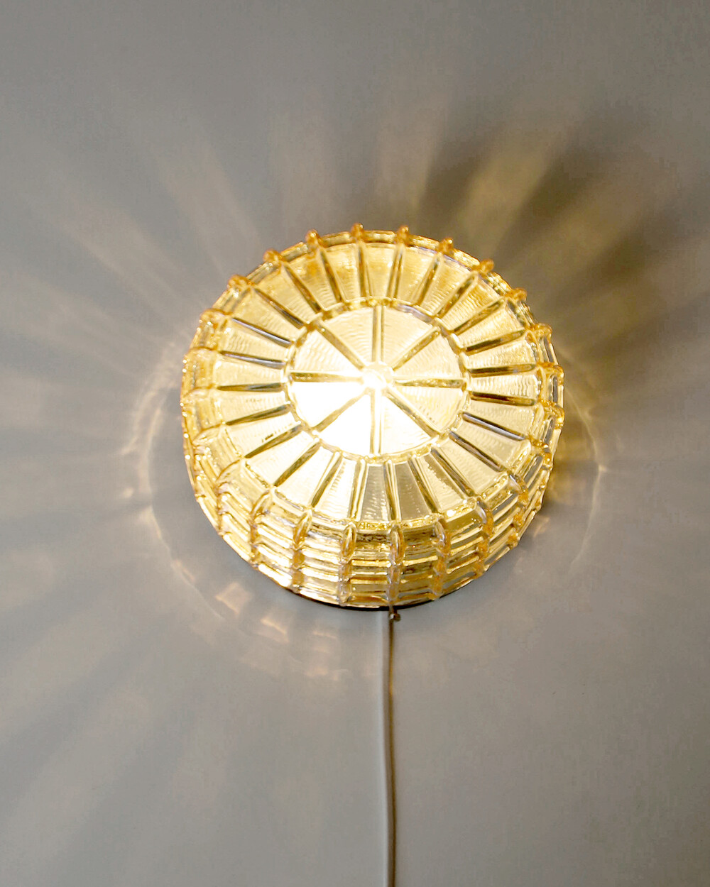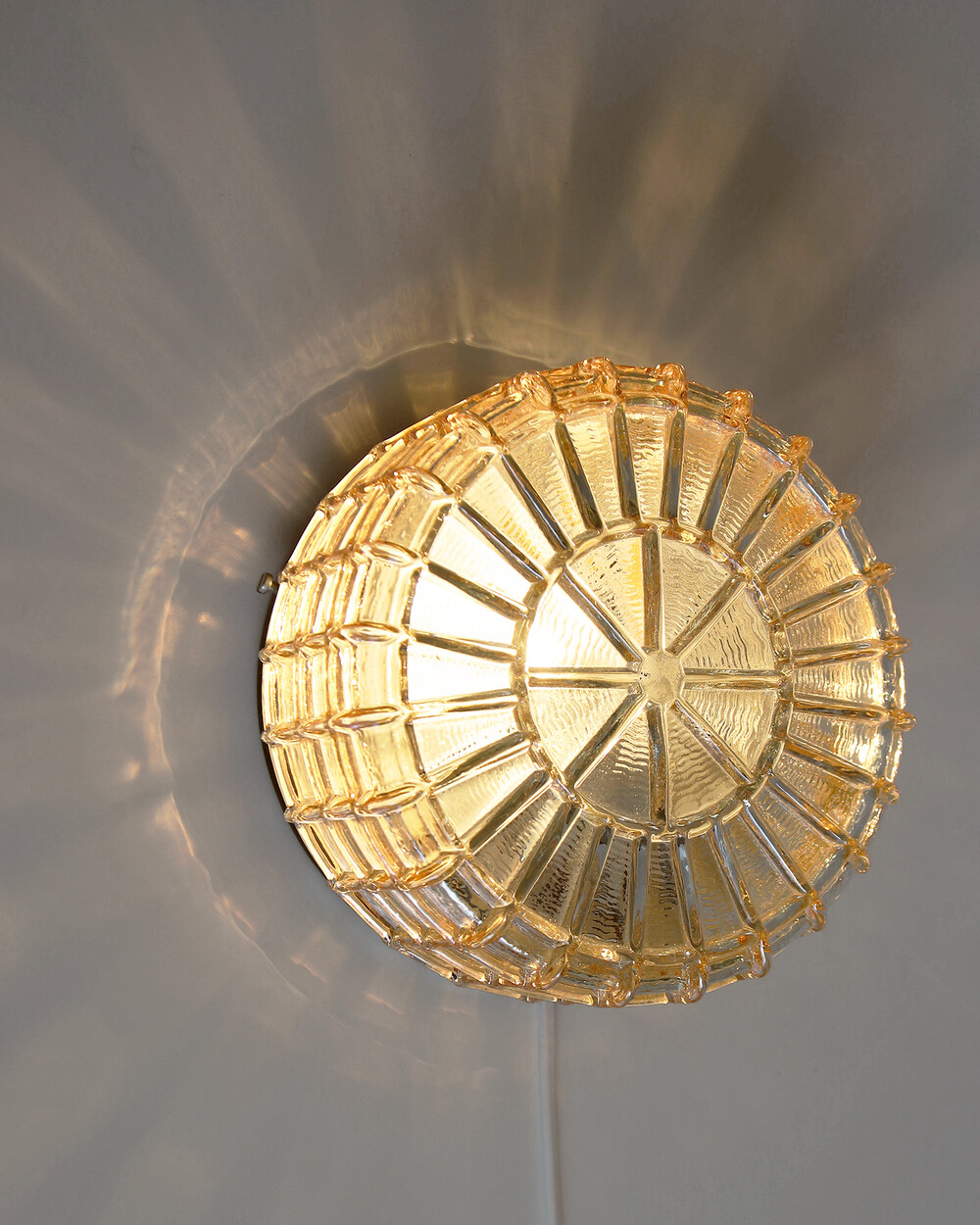 투명한 크리스탈 글라스 위에 엠버 컬러와 방사형 격자 패턴이 더해진 월마운트 램프입니다. 1970년대 서독의 조명회사 Kramer Leuchten에서 제작되었습니다. 점등 시 벽면으로 입체적인 빛 그림자가 드러나며, 벽면 또는 천장에 고정해 사용하거나 테이블 조명으로도 활용할 수 있습니다.