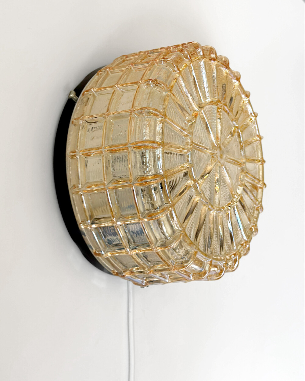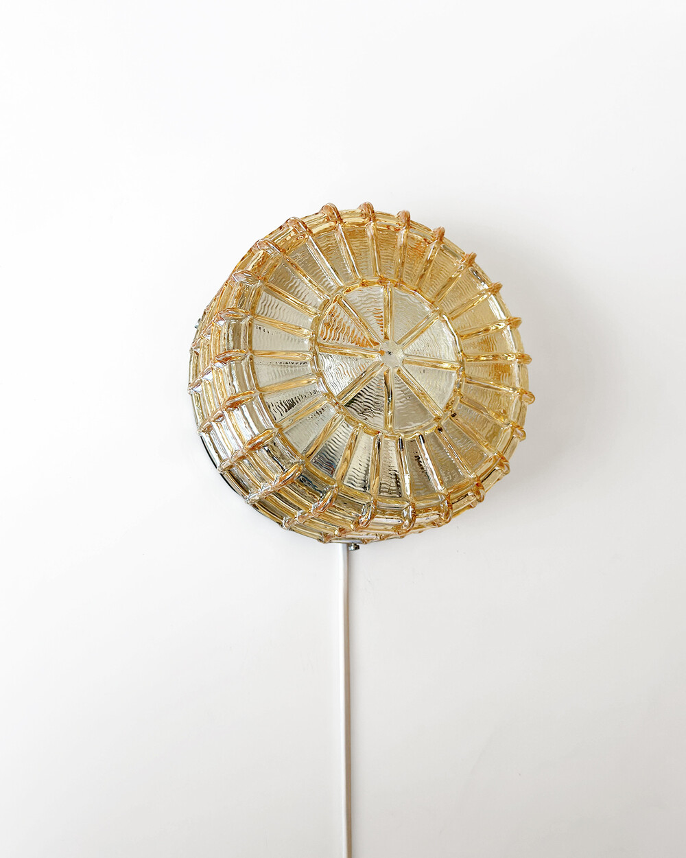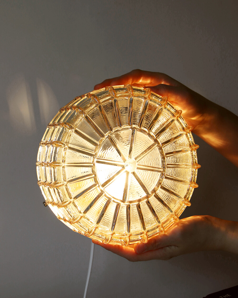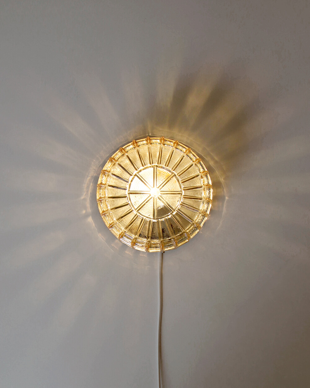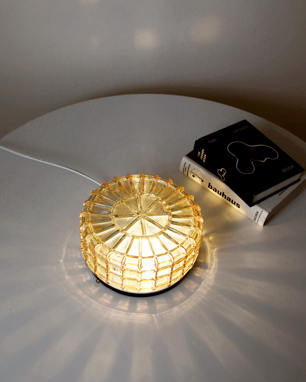투명한 크리스탈 글라스 위에 엠버 컬러와 방사형 격자 패턴이 더해진 월마운트 램프입니다. 1970년대 서독의 조명회사 Kramer Leuchten에서 제작되었습니다. 점등 시 벽면으로 입체적인 빛 그림자가 드러나며, 벽면 또는 천장에 고정해 사용하거나 테이블 조명으로도 활용할 수 있습니다.