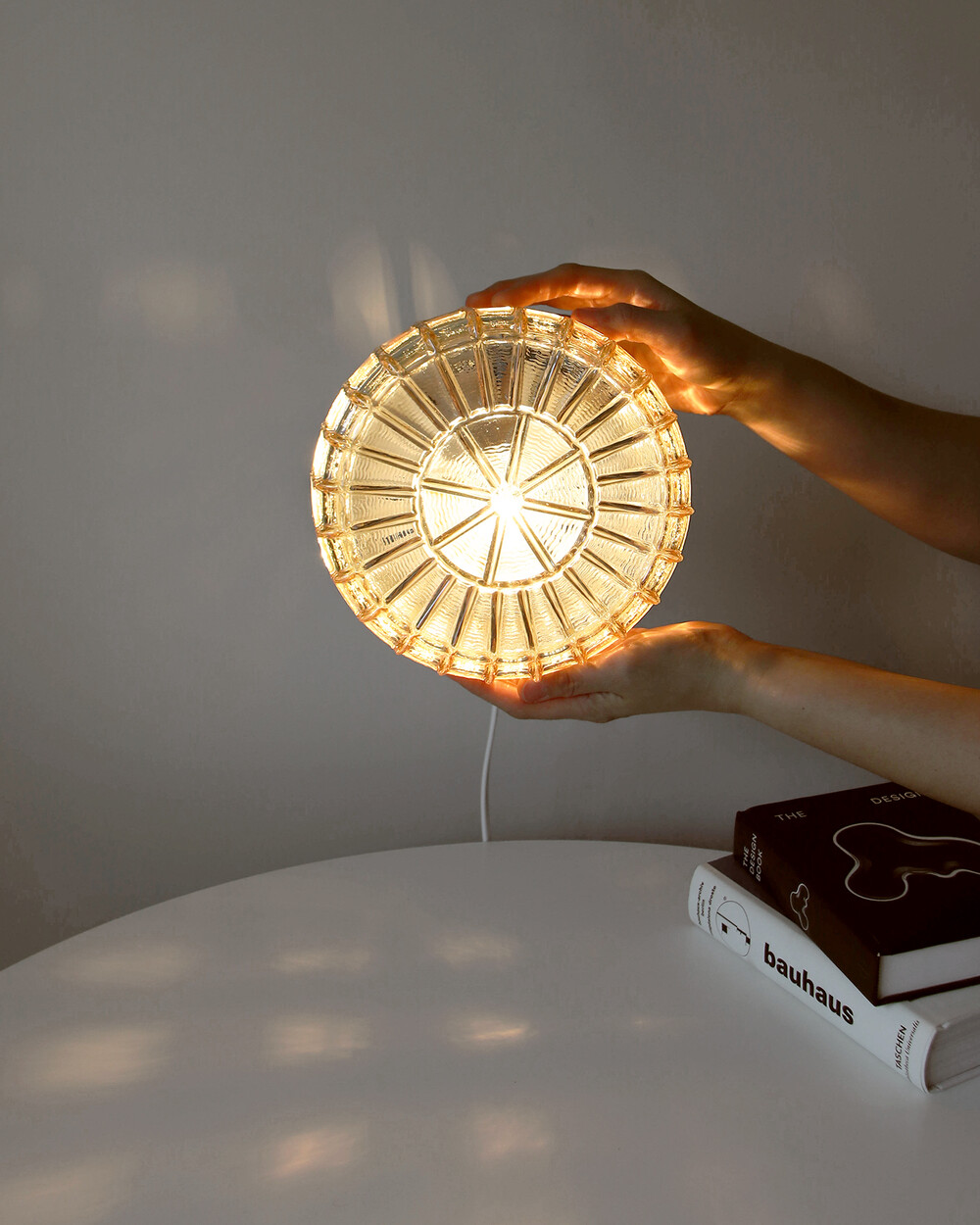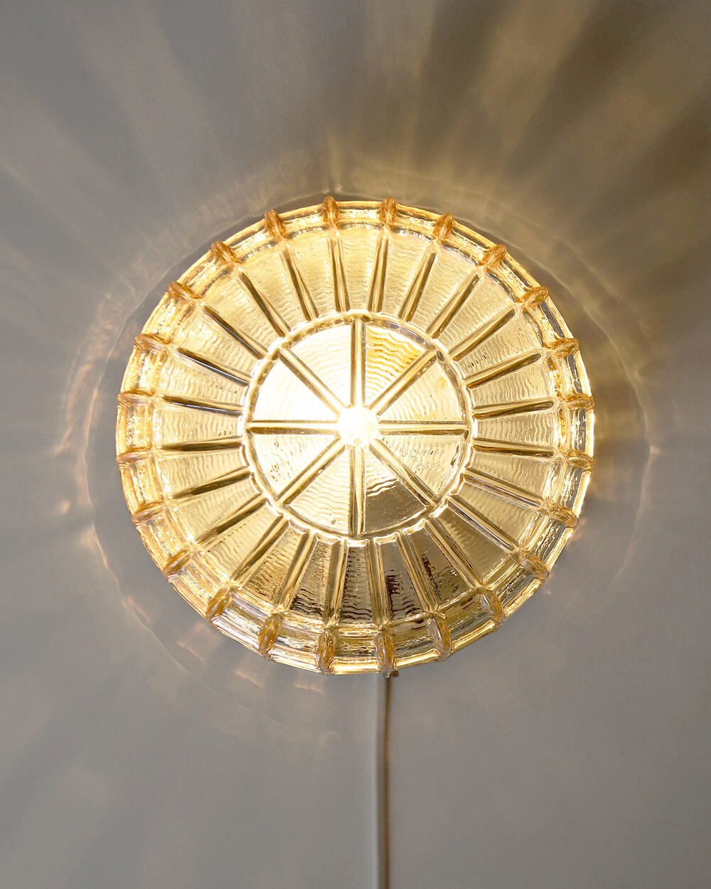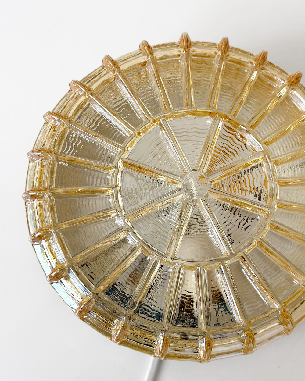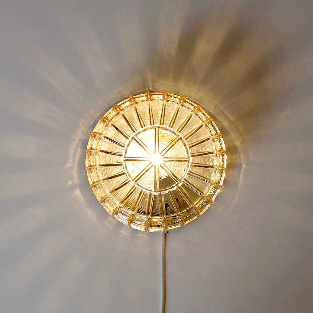 투명한 크리스탈 글라스 위에 엠버 컬러와 방사형 격자 패턴이 더해진 월마운트 램프입니다. 1970년대 서독의 조명회사 Kramer Leuchten에서 제작되었습니다. 점등 시 벽면으로 입체적인 빛 그림자가 드러나며, 벽면 또는 천장에 고정해 사용하거나 테이블 조명으로도 활용할 수 있습니다.