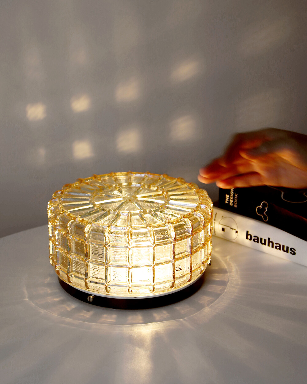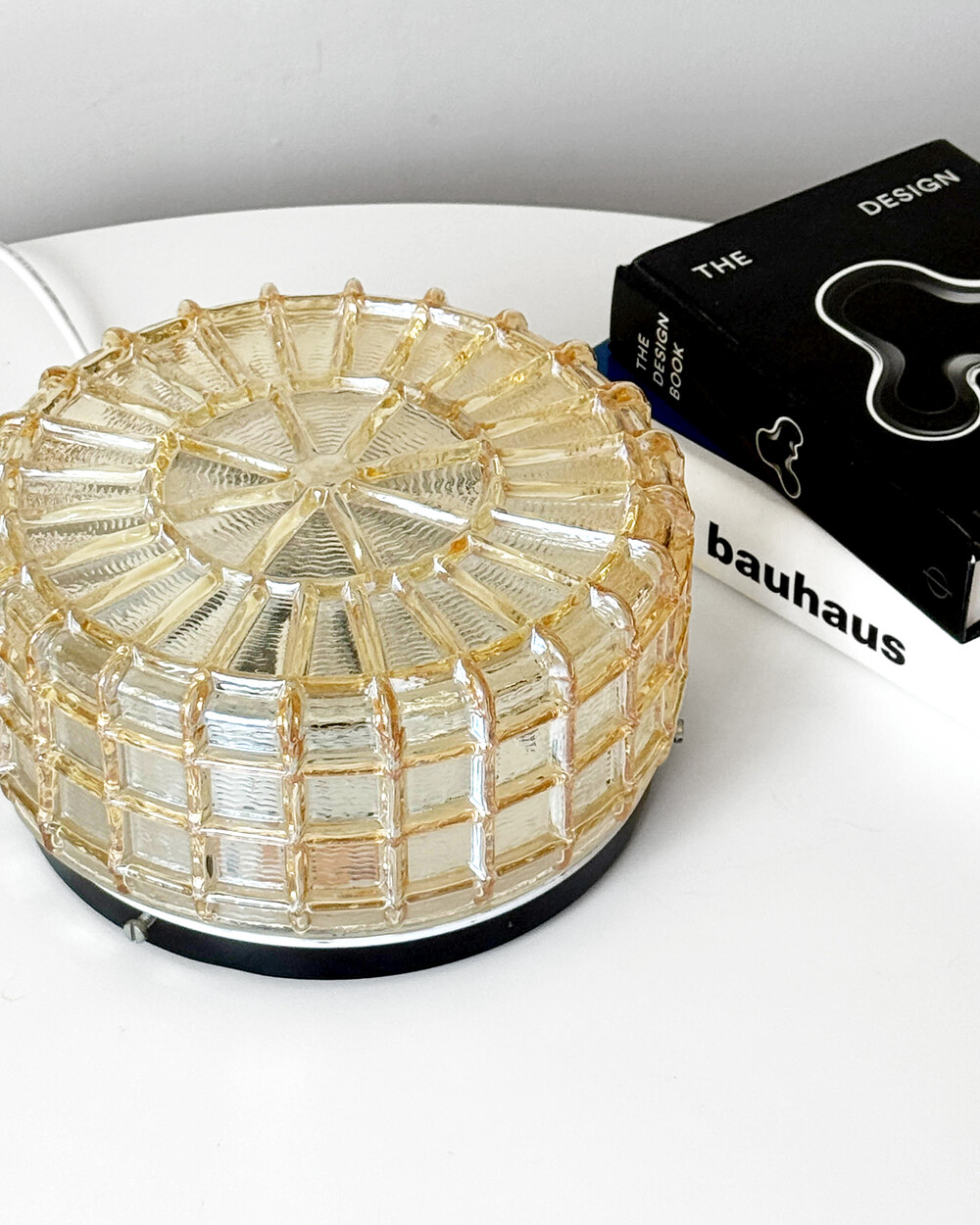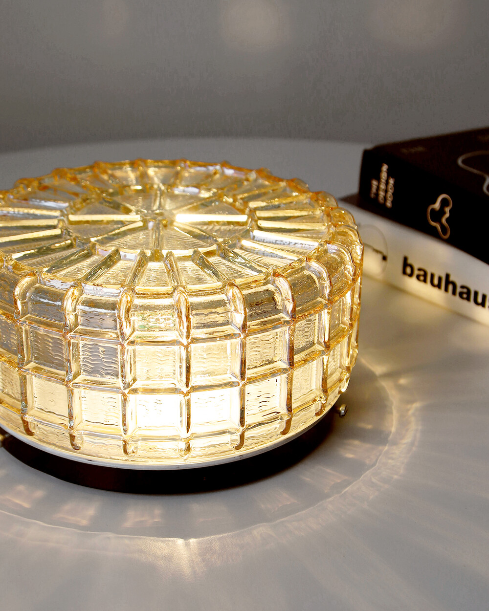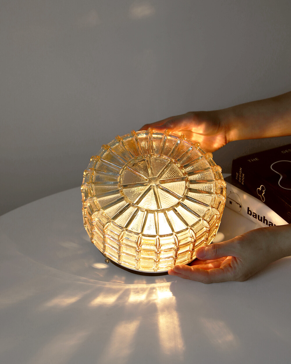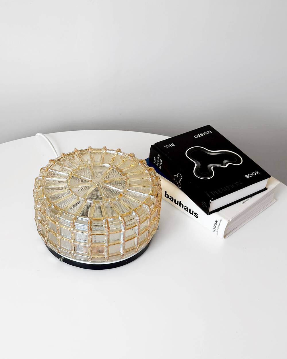 투명한 크리스탈 글라스 위에 엠버 컬러와 방사형 격자 패턴이 더해진 월마운트 램프입니다. 1970년대 서독의 조명회사 Kramer Leuchten에서 제작되었습니다. 점등 시 벽면으로 입체적인 빛 그림자가 드러나며, 벽면 또는 천장에 고정해 사용하거나 테이블 조명으로도 활용할 수 있습니다.
