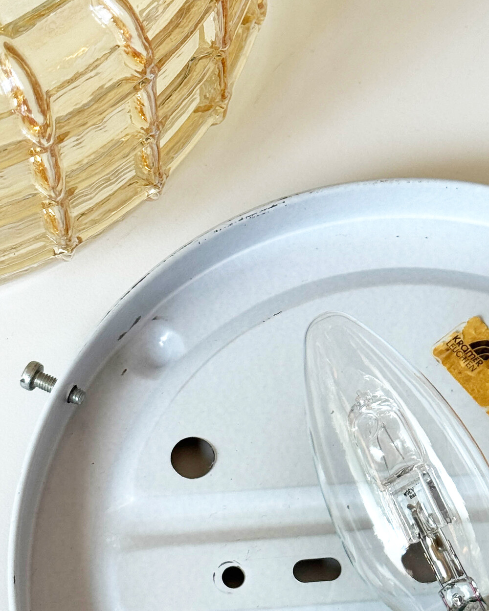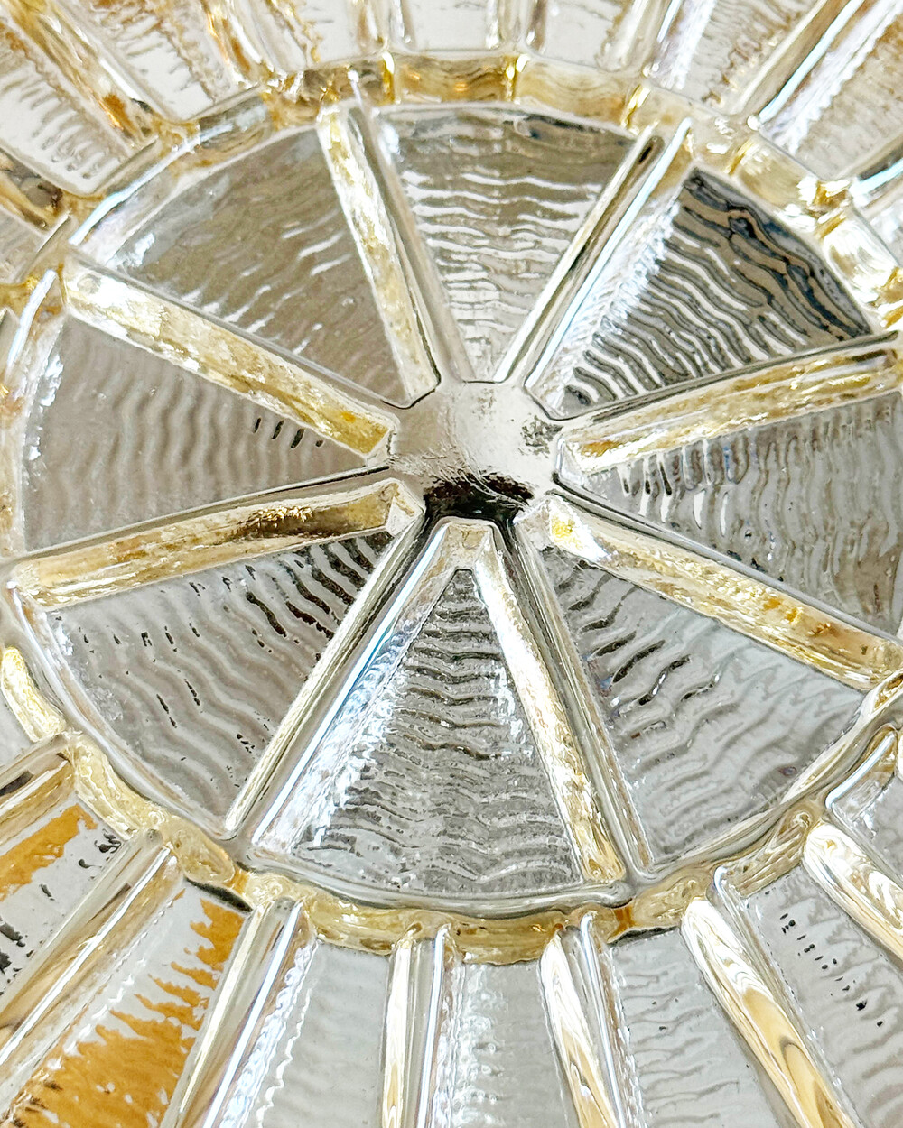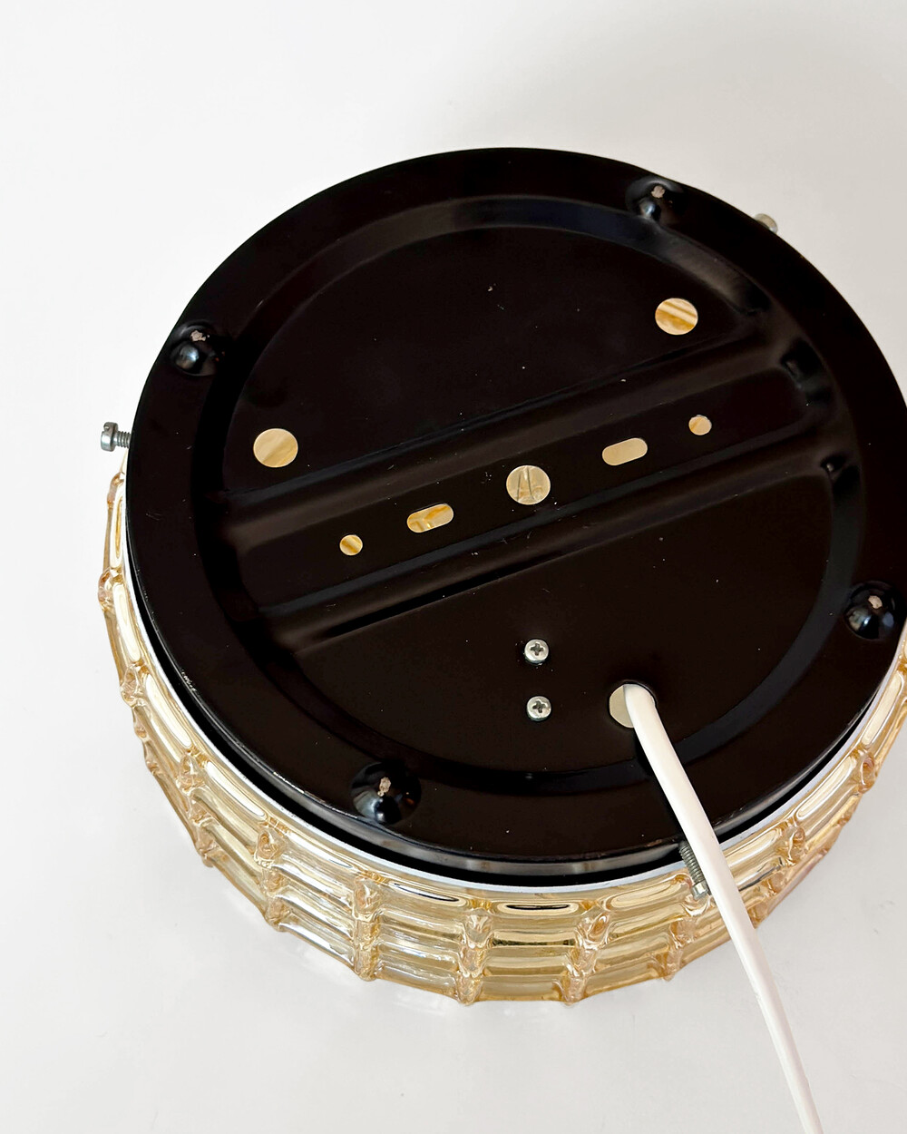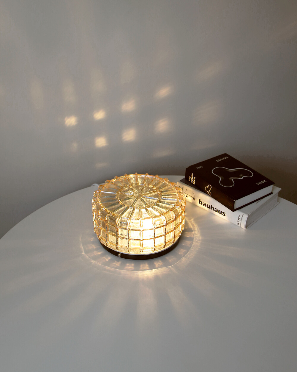 투명한 크리스탈 글라스 위에 엠버 컬러와 방사형 격자 패턴이 더해진 월마운트 램프입니다. 1970년대 서독의 조명회사 Kramer Leuchten에서 제작되었습니다. 점등 시 벽면으로 입체적인 빛 그림자가 드러나며, 벽면 또는 천장에 고정해 사용하거나 테이블 조명으로도 활용할 수 있습니다.